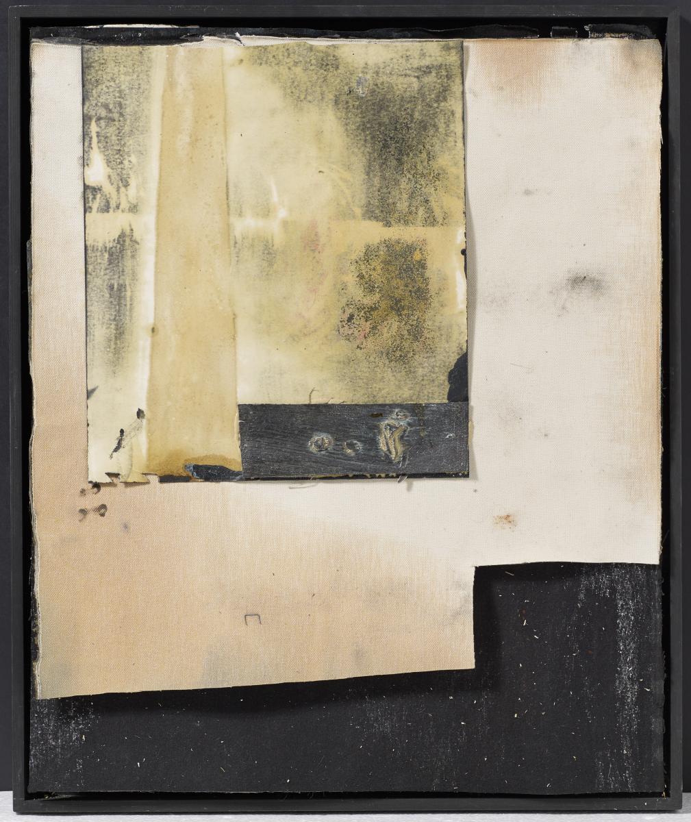 Technik: Mischtechnik, Collage auf Leinwand und Stoff, auf Holz aufgezogen.