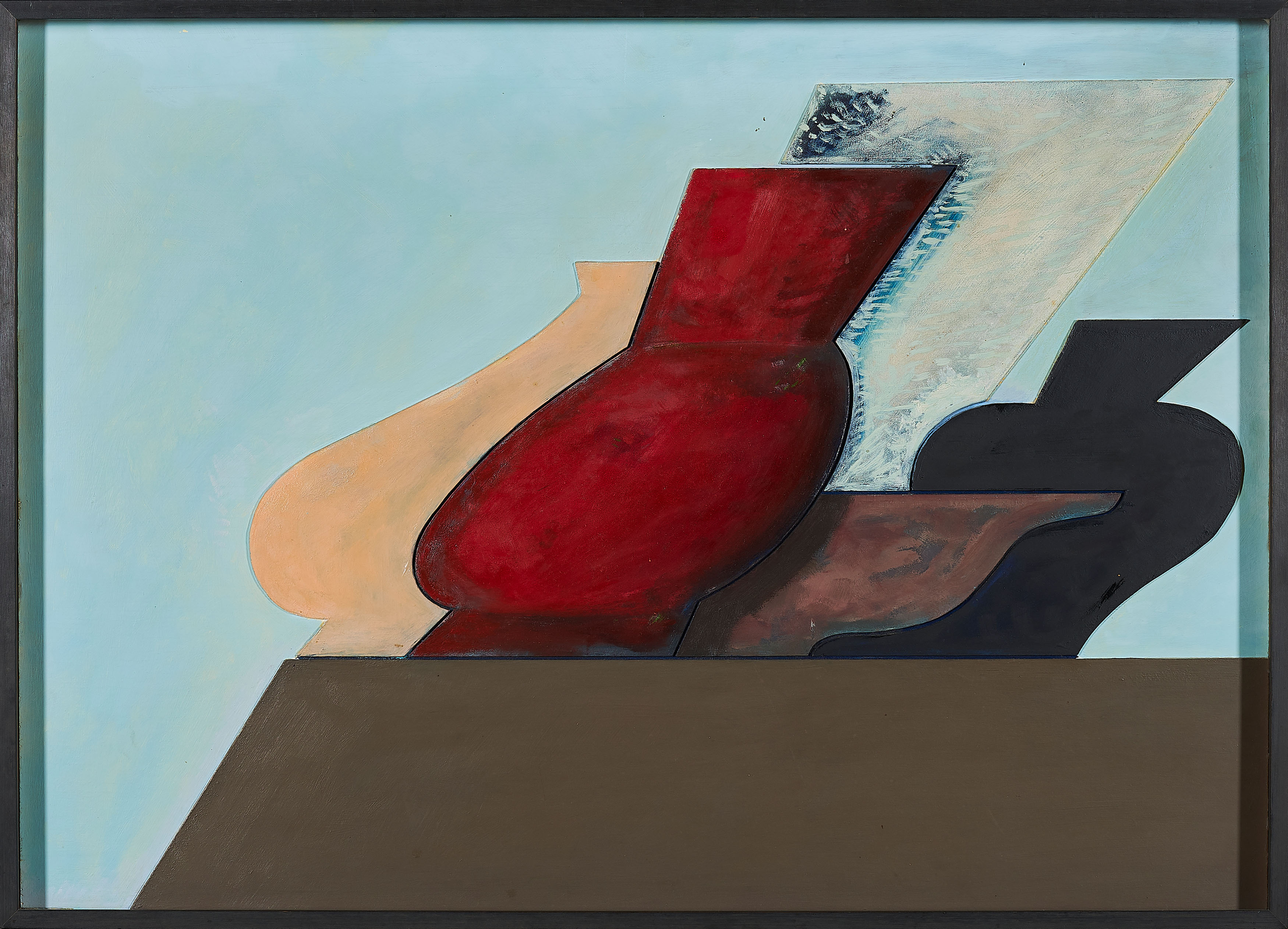 Minimale Verschmutzungen. Kleine Farbabplatzung im oberen Eckbereich. Punktuell leichte Verschmutzungen im unteren Bereich der rosefarbenen Form und oberhalb der roten Form. Ansonsten sehr guter Zustand. Im Rahmen beschrieben.