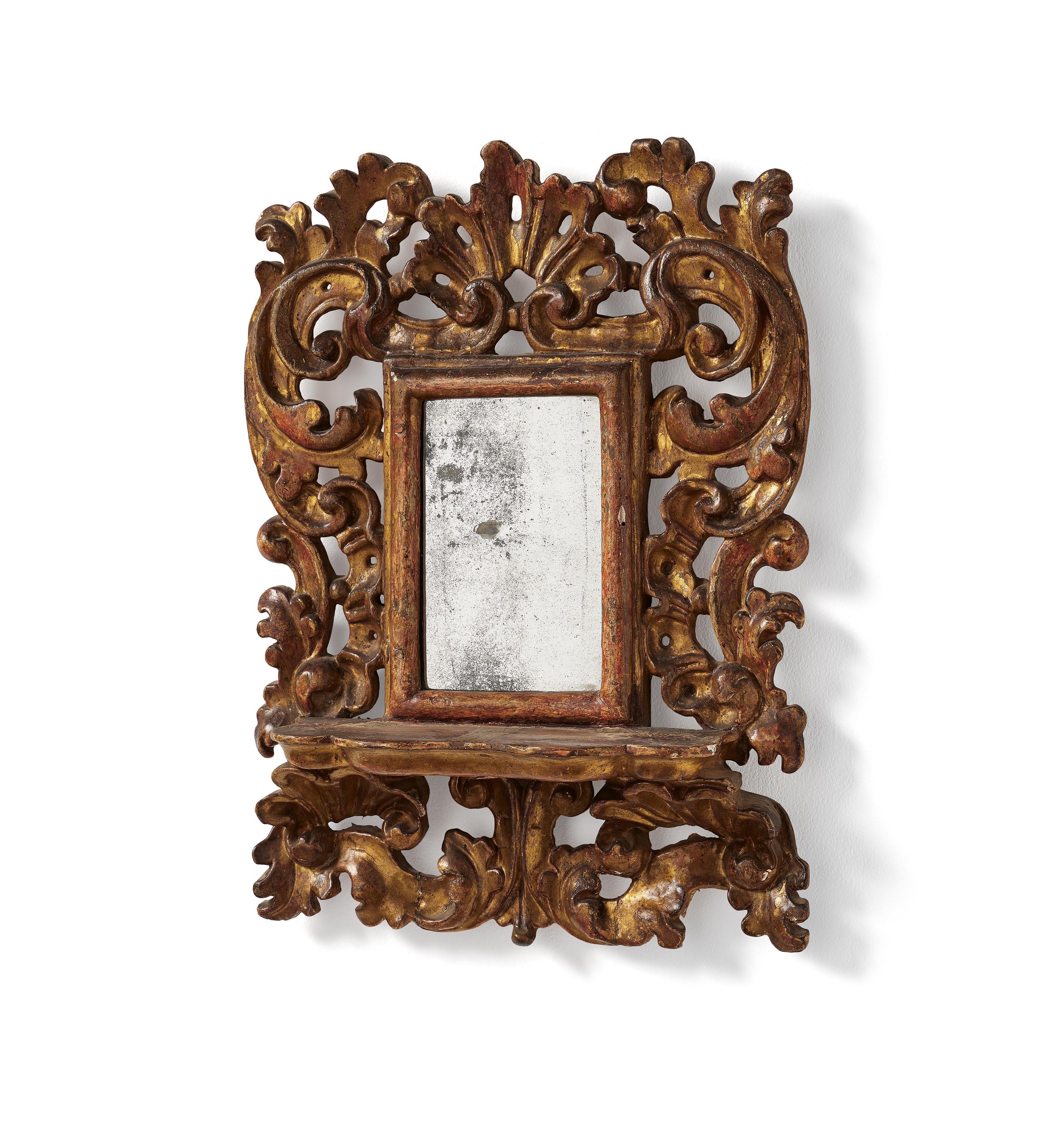 KLEINER SPIEGEL MIT ROCAILLEN UND ABLAGE.