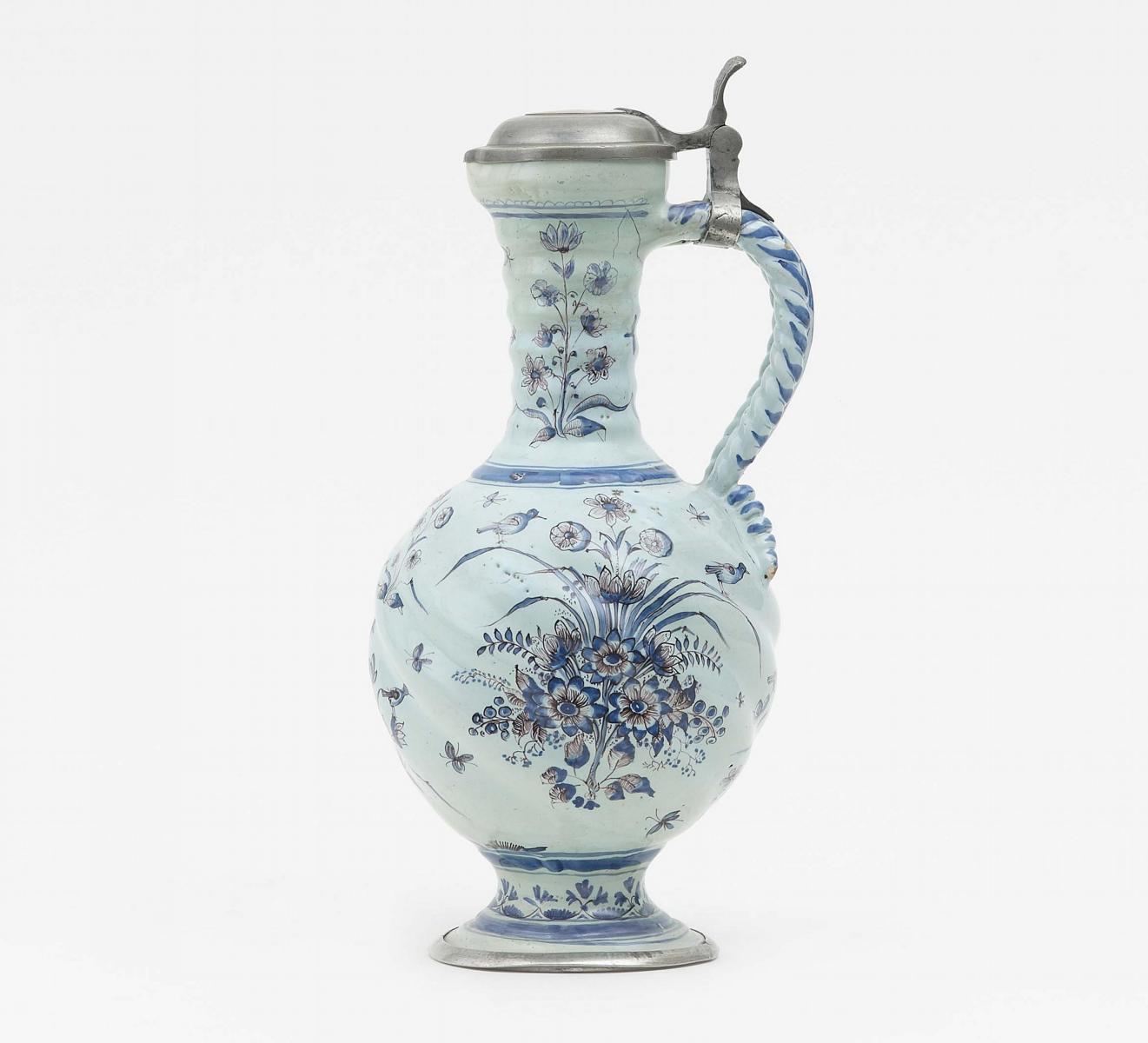 Rötlicher Scherben, weiß glasiert, blaues Dekor. Zinnmontierung. H.32 cm. Ohne MarkeZustand C.