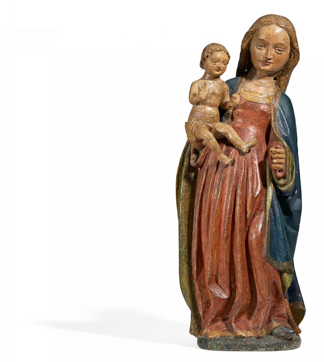 Standfigur, vollrund geschnitzt. Weichholz, polychrom gefasst. Ursprüngliche Fassung