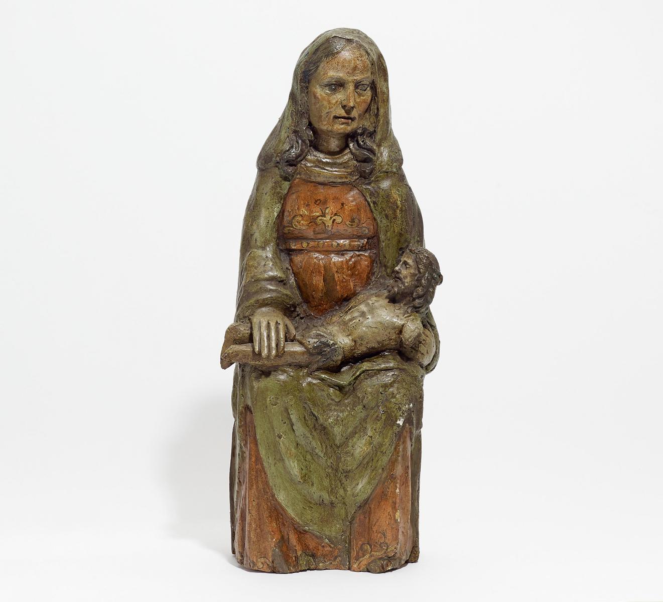 Technik: Weichholz, farbig gefasst. Fassung übergangen. Maße: 63cm.