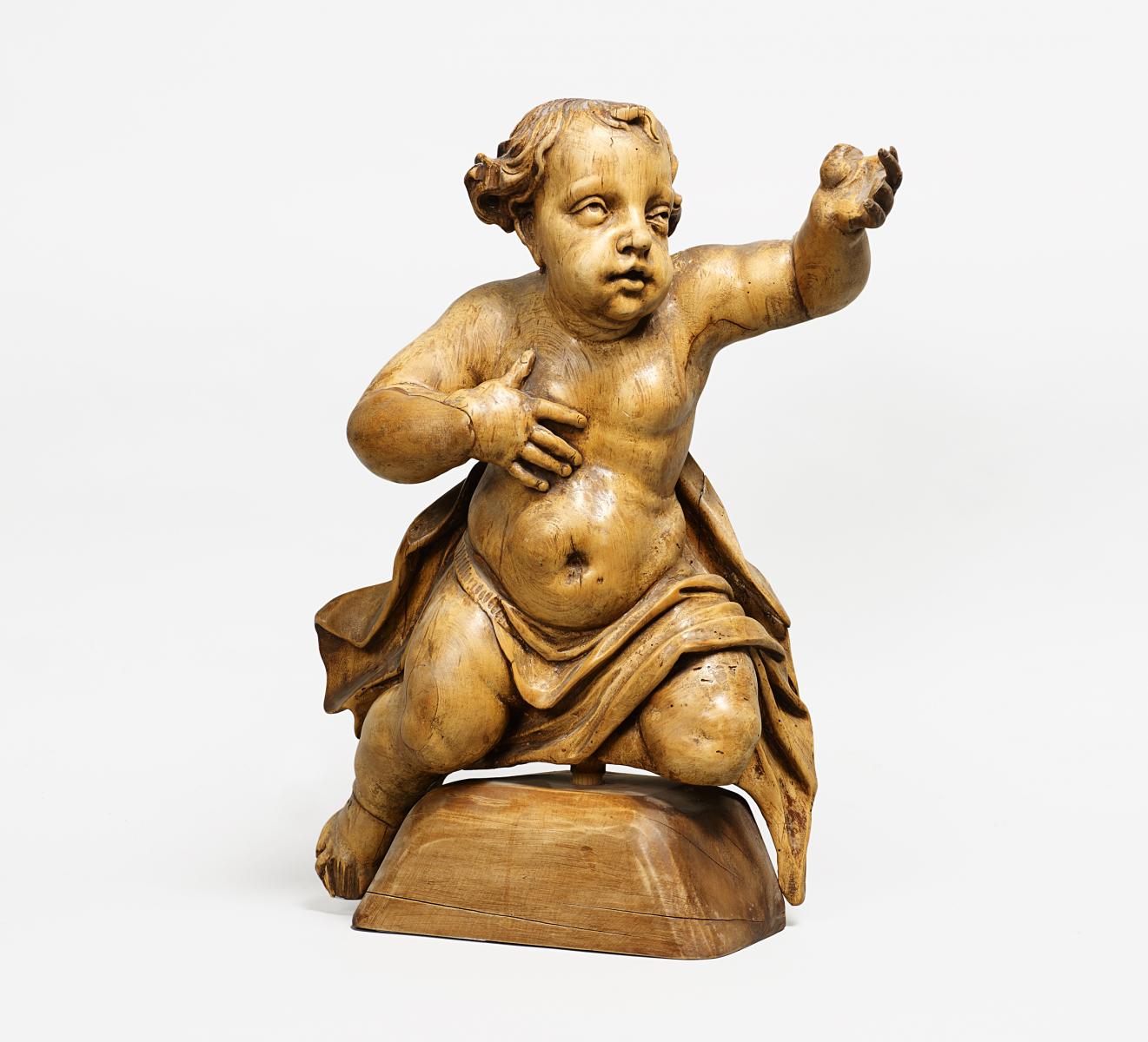 Putto. Fassung abgelaugt. Finger beschädigt. Weichholz. Höhe: 56cm.