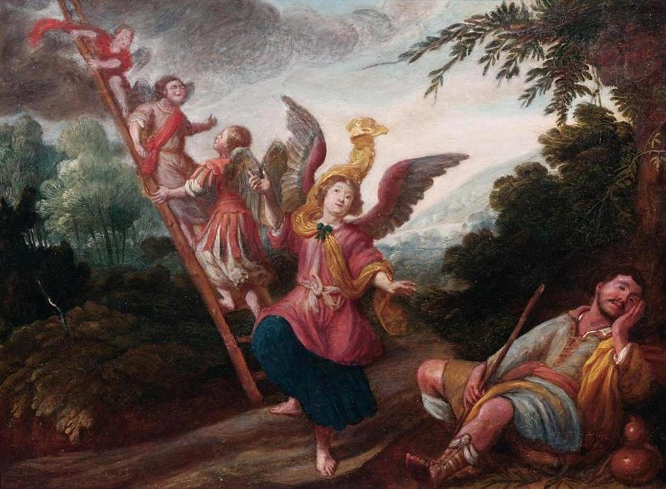 Jacob und die Himmelsleiter. Öl auf Holz. Parkettiert. 41,5 x 56cm. Rahmen.