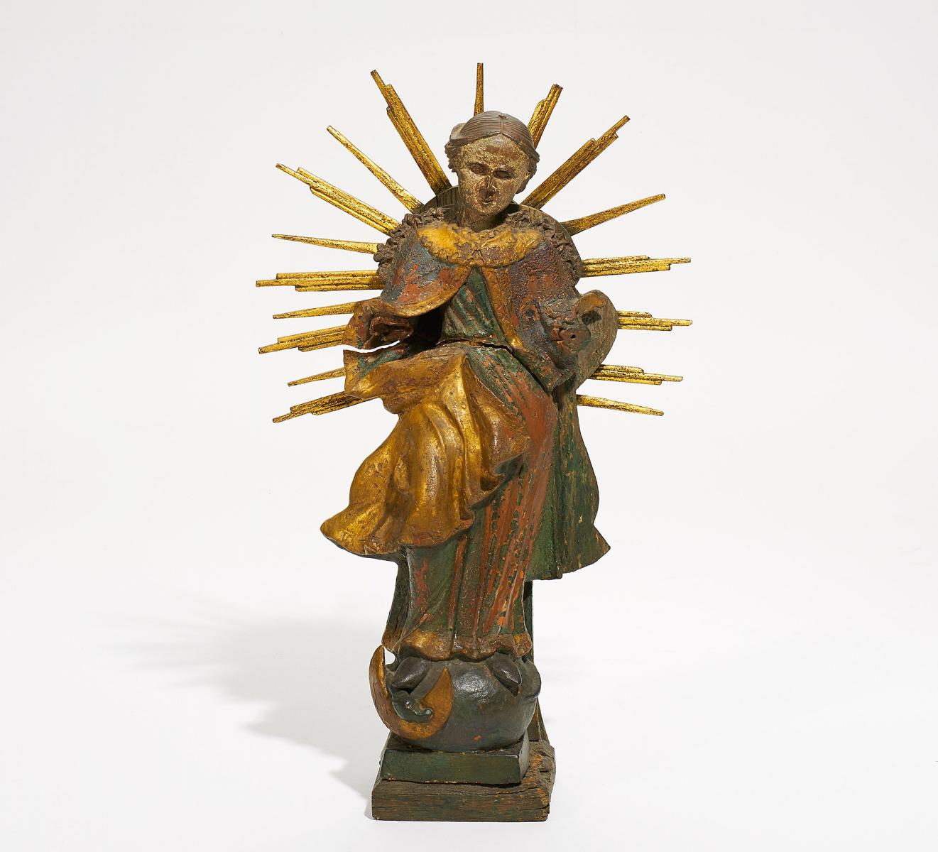 Farbig gefasst. Stark beschädigt.