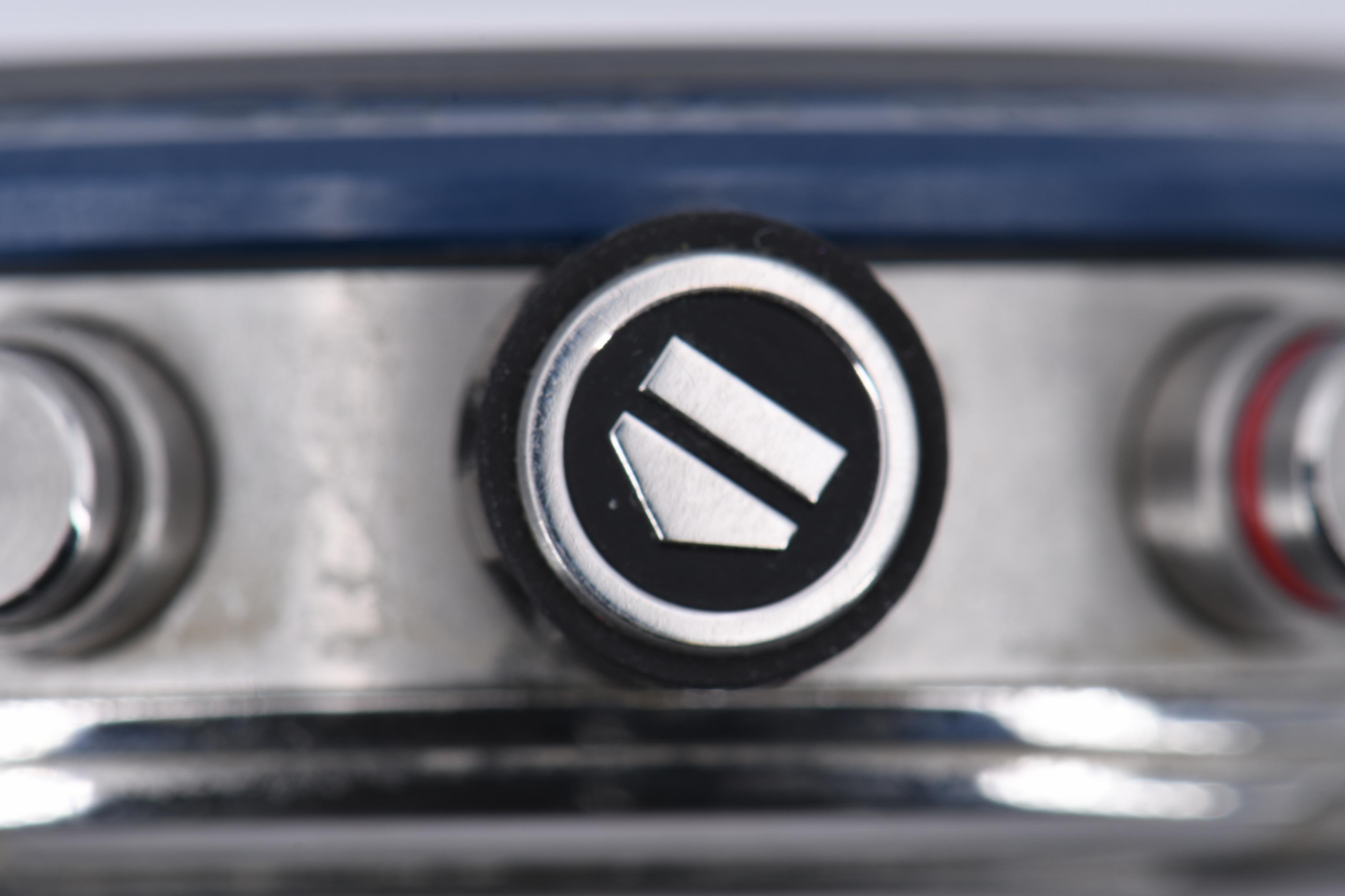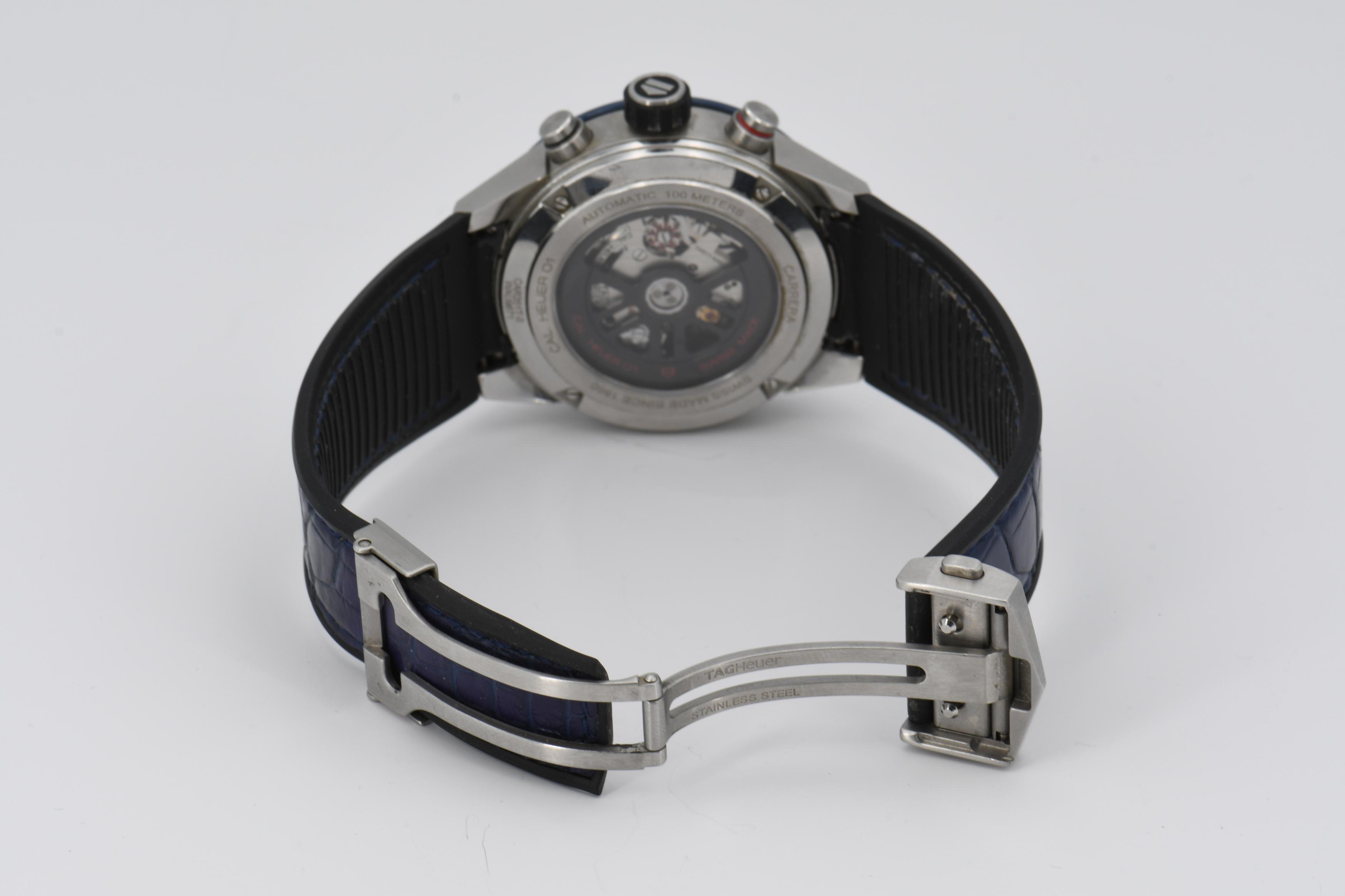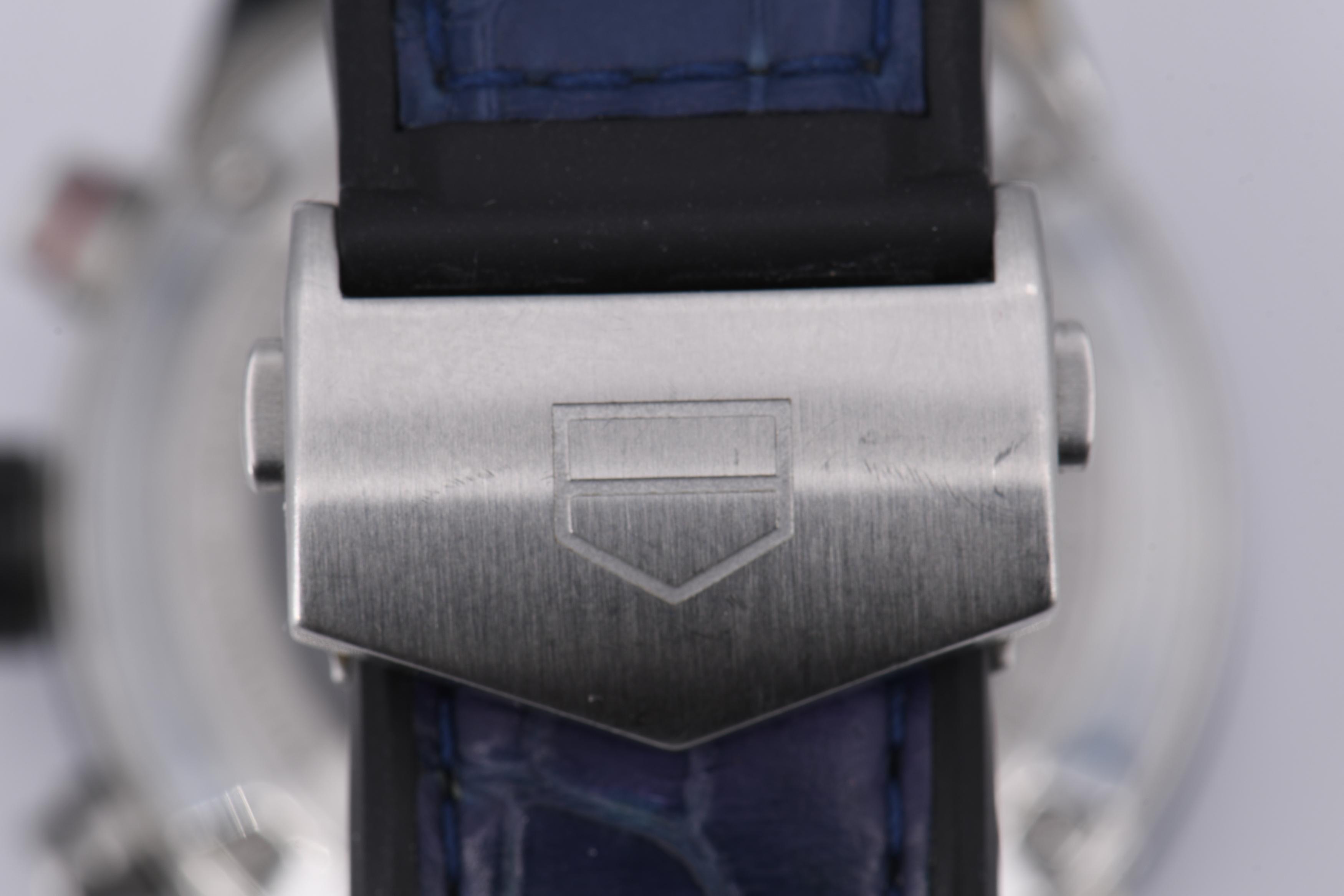 Gehäuse/Armband: Stahl, orig.-Armband mit orig.-Schließe, Zffbl. blau/silbern skeletiert, Zeiger/Indizes silbern/fluoreszierend.