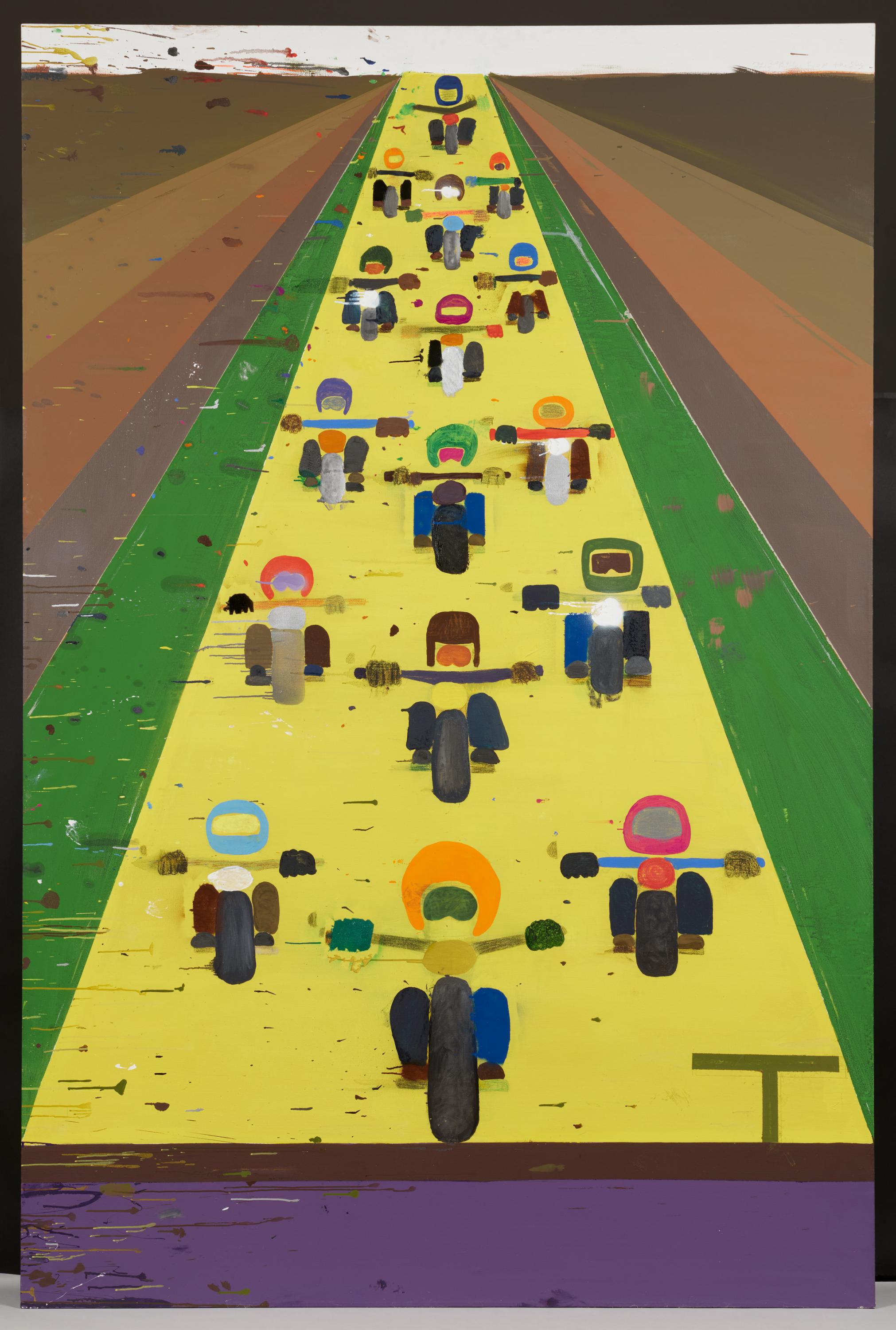 Um das Ausgangsmaterial für seine Motive zu finden, lotet er Mythologie und Fotografien aus. Er selbst nennt seine Bildfindungen "Kolbojnik", welches aus dem Hebräischen stammt und etwa soviel bedeutet wie "Reste". Seine Motive reichen von Schaufenstern aus dem Rotlichtviertel bis hin zu verdrehten menschlichen Figuren, eingesperrten Tieren oder abstrahierten Gegenständen. Wie auch beim Betrachten des Gemäldes "Riders from the Sky", lässt er die Grenzen zwischen Figur und Grund verschwimmen. Weite Teile seiner Gemälde sehen oft auf den ersten Blick wie geometrische Muster aus und erst auf den zweiten Blick wird der narrative Aspekt im Bild sichtbar. Er bedient sich bewusst schon bekannter Dinge und schafft eine Welt, die sich der Wirklichkeit entzieht, indem sie bereits Bekanntes neu miteinander kombiniert. Seine überschwängliche, kontrastreiche und plakative Farbpalette verstärkt diesen Eindruck. "Riders from the Sky" legt Tal R als gewaltiges Hochformat an. Durch die starken Kontraste und der zentralperspektivisch angelegten Straße gen Himmel erreicht er eine ganz außergewöhnliche Sogwirkung. Zunächst scheinen wir die Komposition zu überblicken, jedoch gesellt sich eine beängstigende Frage hinzu: weshalb kommen die "Riders" aus dem Himmel? In einer weiteren Version des Motivs mit dem Titel "Riders in the Sky" aus dem Jahr 2002 (vgl. Abb. 1) ergänzt Tal R Grabsteine am Rande einer Straße, die scheinbar durch einen Wald führt. Durch die schrill-bunte Farbwahl nimmt er der gesamten Szenerie zunächst den Schrecken und wir können uns erst auf den zweiten Blick ausmalen, aus welchem Grund die Motorradfahrer die hiesige Welt über eine Art Regenbogenstraße betreten bzw. verlassen.
