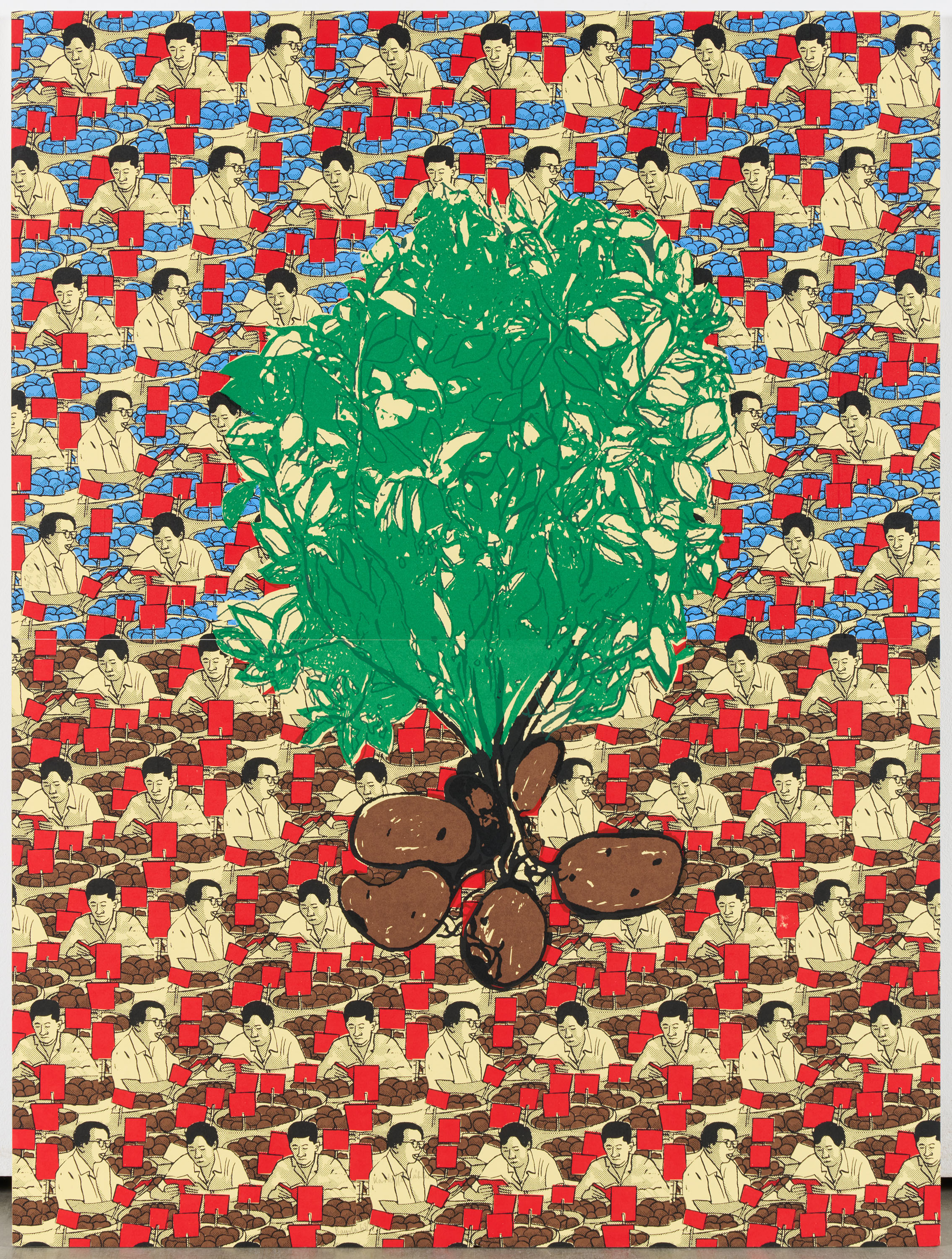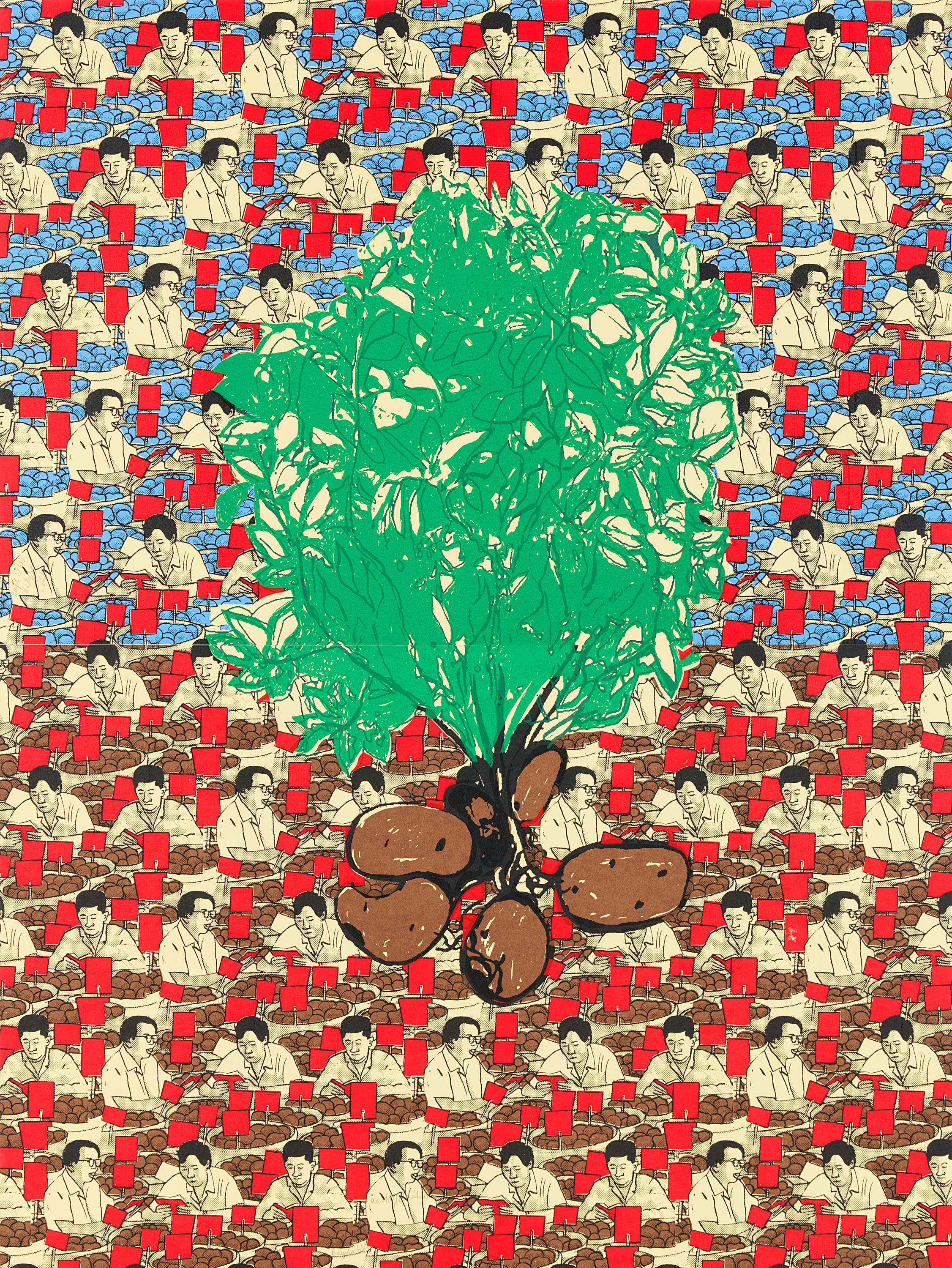 Thomas Bayrle entdeckt das Motiv der Kartoffel zählenden Männer in der vorliegenden Serigrafie in der übersetzten chinesischen Propagandazeitschrift "China heute". Diese Publikation setzt sich mit den Ideen der politischen Strömung des Maoismus auseinander und behandelt unter anderem die Fragestellung zur Möglichkeit einer Sicherung von Nahrung in einer stetig wachsenden Bevölkerung. In diesem Diskurs wird die Kartoffelpflanze als möglicher Vorschlag erörtert. Die Arbeit zeigt im Hintergrund drei unterschiedliche Kartoffelzähler, die in einem endlosen Muster über das ganze Blatt wiederholt werden. Während zwei der Männer parallel zum Bildrand längs zur von Kartoffelbergen verdeckten Tischseite sitzen, sitzt der Brille tragende dritte Mann ihnen auf der Querseite gegenüber. Skizzenhaft nur mit Oberkörper abgebildet, halten die drei Männer in ihren Händen rote Bücher, "Mao-Bibeln", und haben ihre Köpfe dieser zugewandt. Im Vordergrund ist eine Kartoffelpflanze mit grünen Blättern und braunen Knollen auf das sich wiederholende Ornamente gelegt.