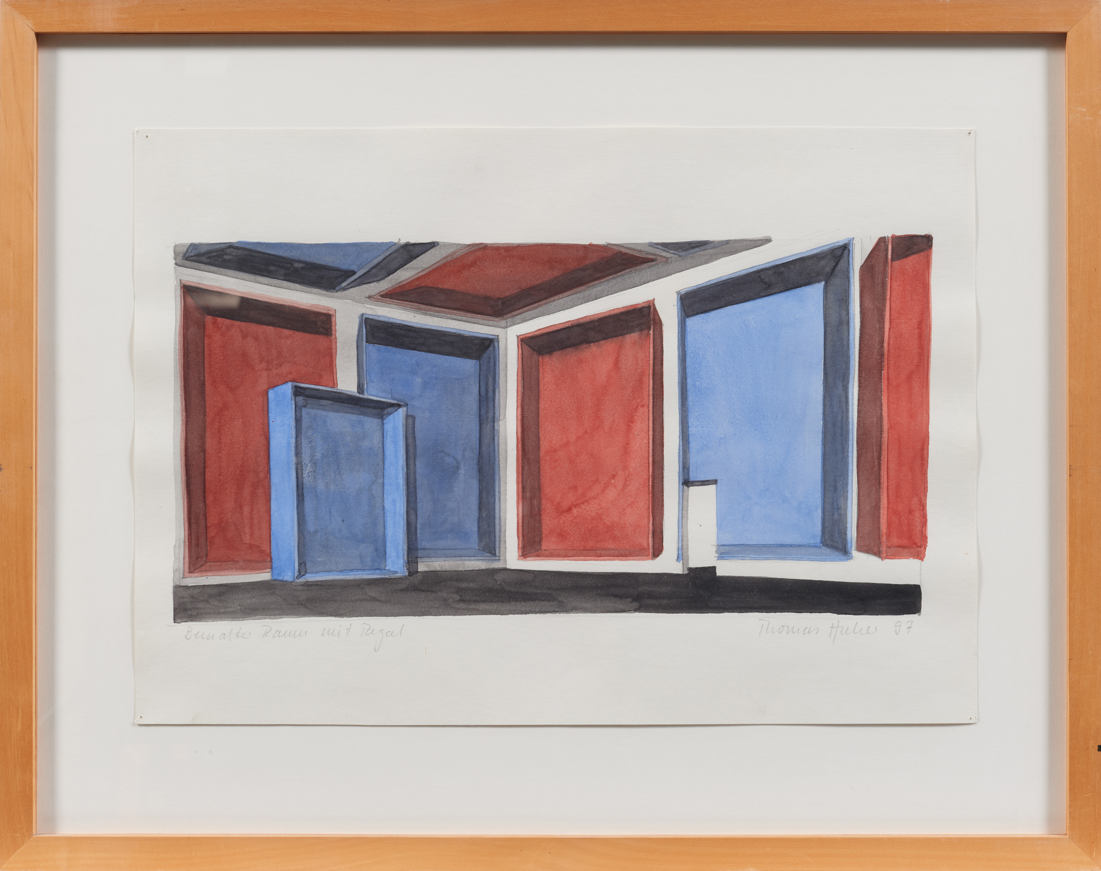 Bezeichnung: Betitelt, signiert und datiert unten: Bemalter Raum mit Regal Thomas Huber 97.