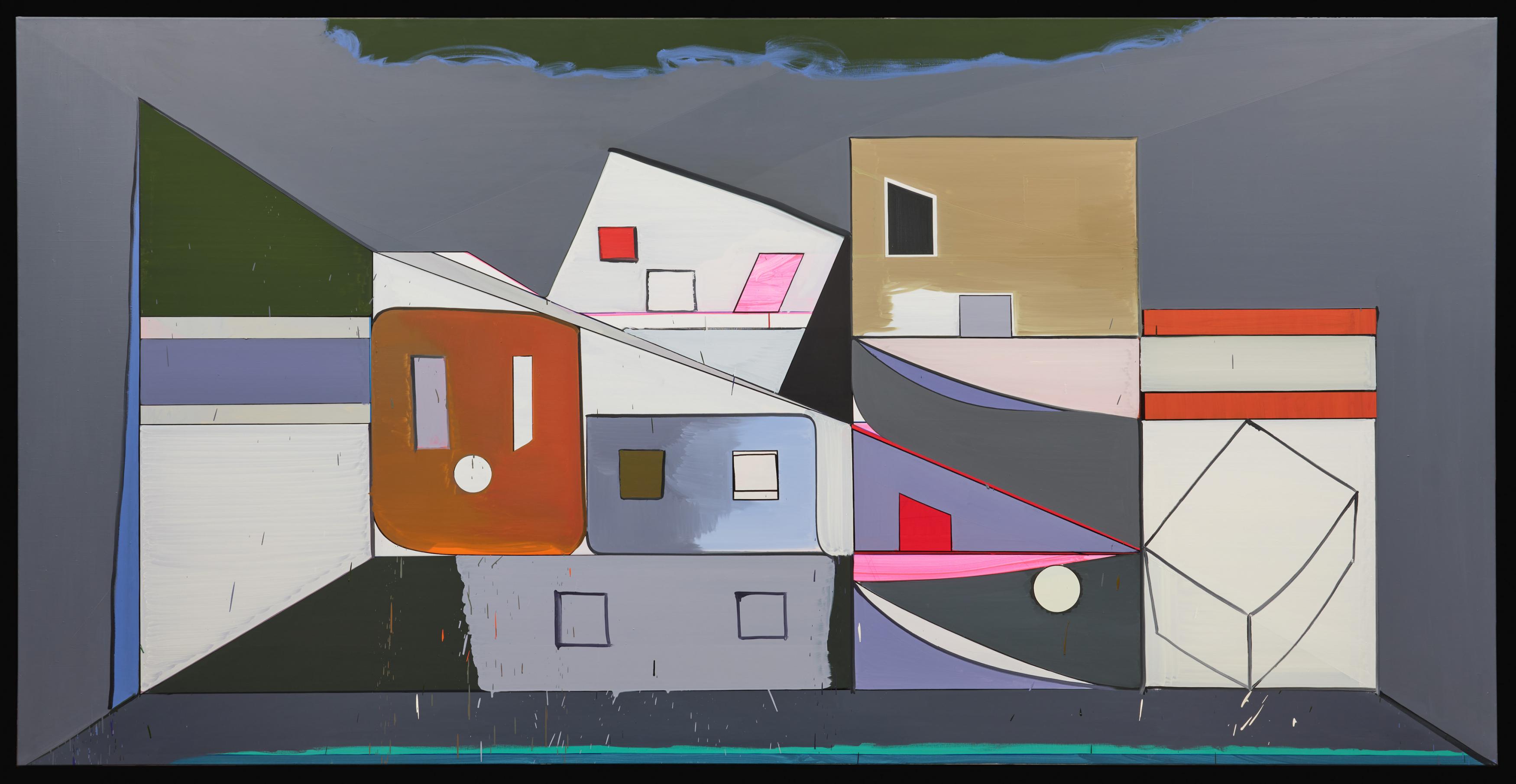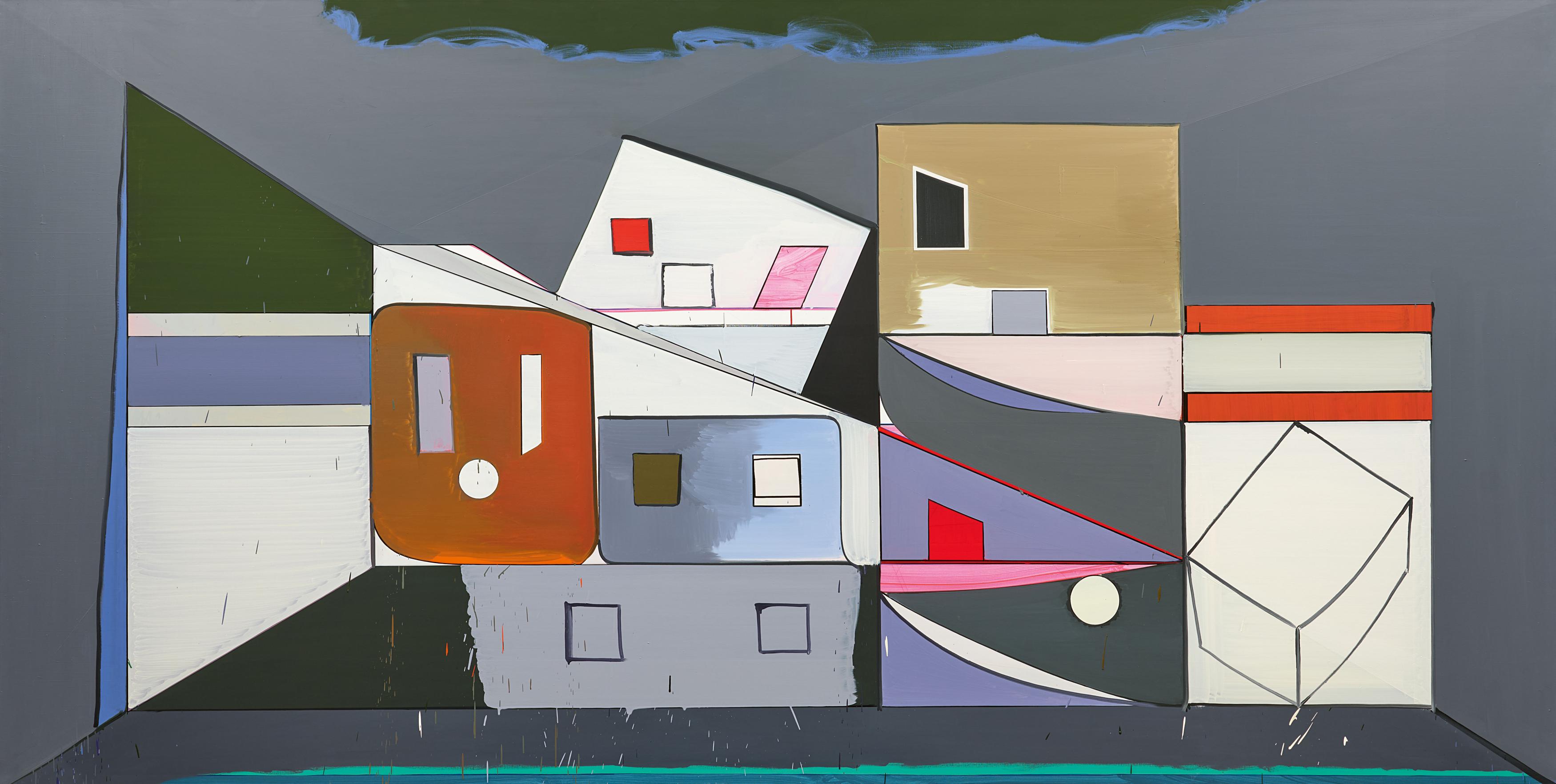 Das großformatige Ölgemälde "Mel Stuart" gehört zu den Schlüsselwerken von Scheibitz' malerischem Oeuvre. In strengem Querformat entfaltet sich eine komplexe Architektur aus geometrischen Flächen, verschachtelten Volumen und fragmentierten Strukturen, die an Häuserfassaden oder urbane Landschaften erinnern, ohne diese eindeutig darzustellen. Harmonisch gesetzte Farbfelder in Grau, Braun, Ocker, Rosa und Weiß erzeugen eine fragile Balance zwischen Ordnung und Auflösung, Stabilität und Bewegung. Wie viele seiner Arbeiten verweigert auch "Mel Stuart" eine klare Lesbarkeit. Stattdessen eröffnet es ein Spannungsfeld zwischen Konstruktion und Imagination, zwischen analytischer Struktur und poetischer Offenheit. Das Werk steht exemplarisch für Scheibitz' Suche nach jenem Zwischenraum, in dem Form und Bedeutung, Realität und Abstraktion in ein neues, zeitgenössisches Gleichgewicht treten.
