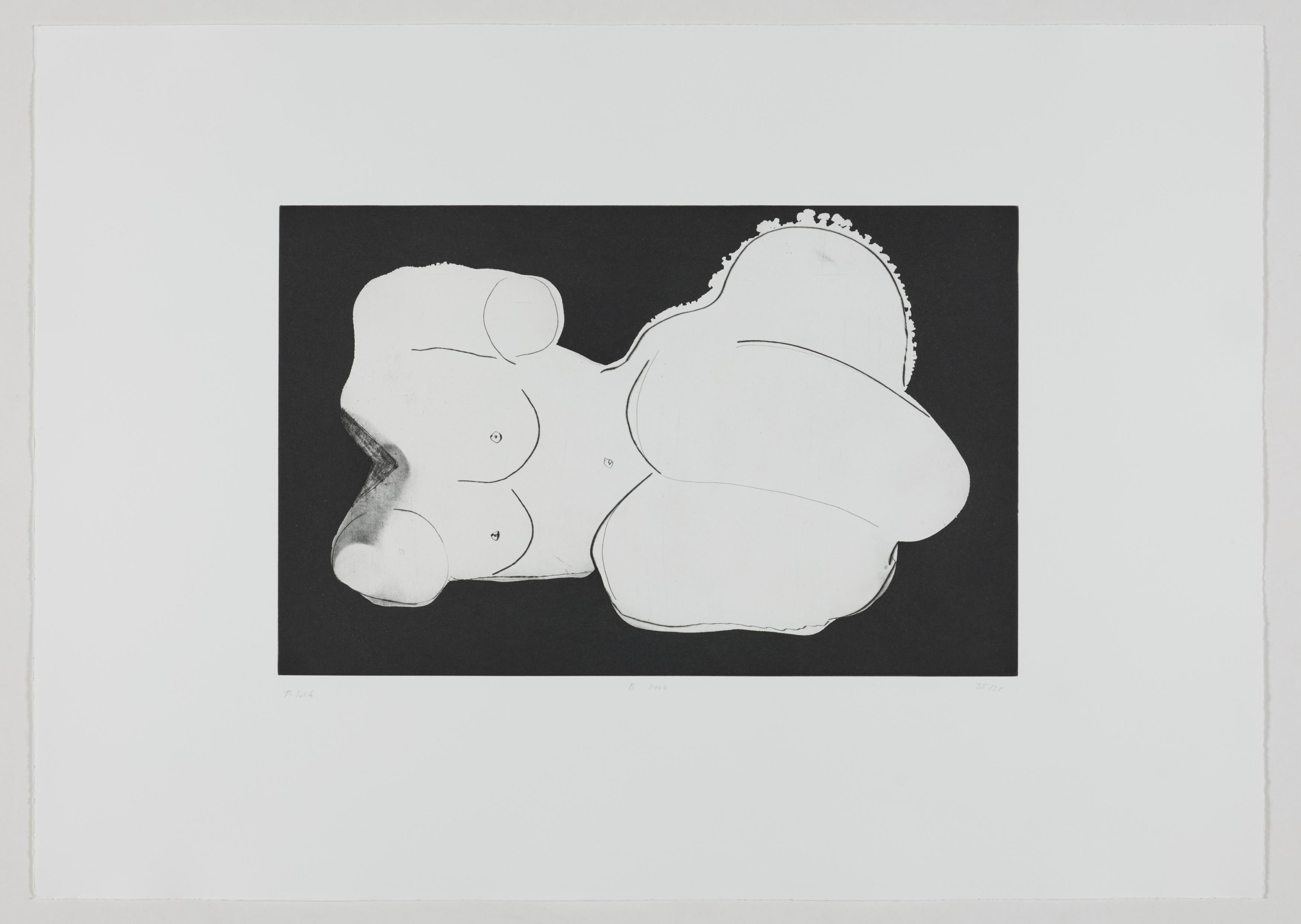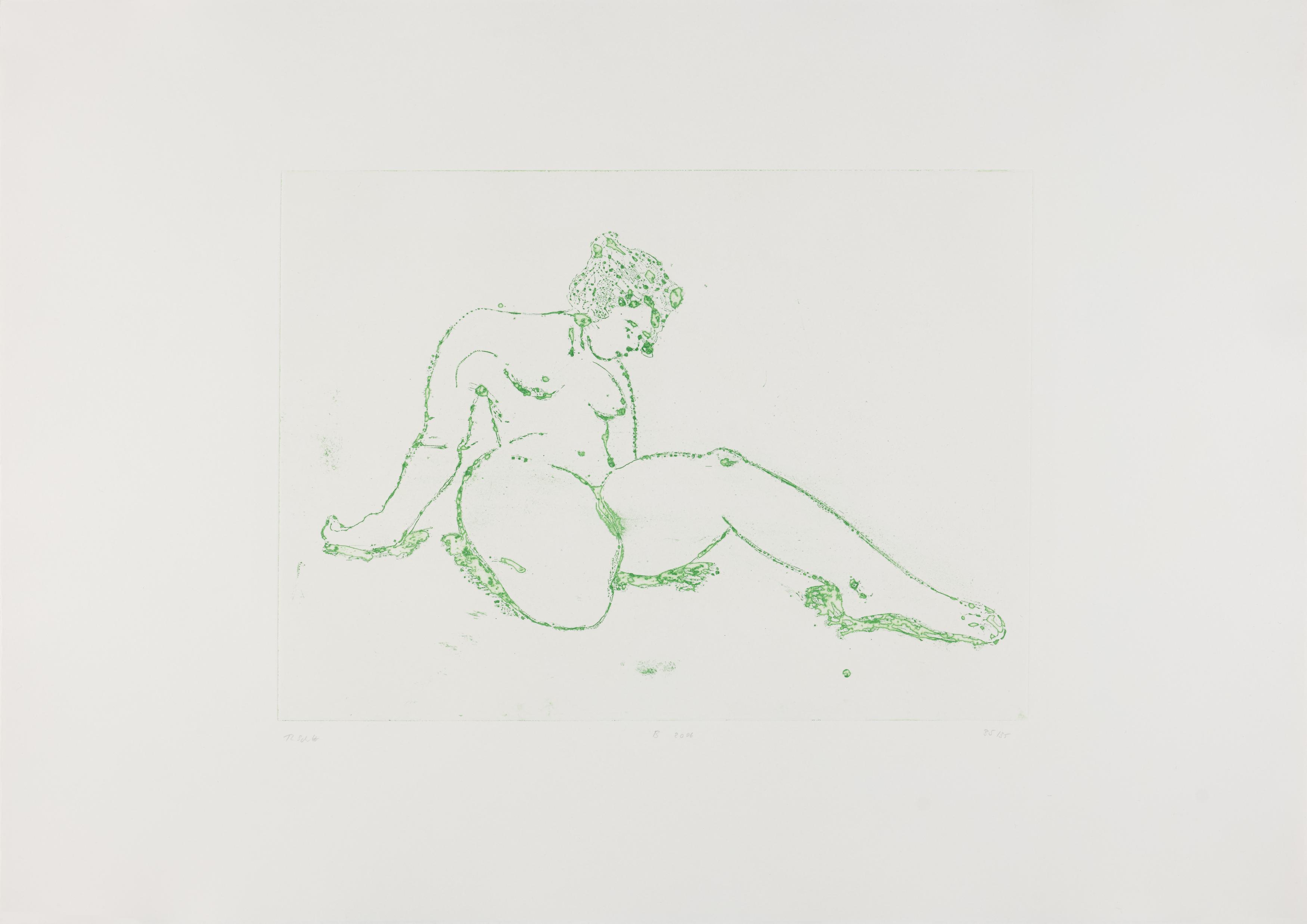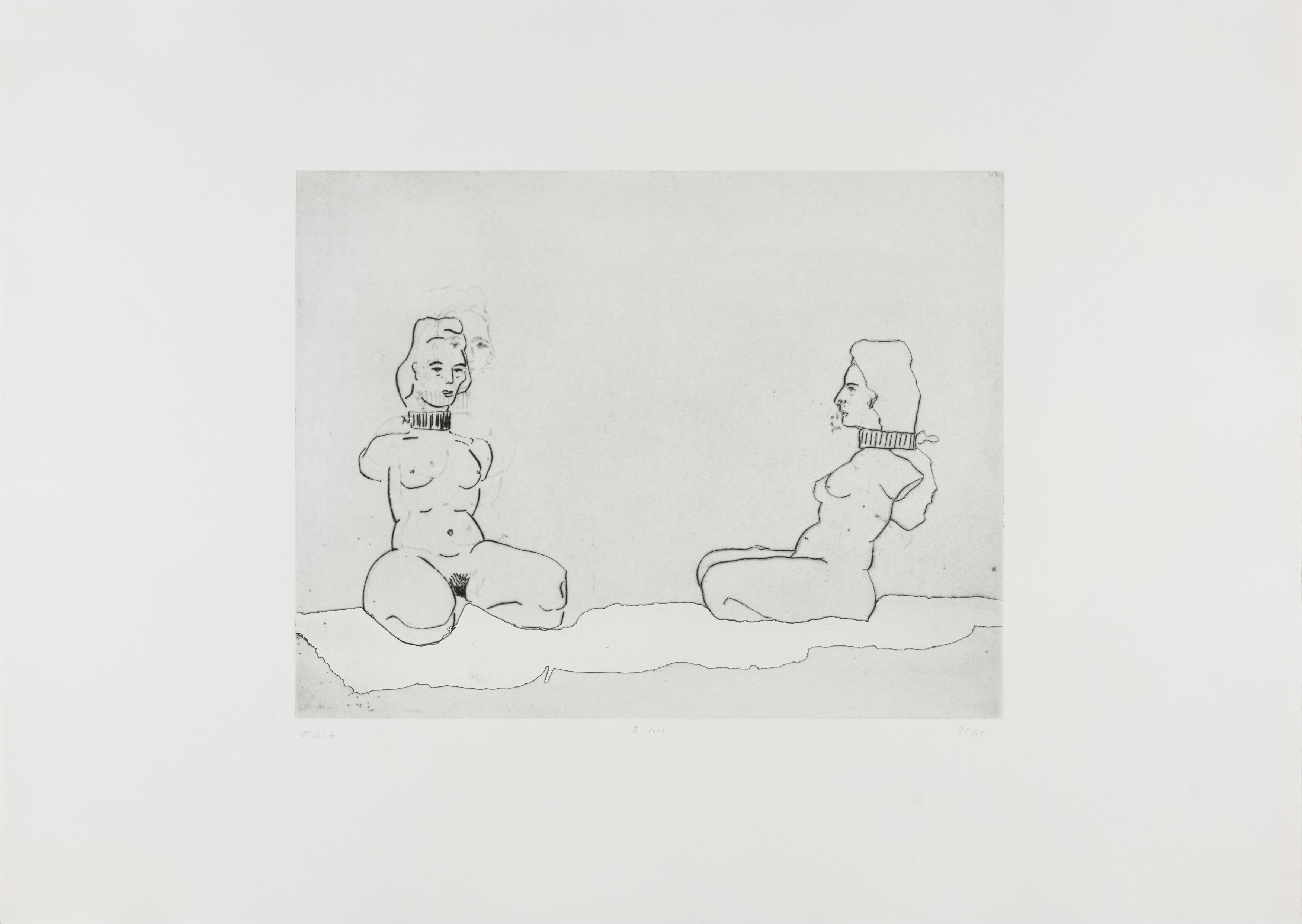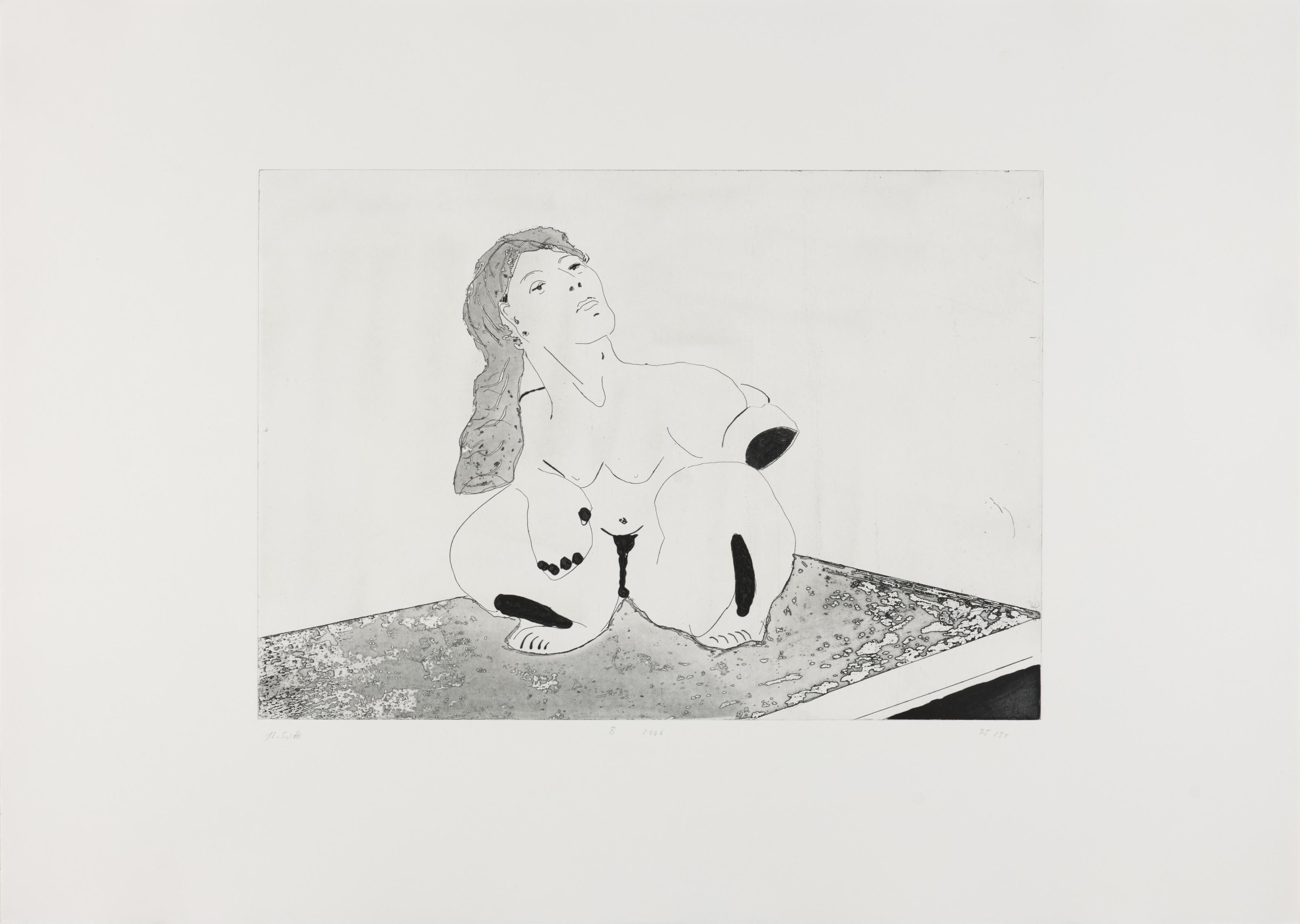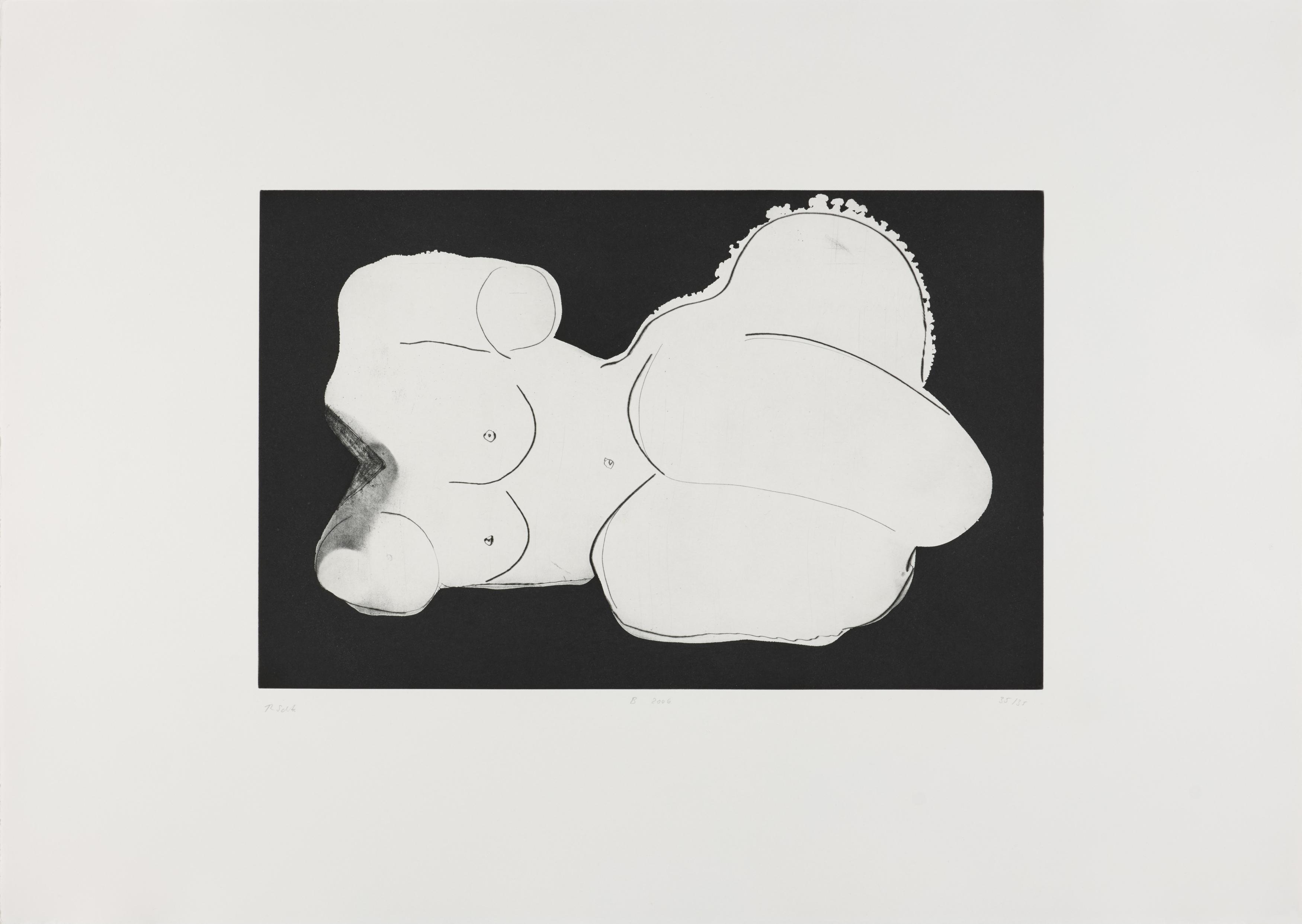 Thomas Schütte schuf 2006 die druckgraphische Serie "Frauen" in drei Varianten (A, B, C). Diese wurden von denselben Druckplatten erstellt, unterscheiden sich jedoch durch das verwendete Papier und die Formate: Japanpapier auf farbigem Büttenpapier (A) sowie weißes Büttenpapier in unterschiedlichen Größen (B und C). Schütte experimentiert mit verschiedenen Materialien und Formaten, um die künstlerische Wirkung seiner Arbeiten zu erproben. Ähnlich wie in seiner Bildhauerei, wo er häufig auf ungewöhnliche Materialien und Techniken wie Keramik zurückgreift, nutzt er in dieser Serie unterschiedliche Drucktechniken und schöpft die Möglichkeiten der druckgraphischen Kunst voll aus.
