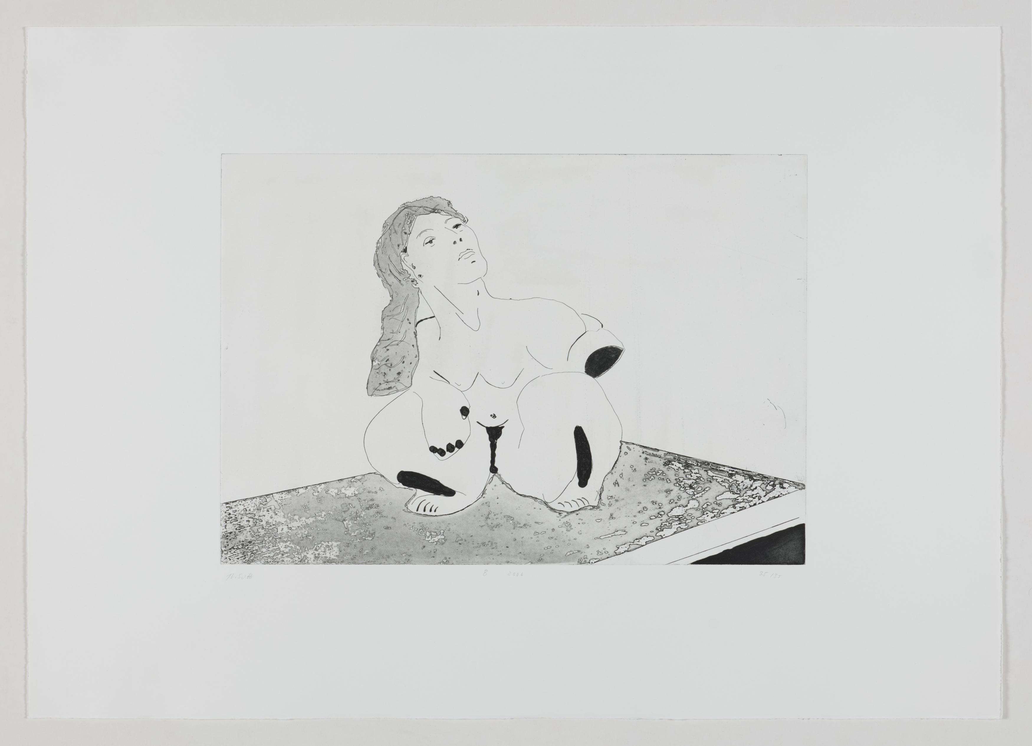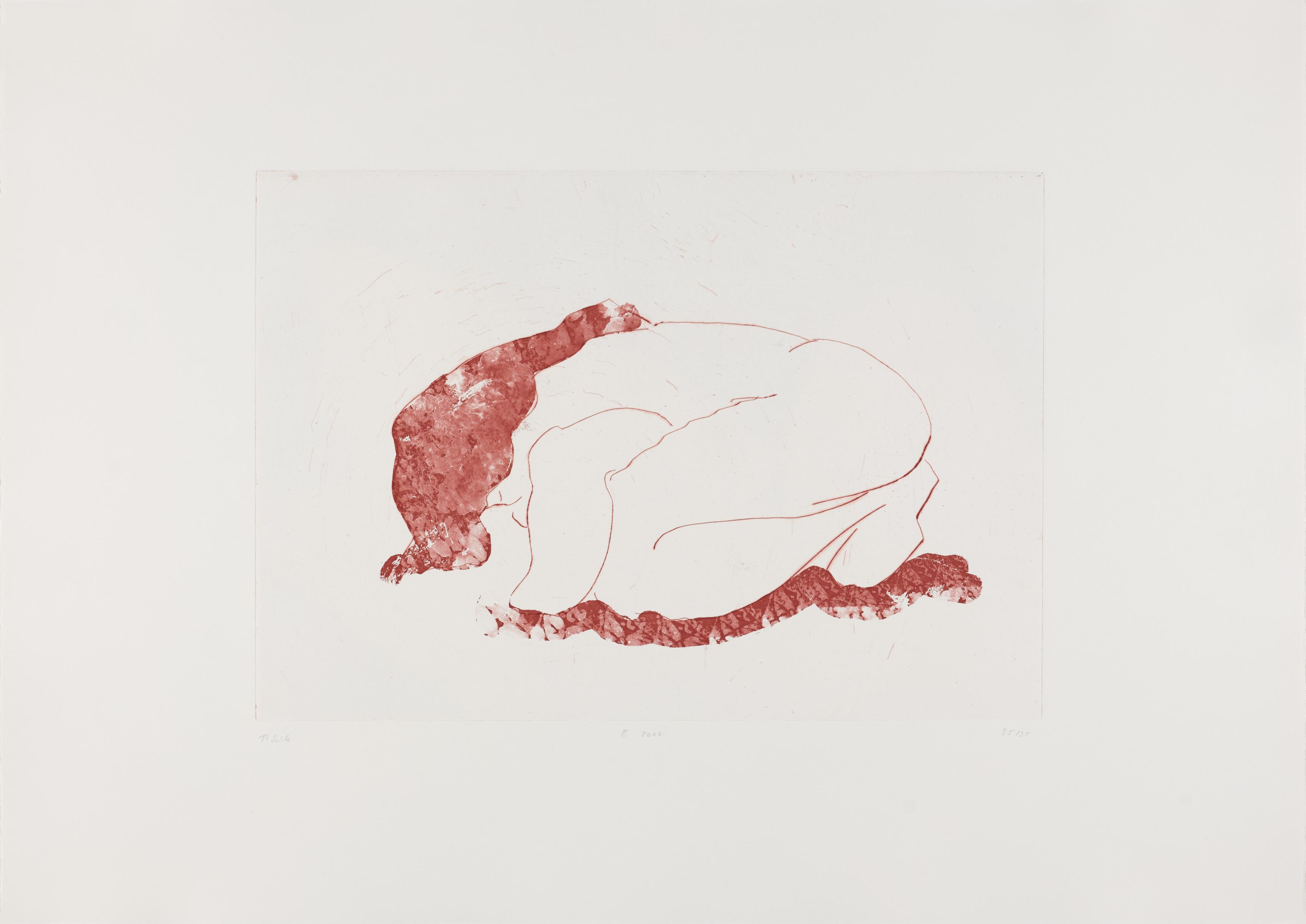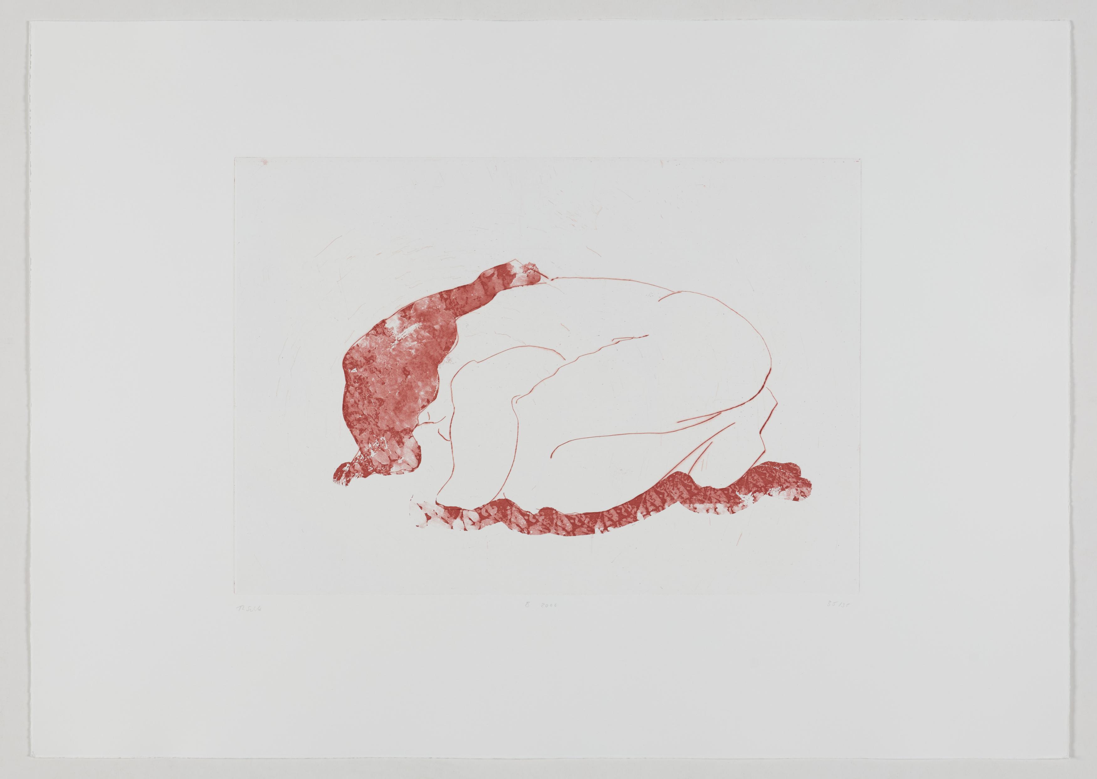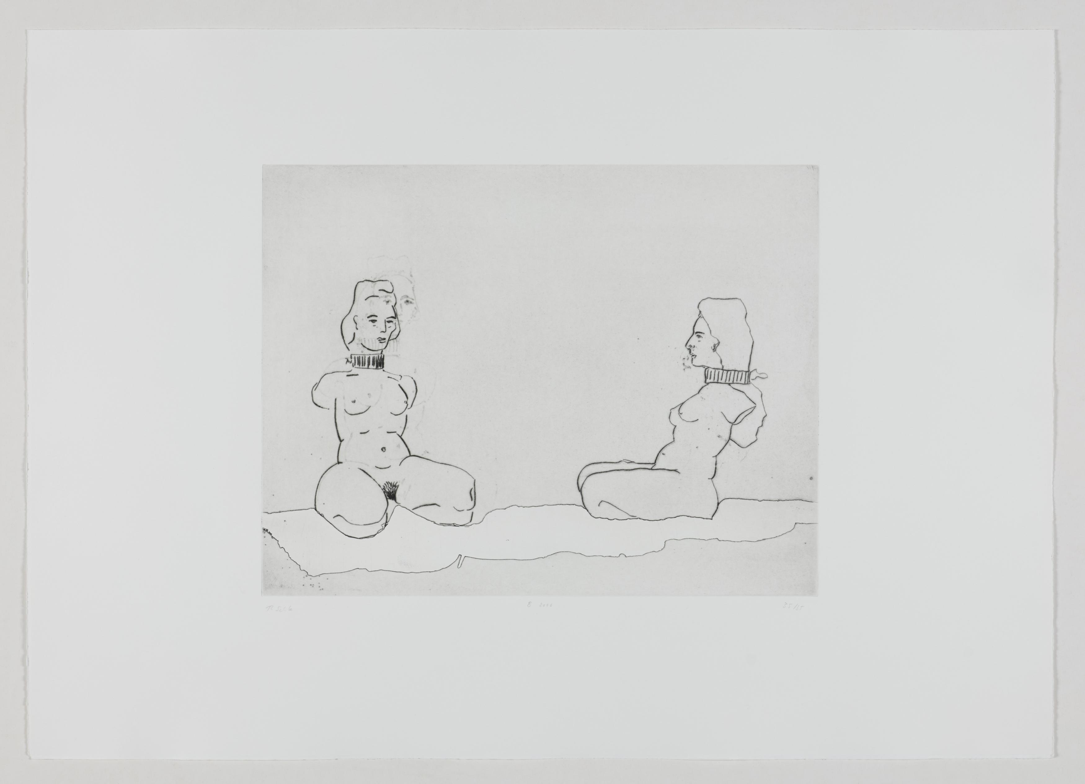 Thomas Schütte schuf 2006 die druckgraphische Serie "Frauen" in drei Varianten (A, B, C). Diese wurden von denselben Druckplatten erstellt, unterscheiden sich jedoch durch das verwendete Papier und die Formate: Japanpapier auf farbigem Büttenpapier (A) sowie weißes Büttenpapier in unterschiedlichen Größen (B und C). Schütte experimentiert mit verschiedenen Materialien und Formaten, um die künstlerische Wirkung seiner Arbeiten zu erproben. Ähnlich wie in seiner Bildhauerei, wo er häufig auf ungewöhnliche Materialien und Techniken wie Keramik zurückgreift, nutzt er in dieser Serie unterschiedliche Drucktechniken und schöpft die Möglichkeiten der druckgraphischen Kunst voll aus.