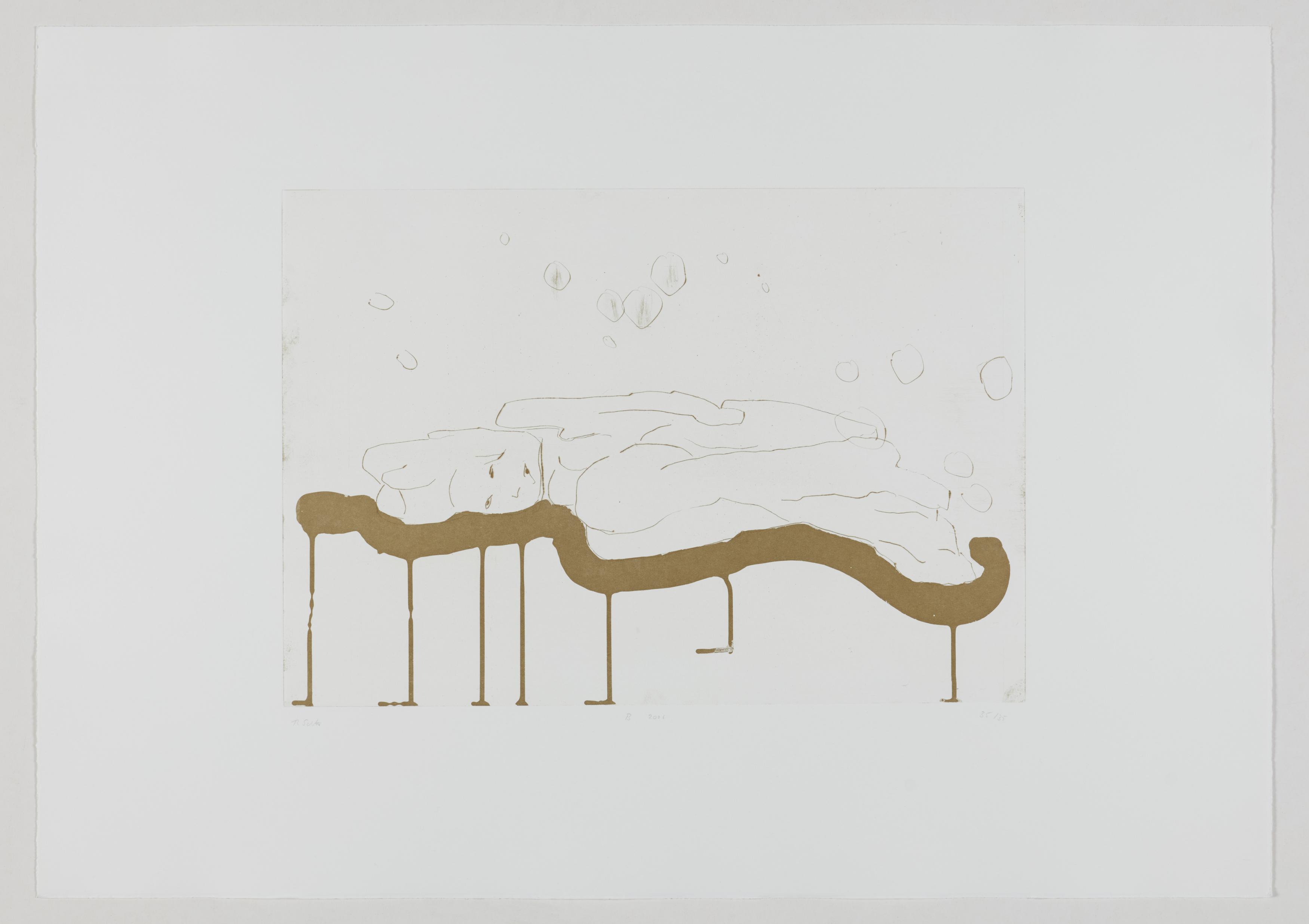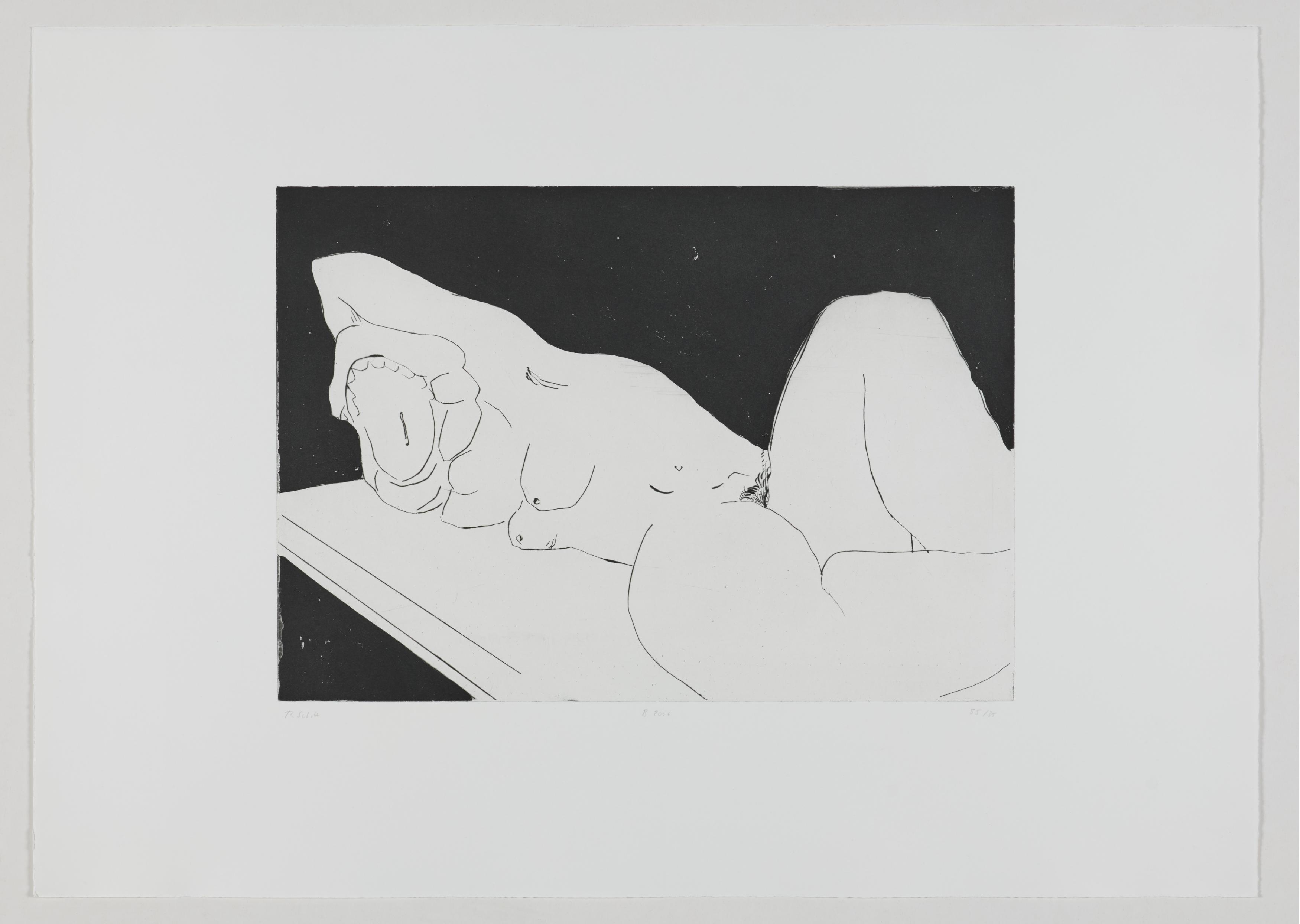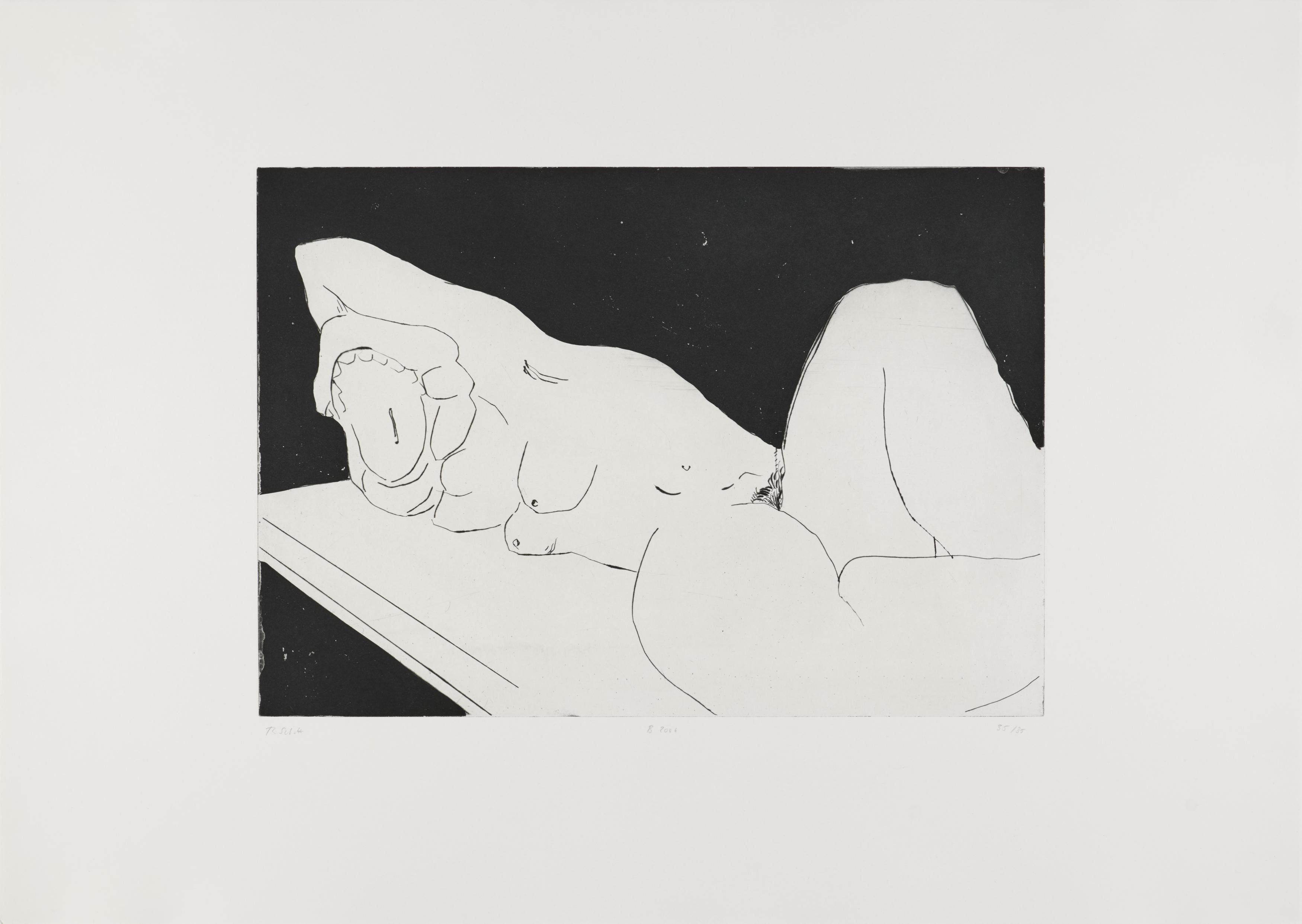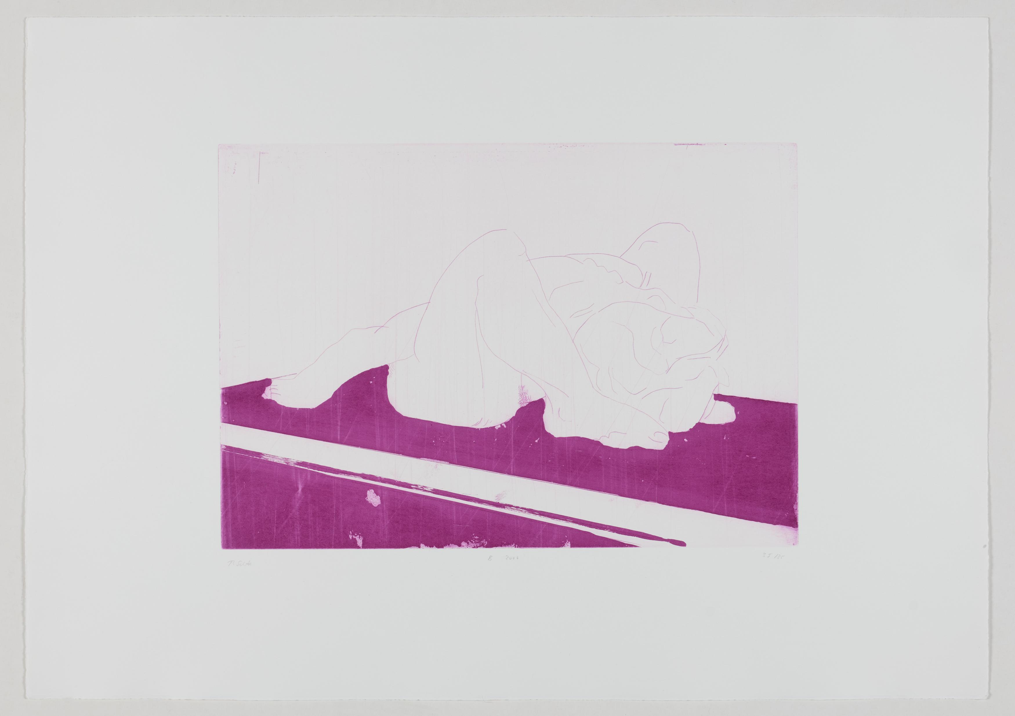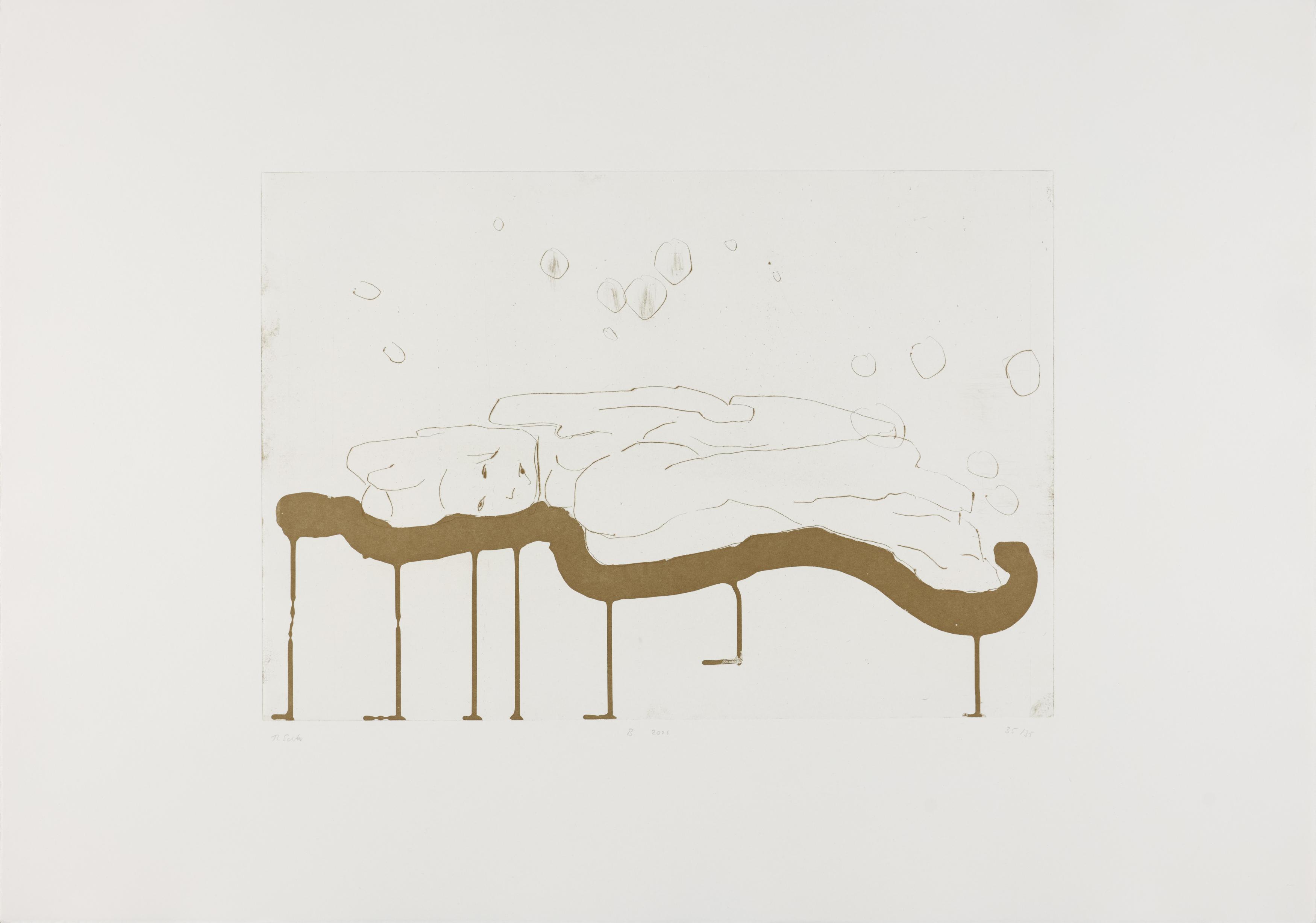 Thomas Schütte schuf 2006 die druckgraphische Serie "Frauen" in drei Varianten (A, B, C). Diese wurden von denselben Druckplatten erstellt, unterscheiden sich jedoch durch das verwendete Papier und die Formate: Japanpapier auf farbigem Büttenpapier (A) sowie weißes Büttenpapier in unterschiedlichen Größen (B und C). Schütte experimentiert mit verschiedenen Materialien und Formaten, um die künstlerische Wirkung seiner Arbeiten zu erproben. Ähnlich wie in seiner Bildhauerei, wo er häufig auf ungewöhnliche Materialien und Techniken wie Keramik zurückgreift, nutzt er in dieser Serie unterschiedliche Drucktechniken und schöpft die Möglichkeiten der druckgraphischen Kunst voll aus.