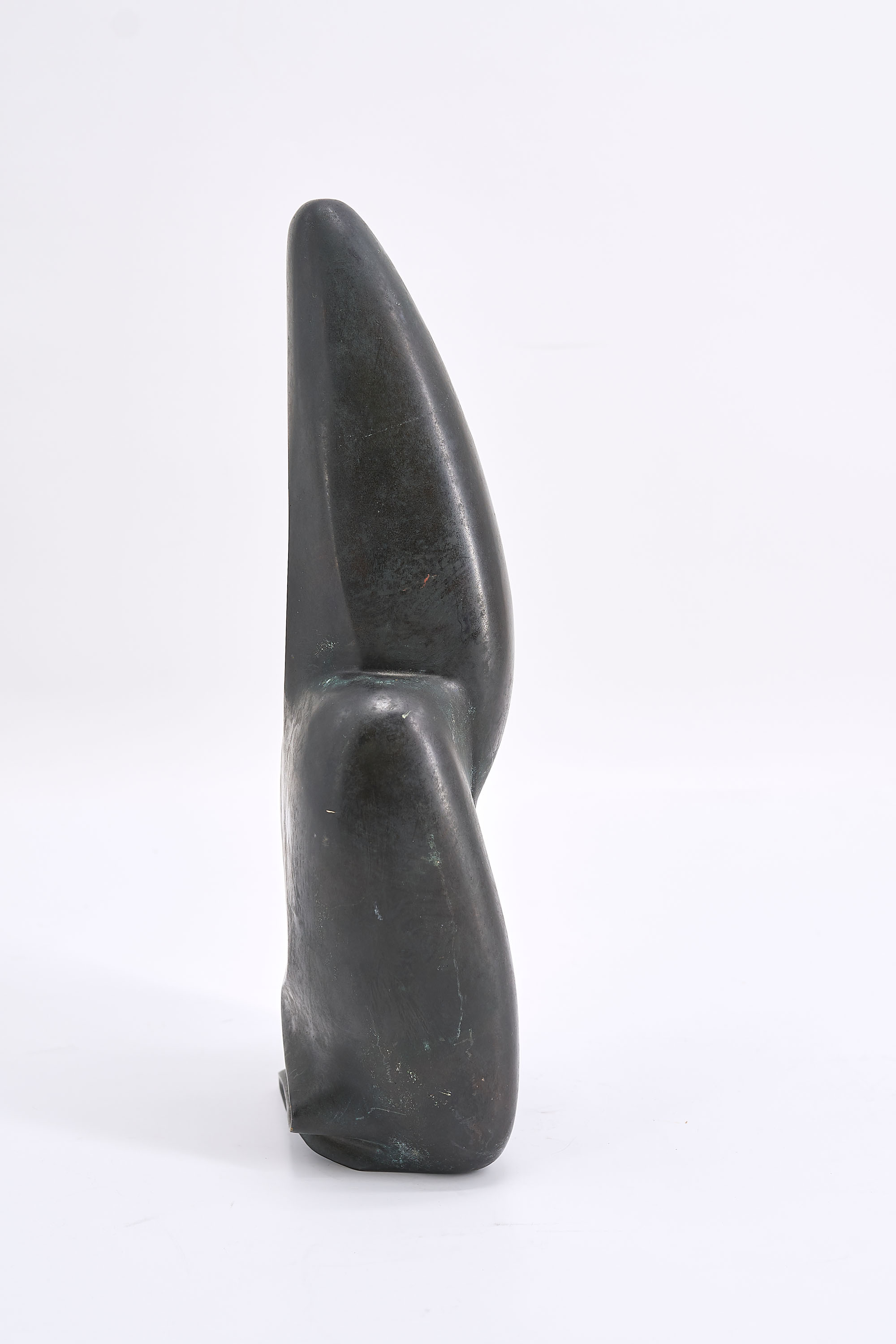 Leicht fleckige Patina. Partiell einsetzende Grünspan-Korrosion. Minimale bis leichte Kratzspuren. Deutliche Kratzspuren mit Abrieb recto im unteren Bereich sowie seitlich oben. Klebereste eines alten Etiketts verso unten. Auf der Unterseite Rest eines alten Etiketts. Ansonsten befindet sich die Skulptur in einem guten Zustand.