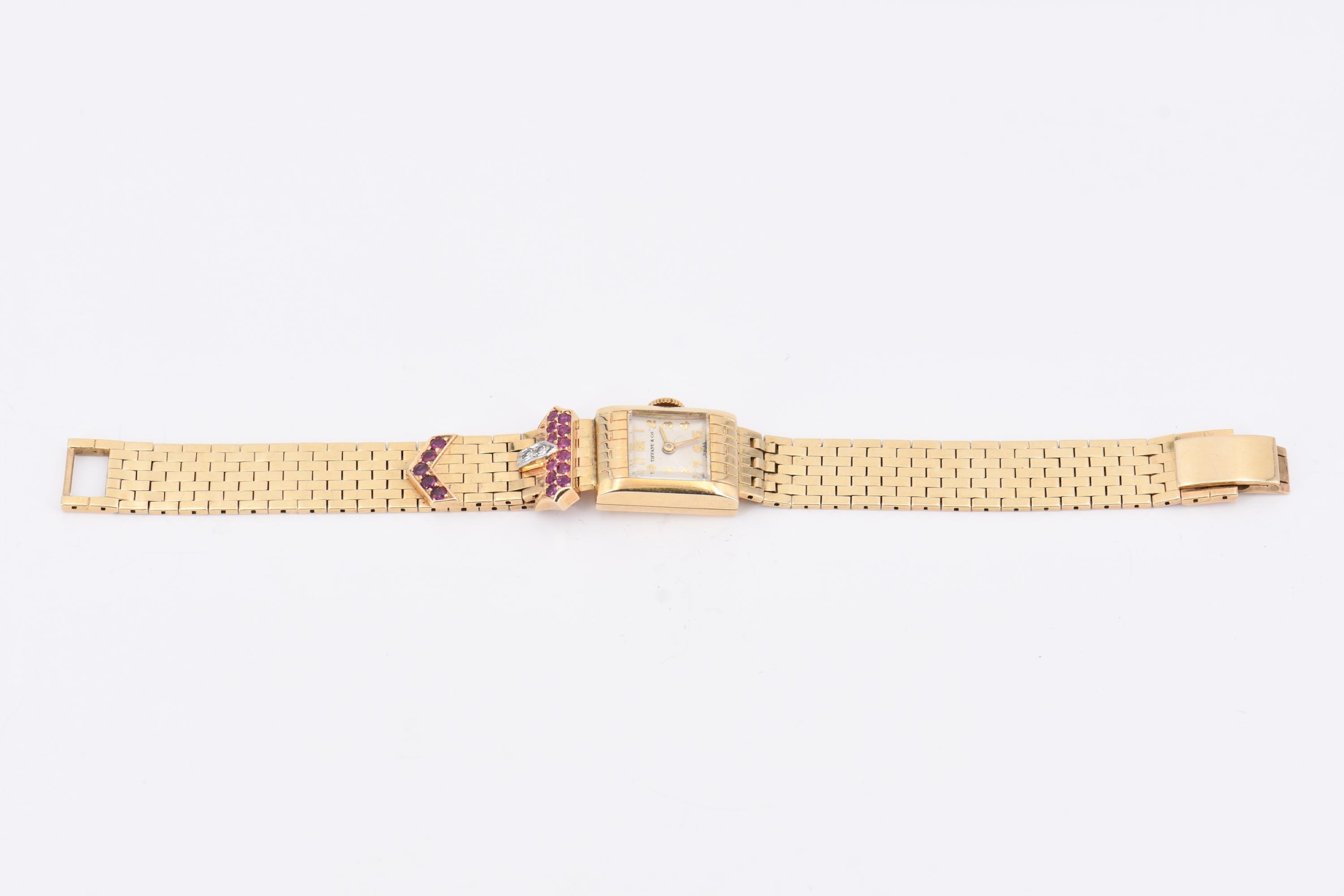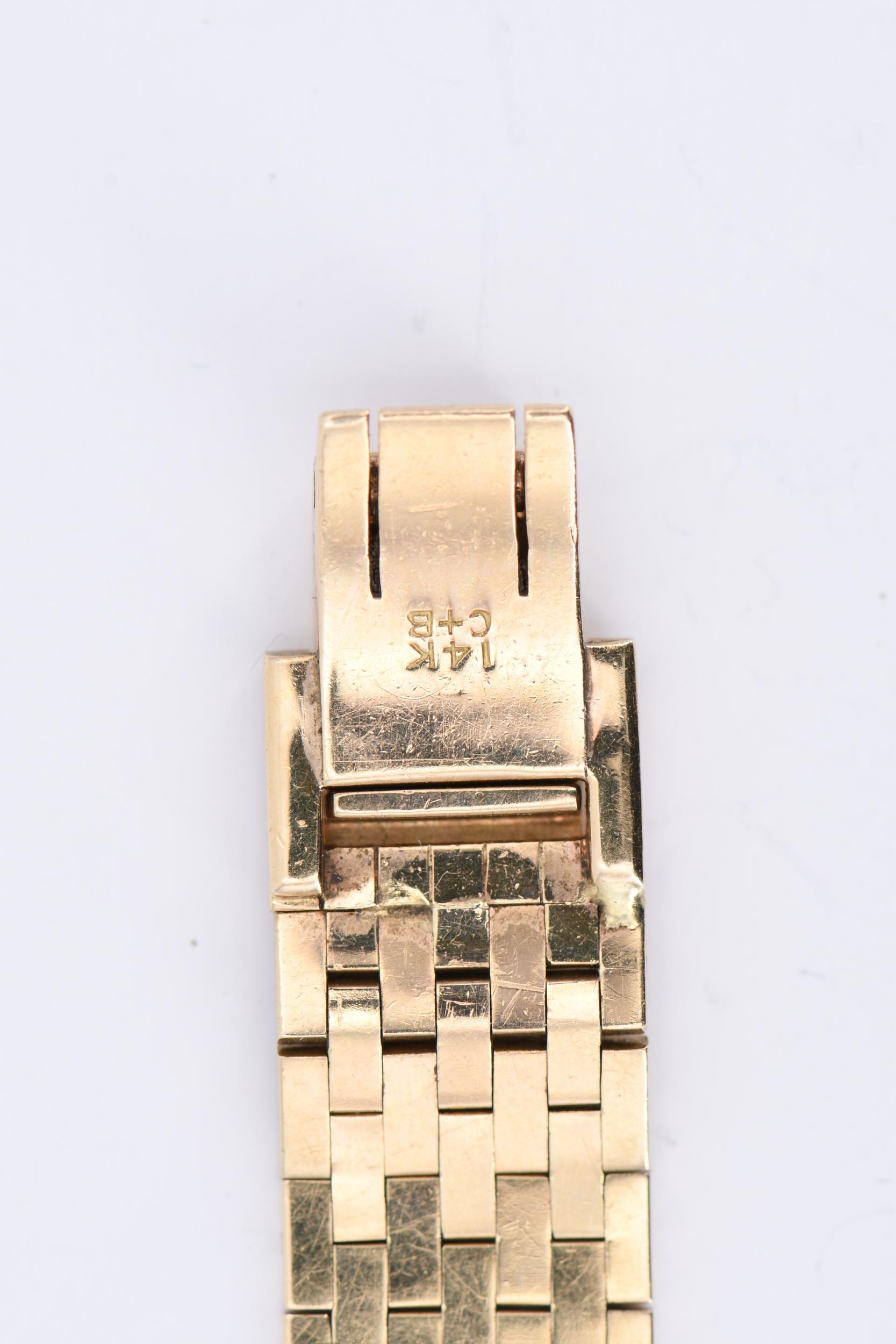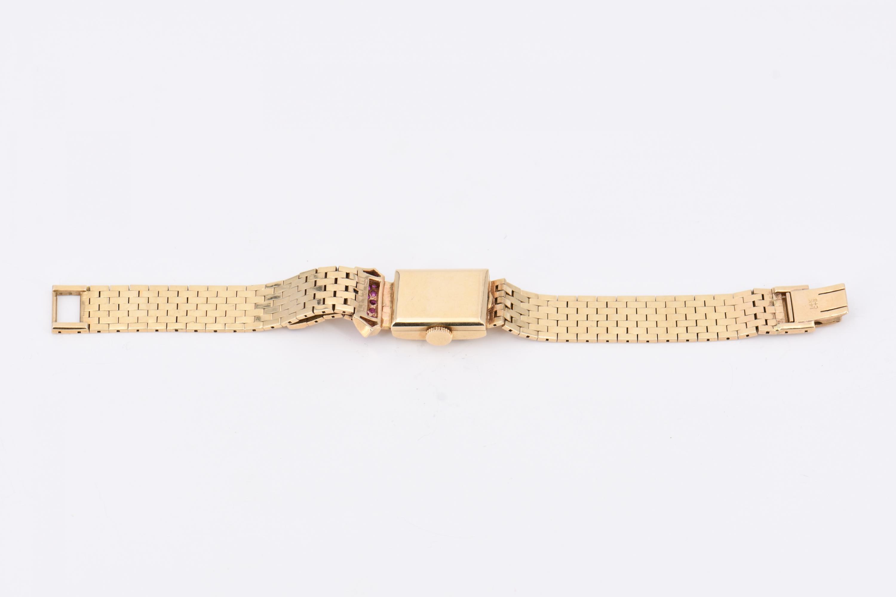 Gehäuse/Armband: 585/- Gelbgold, Gliederarmband, Zffbl. weiß lackiert, aufgesetzte, goldene Indizes.