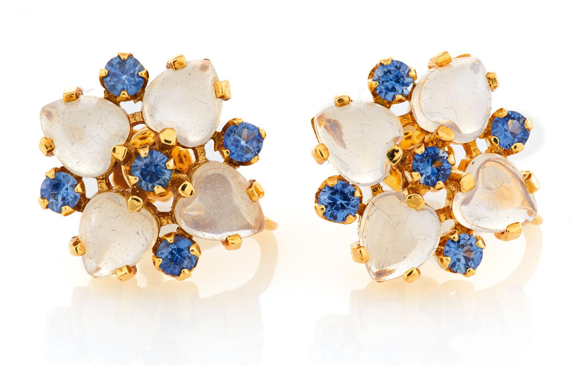 Edelsteine: 8 herzförmige Mondstein-Cabochons 6,8 x 6,4 x 3,4 mm, 10 runde, facettierte Saphire zus. ca. 1,2 ct..
