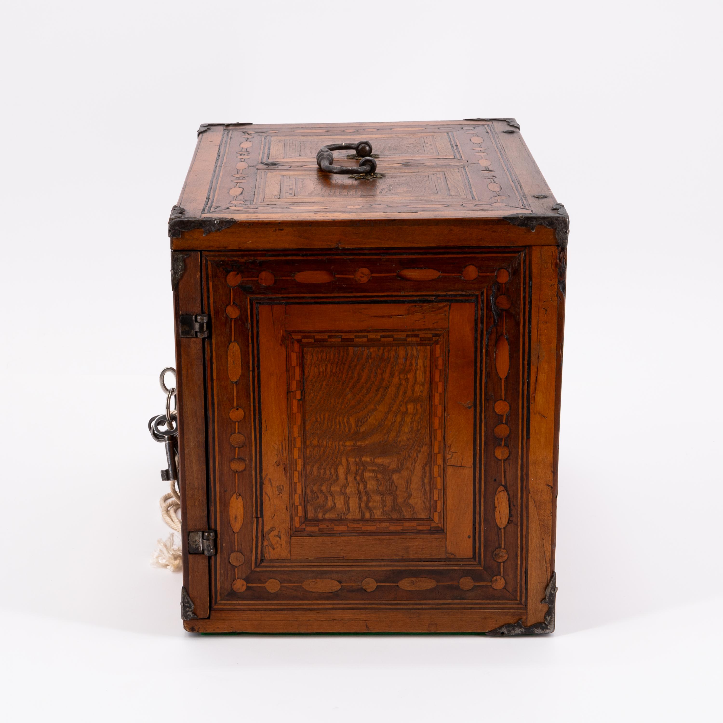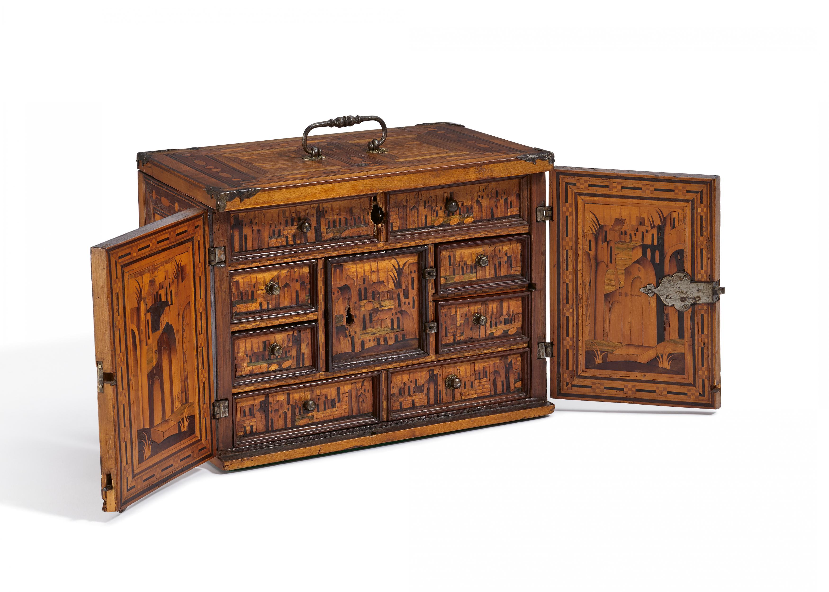 Die Innenseiten der Türflügel sowie die Fronten der Schübe mit intarsierten Stadtsilhouetten. Die Außenseiten mit kassettenartigen Feldern, Würfel- und Perlband dekoriert. Oben scharnierter Griff.