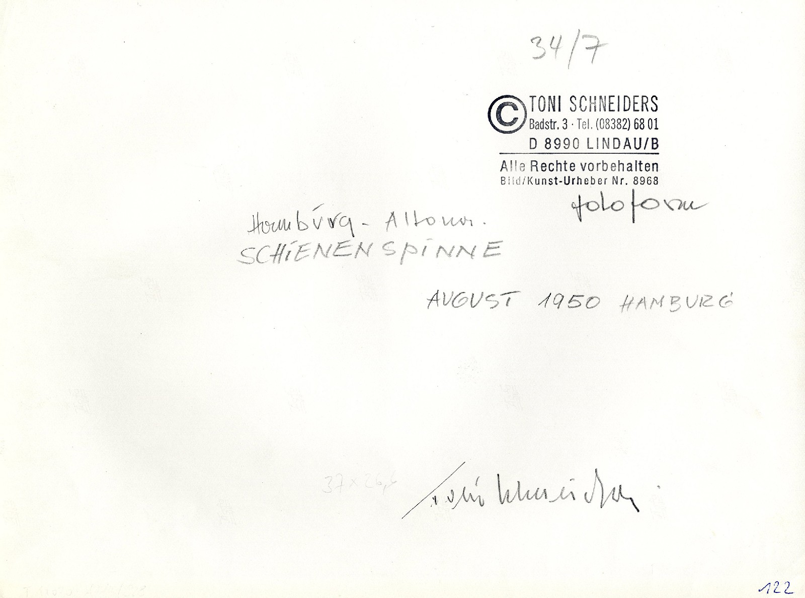 "Schienenspinne". Altona, August 1950. Gelatinesilberabzug. Rückseitig mit Bleistift signiert, betitelt, datiert sowie Copyrightstempel. Agfa-Papier auf Passepartout. 30,4.