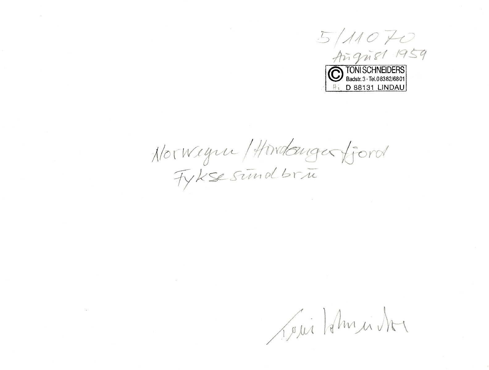 "Norwegen/ Hardangerfjord. Fyksesundbrü". August 1959. Späterer Gelatinesilberabzug. Rückseitig mti Bleistift signiert, betitelt, datiert, Angabe der Archivnummer sowie