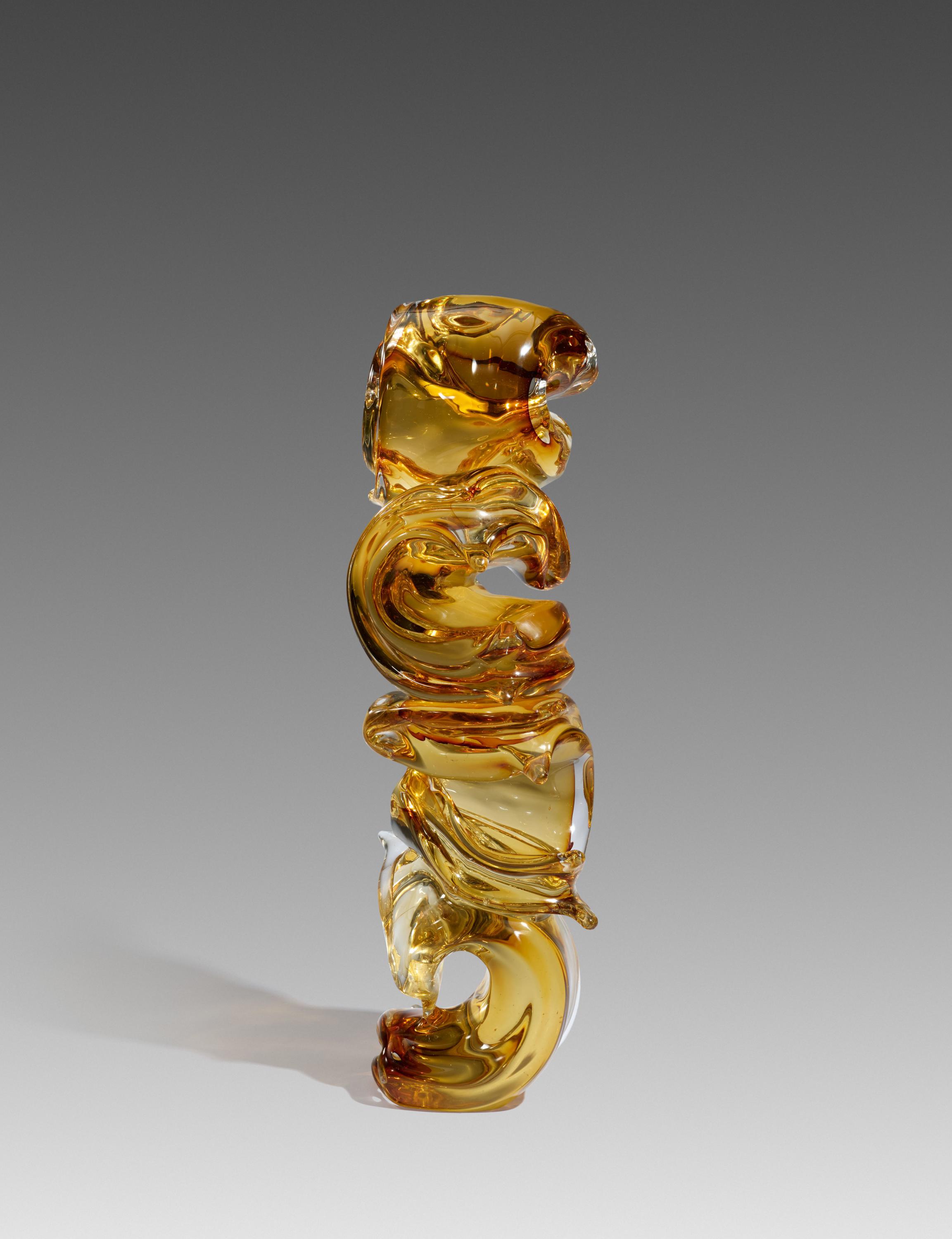 Die Skulptur "Curl" aus dem Jahr 2024 ist aus bernsteinfarbenem Glas gefertigt - einem Material, dessen Bearbeitung größte Herausforderungen mit sich bringt. Der Werktitel verweist auf die geschwungenen Linien der Glasstruktur, die an die natürliche Bewegung von Locken oder Ranken erinnern und sich wie organische Spiralen in den Raum hinein entfalten. Der transparente, vom wechselnden Lichteinfall durchdrungene Werkstoff schafft zudem eine fließende, grenzenlose Verbindung zwischen Raum und Skulptur, lässt eine zweite, imaginäre Welt jenseits des Materiellen aufscheinen.