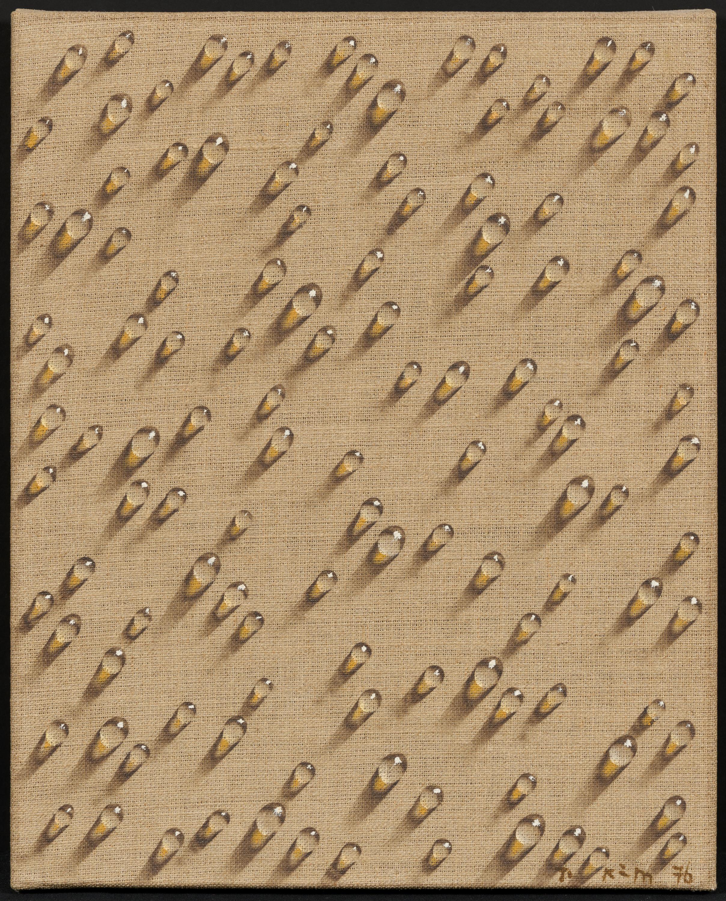 Die Wassertropfen in "Ohne Titel (Wassertopfen)" sind über die gesamte Bildfläche aus grob strukturierter, ungrundierter Leinwand wie blanke Murmeln verteilt. Durch den Lichteinfall aus der oberen rechten Ecke werfen die durchsichtigen Körper einen Schlagschatten, der ihre Silhouette elliptisch in die Länge zieht.