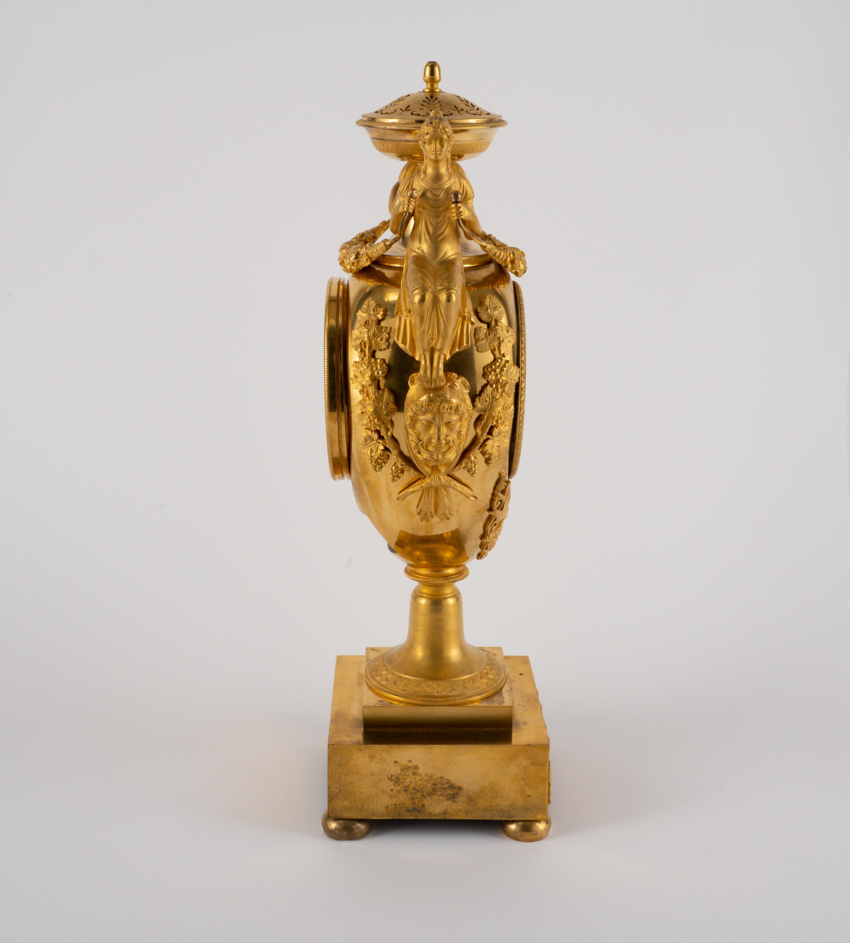 Balusterförmiges Gehäuse mit aufgelegten Reliefornamenten und seitlichen Maskarons.