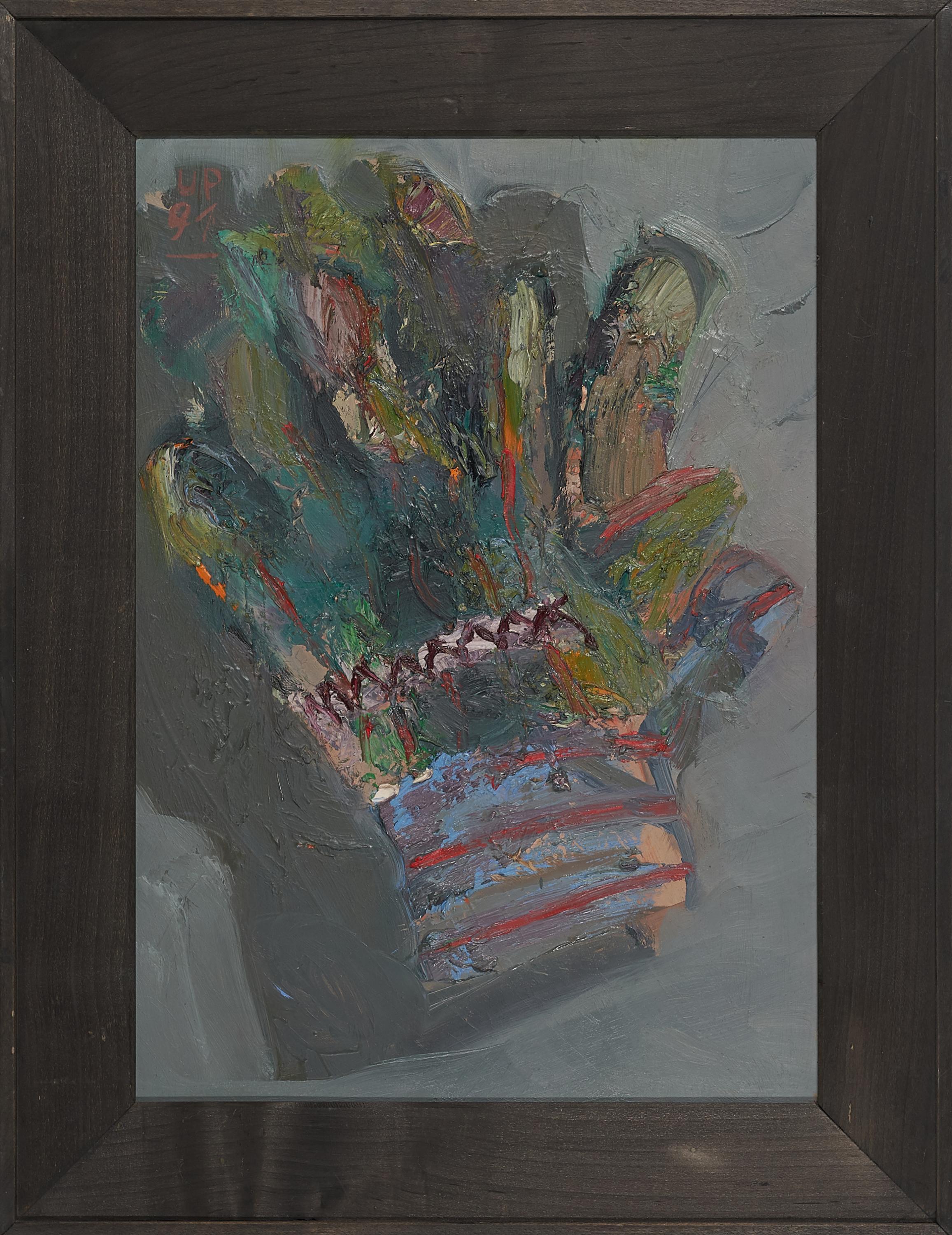 "Meine Malhandschuhe". 1991. Öl auf Hartfaserplatte. 48,5 x 35,5cm. Monogrammiert und datiert oben links: UP 91 und verso bezeichnet, monogrammiert und datiert: Meine Malhandschuhe OP 89. Rahmen.