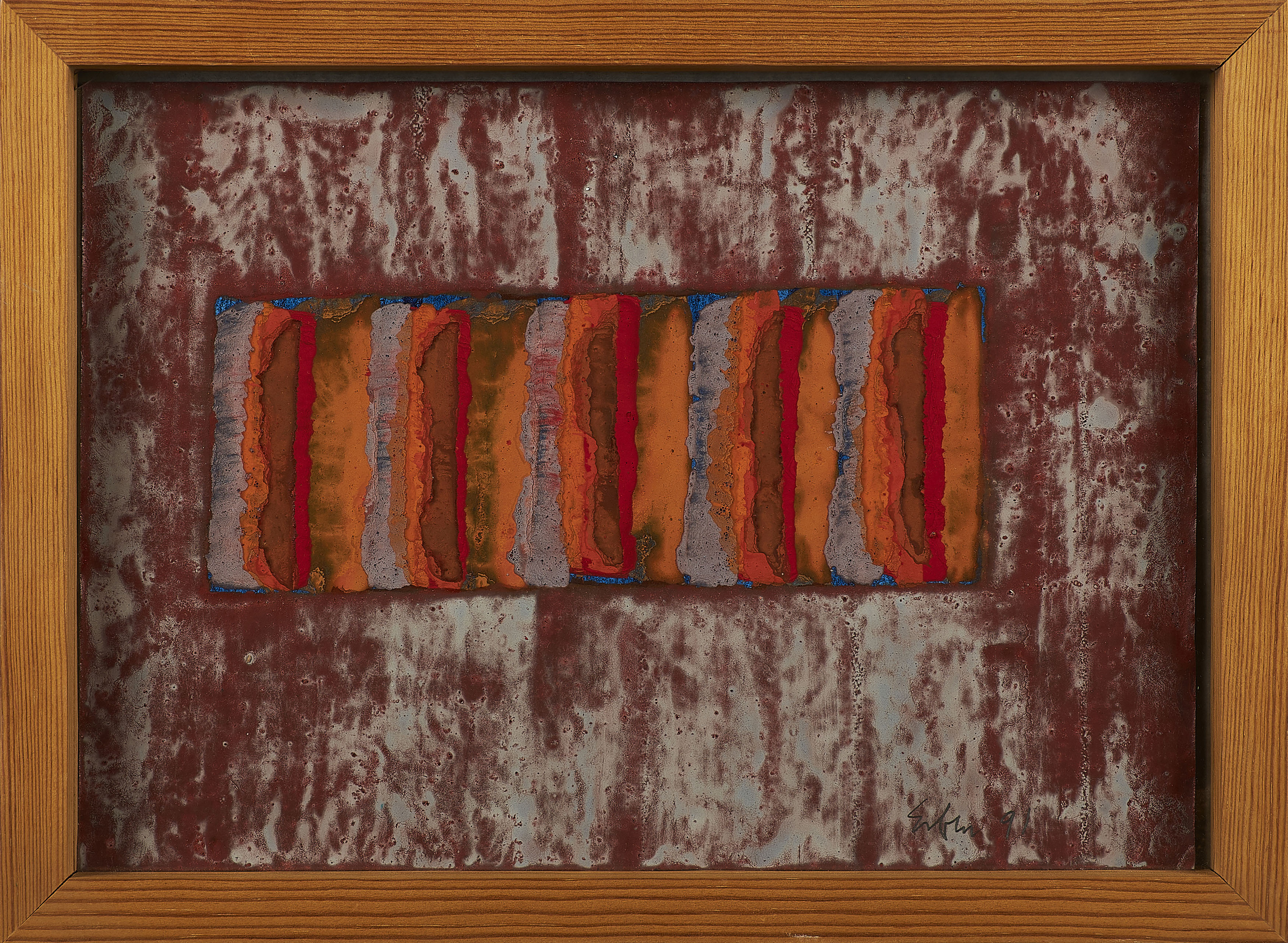 Bezeichnung: Signiert und datiert unten rechts: Erben 91. Sowie verso auf Rahmenrückwand signiert, datiert und betitelt: Ulrich Erben 91 "Birten". Daneben mit Richtungspfeil versehen.