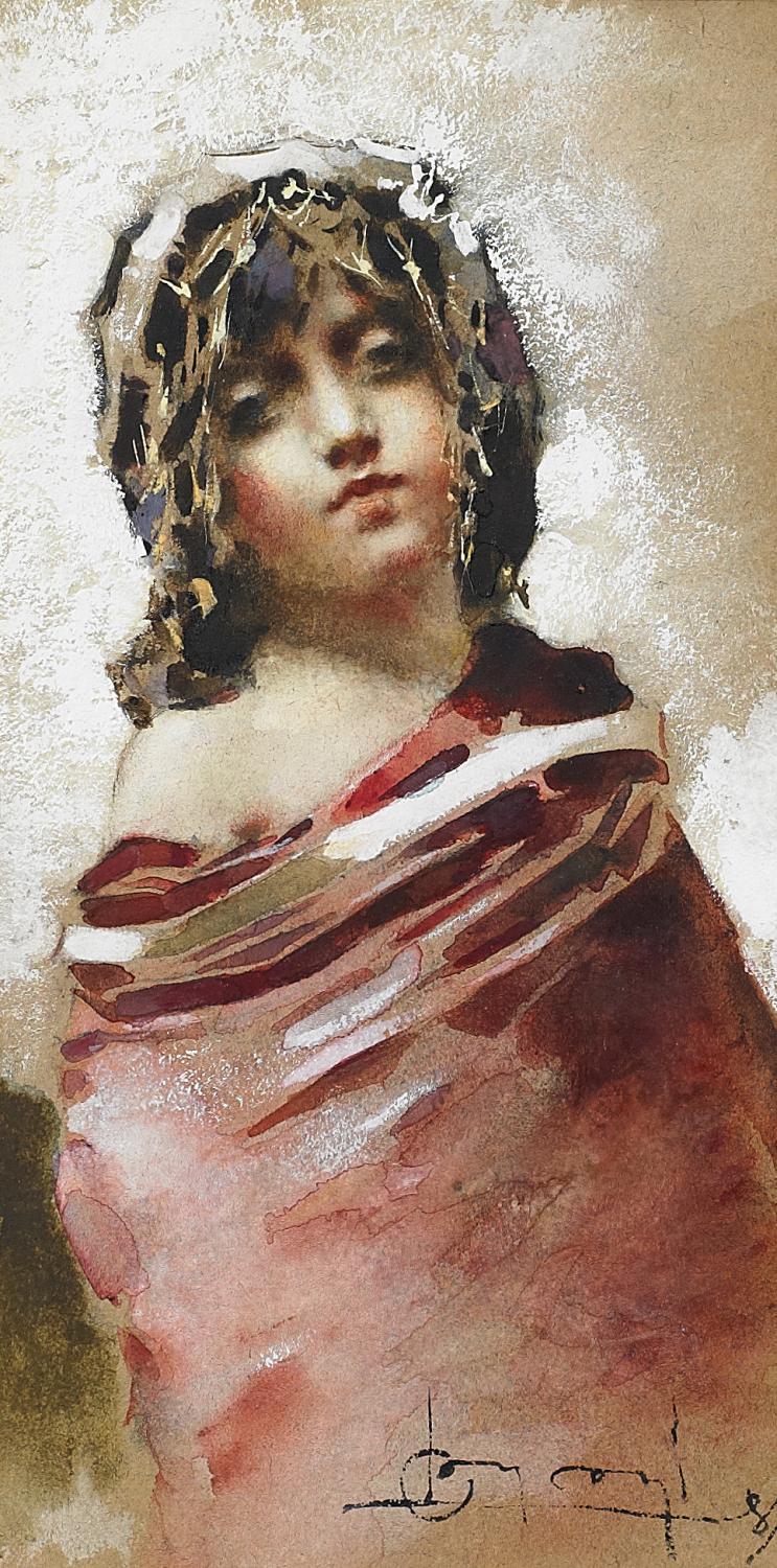Junges Mädchen. Unten rechts: unleserlich 87. Mischtechnik auf Papier. Montiert. 32 x 16,3cm. Passepartout, gerahmt.