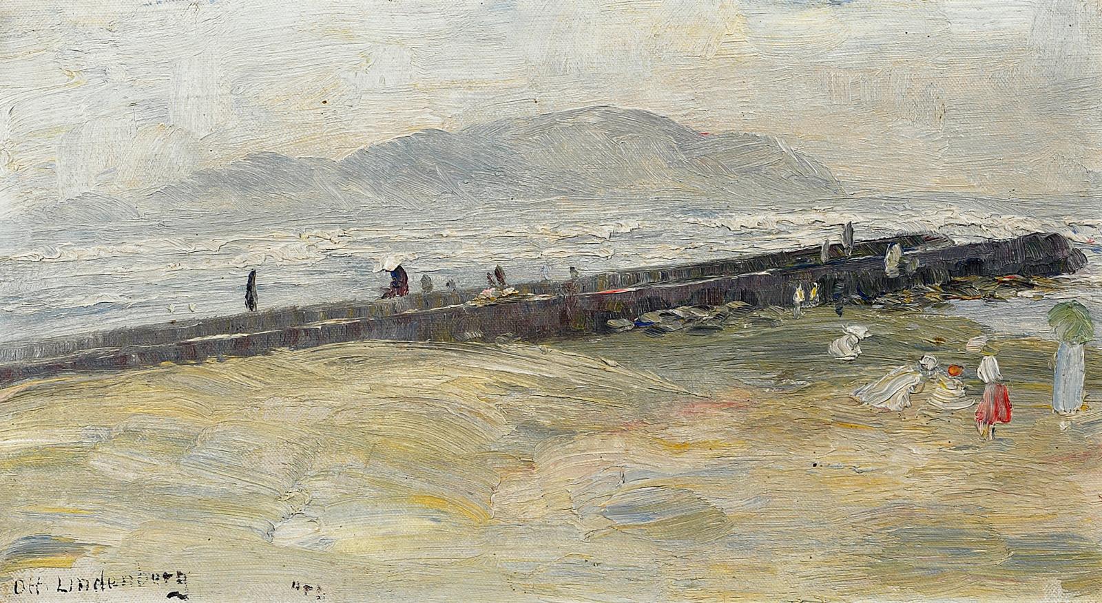 Am Strand. Unten links: OH Lindenberg. Öl auf Leinwand. Auf Karton gezogen. 18 x 32cm. Rahmen.