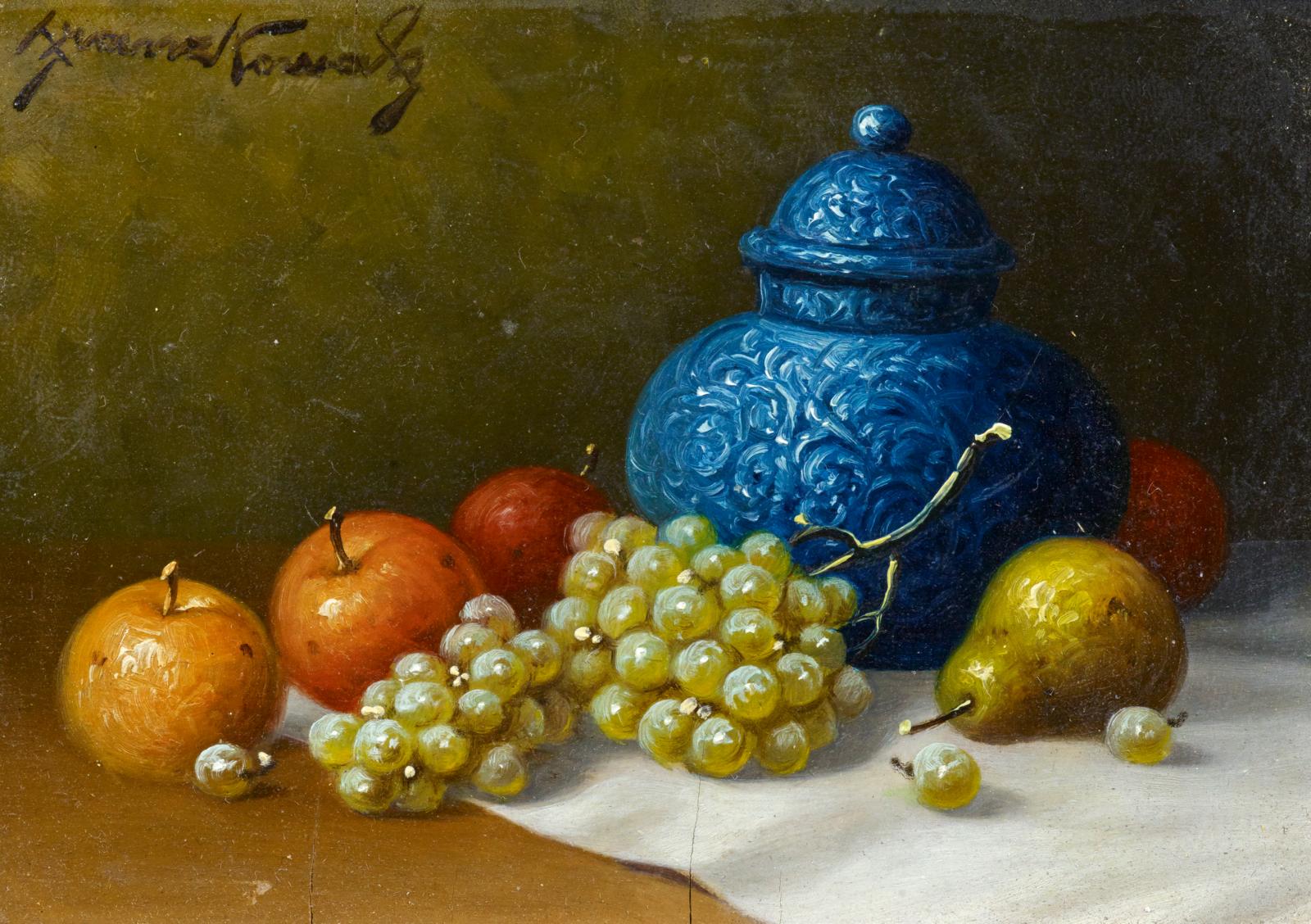Titel: Stillleben mit Weintrauben und Deckelkrug.