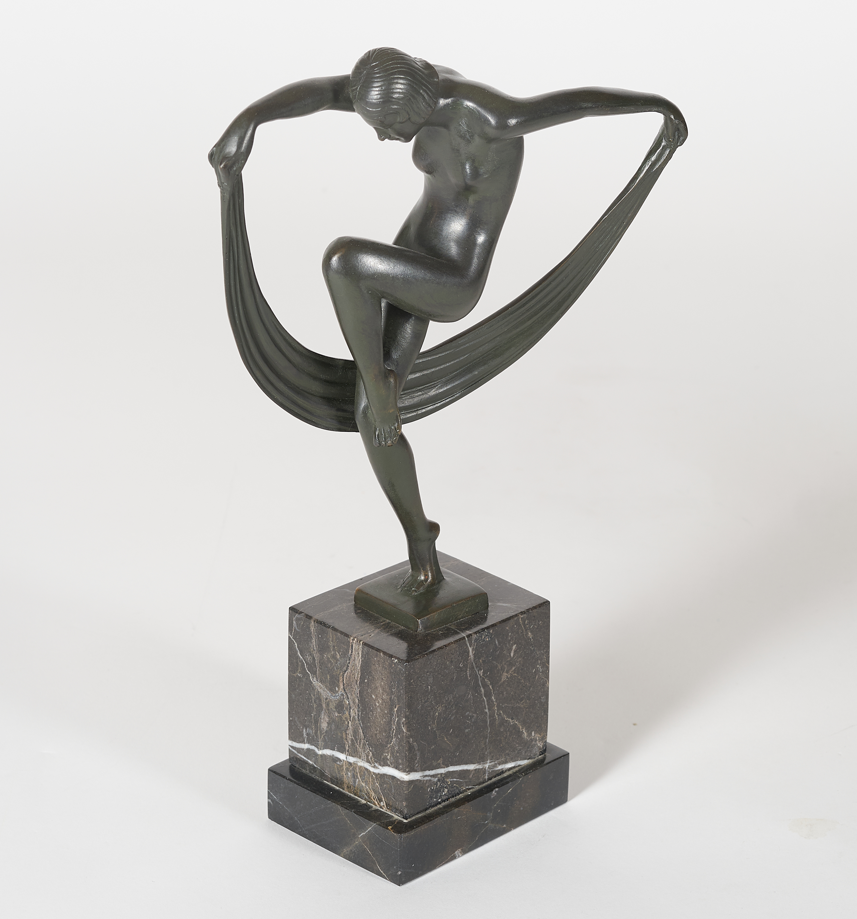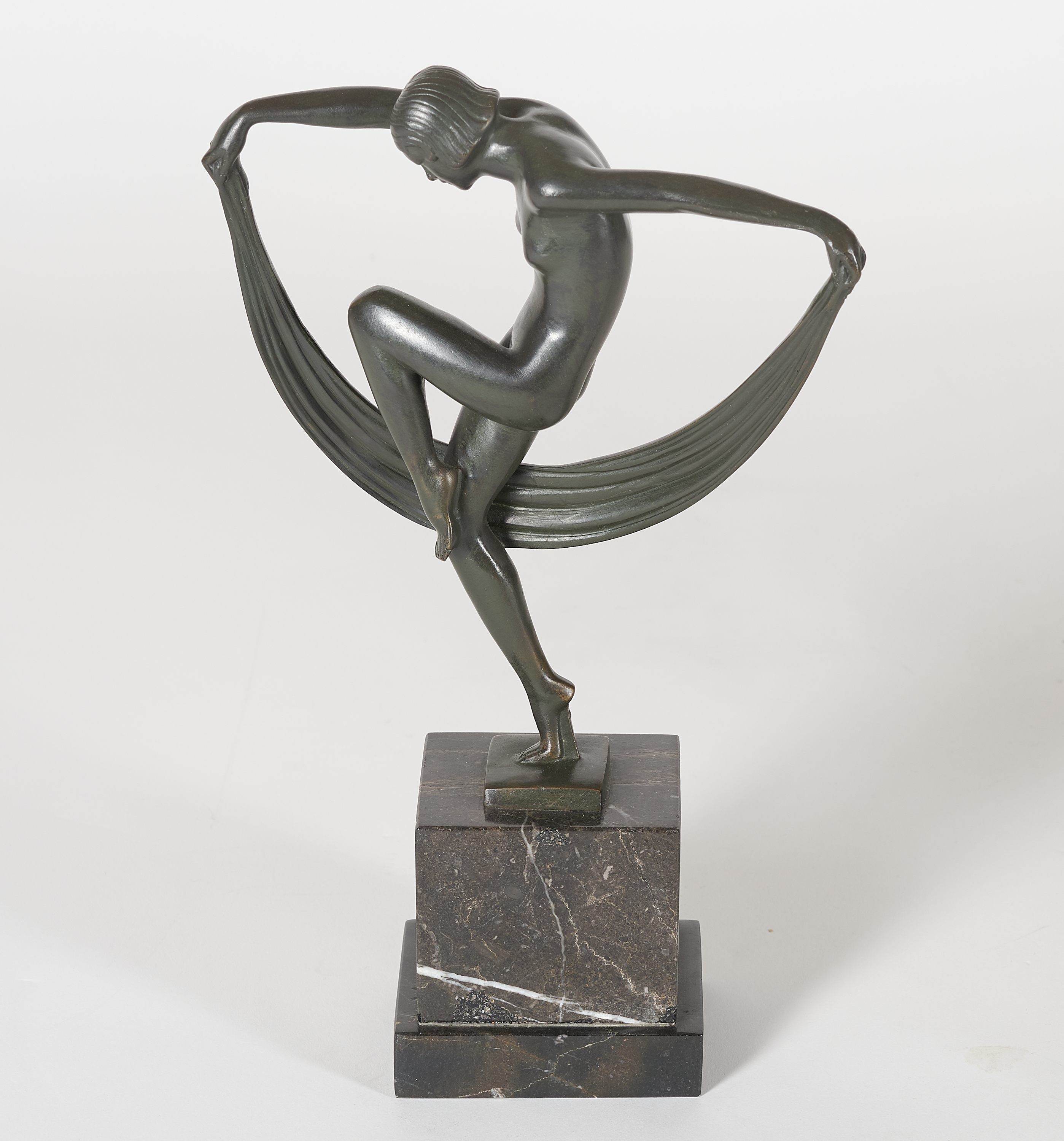 Leichte Bereibungen der Patina im Bereich der Füße, seitlich an den Oberarmen, der Plinthe. Reste eines alten Etiketts an der Unterseite des Sockels. Ansonsten befindet sich die Skulptur in einem sehr guten Zustand.