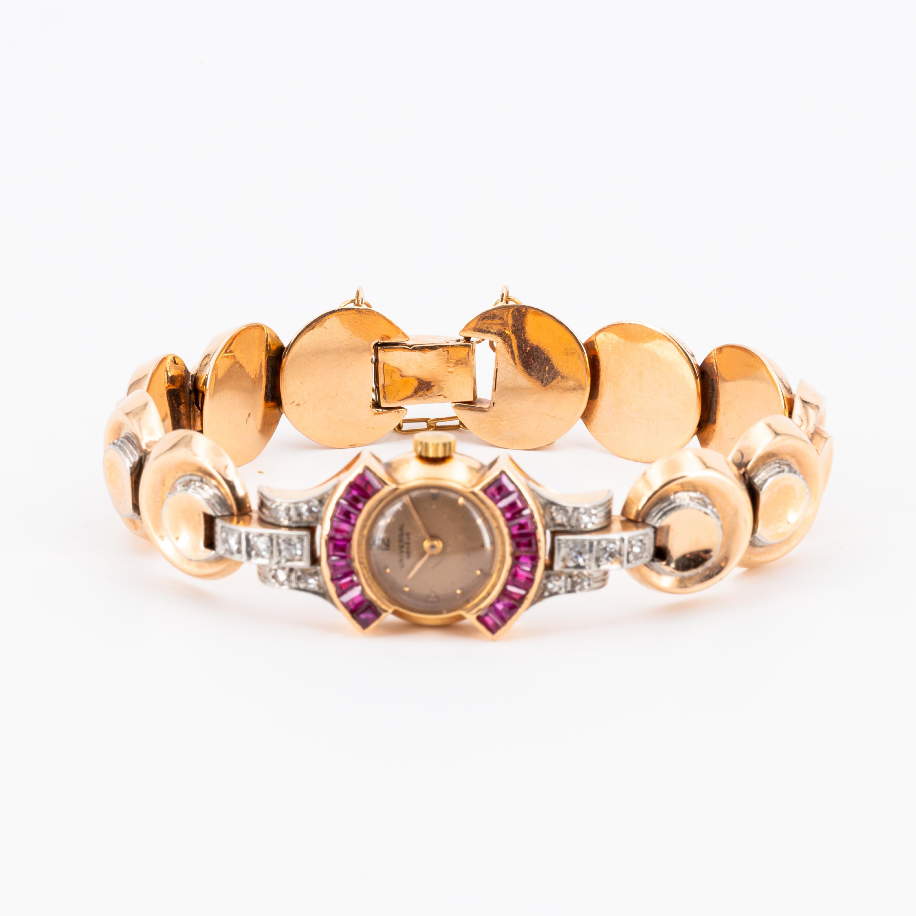 Gehäuse/Armband: 750/- Roségold, Rubin-Lünette besetzt mit 18 Rubinkarrees zus. ca. 1,2 ct., 38 Diamanten im Achtkant-Schliff zus. ca. 0,9 ct, Gliederarmband mit Kastenschließe, Zifferblatt, Zeiger und Indizes roségol.