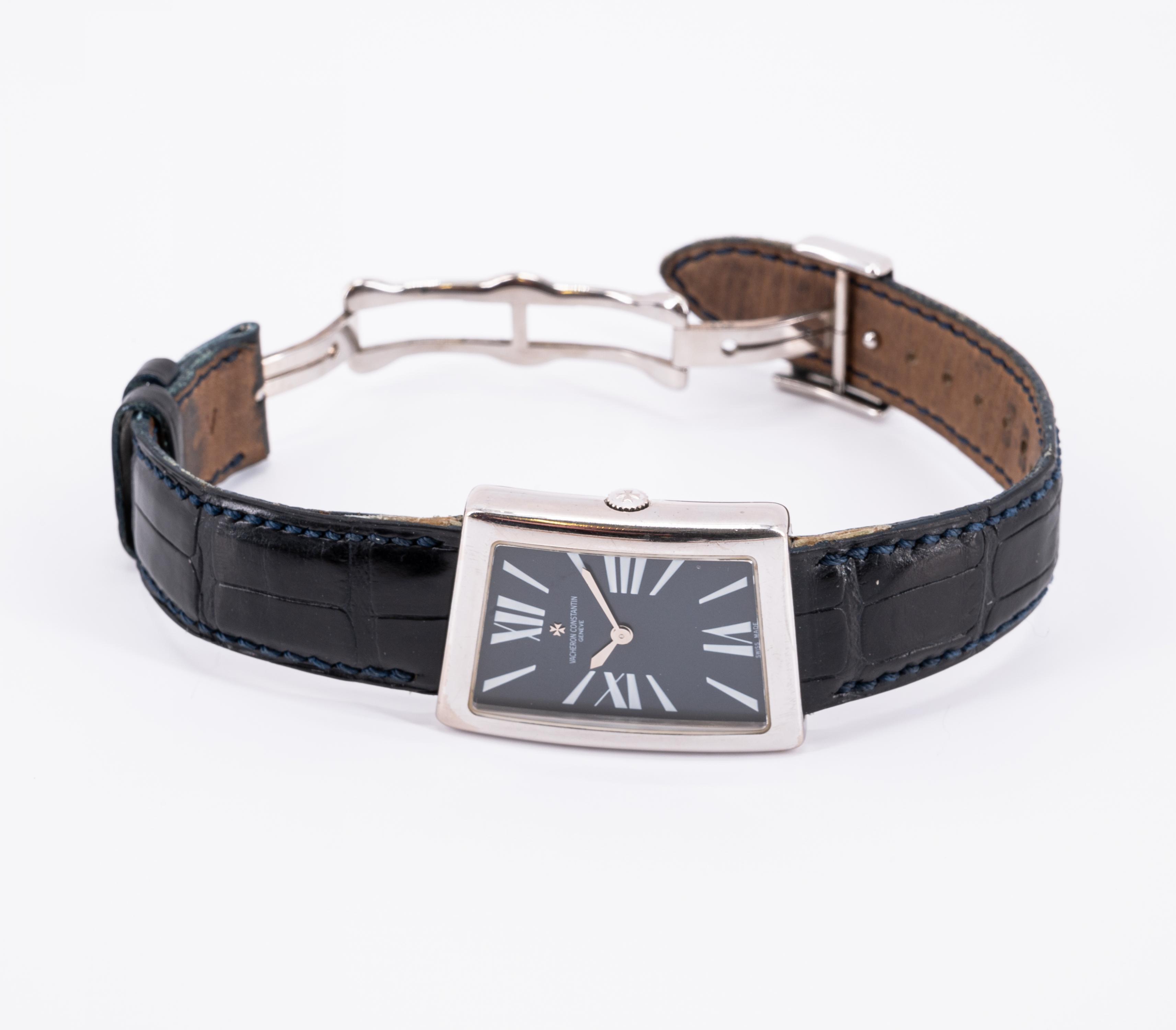 Gehäuse/Armband: 750/- Weißgold, Lederarmband mit Faltschließe, Zffbl. dunkelblau, Zeiger schwarz, Indizes weiß.