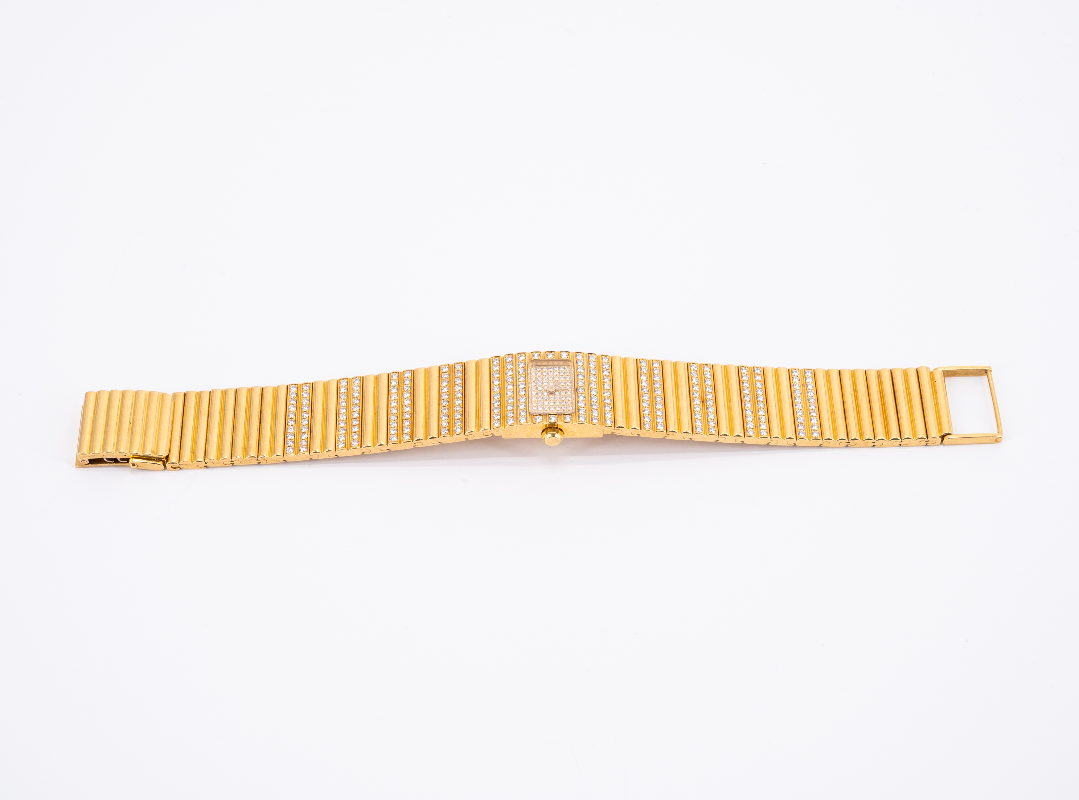 Gehäuse/Armband: 750/- Gelbgold, Diamantbesatz, ca. 312 winzige Brillanten zus. ca. 2,9 ct., sehr gute Qualität, Zffbl. paveé ausgefasst, Zeiger golden.