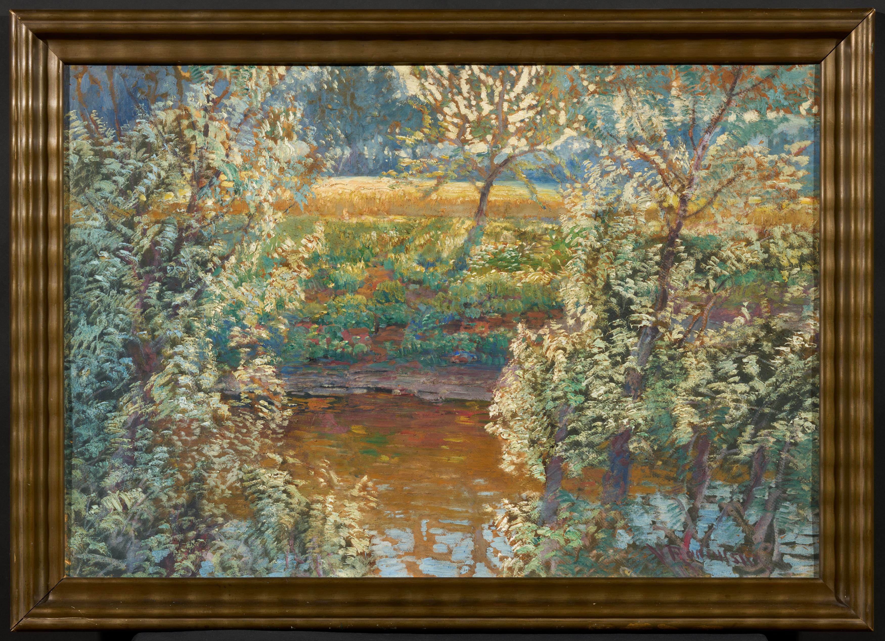 Das vorliegende Gemälde zählt zu den für Radimský charakteristischen Flusslandschaften. Es bezeugt dieses besondere Interesse der Wiedergabe einer stimmungsvollen Naturdarstellung, die durch ihre Reinheit und Unberührtheit besticht. Der luftig lockere Farbauftrag verleiht dem Gemälde einen schillernden und atemberaubenden Charakter. Es spiegelt die grenzenlos experimentierfreudige Erforschung von Farbe, Schatten und Licht im Trialog wider. Hierdurch verfügt es über zahlreiche Gemeinsamkeiten mit Claude Monets prominenten Darstellung der "Japanischen Brücke", die sich heute in der National Gallery in London befindet. Dem internationalen Impressionismus verpflichtet, zeigt Radmiský, was sich zwischen dem Objekt und dem Künstler befindet: nämlich die farbenfrohe Stille einer so ursprünglichen Schönheit - die der Atmosphäre.