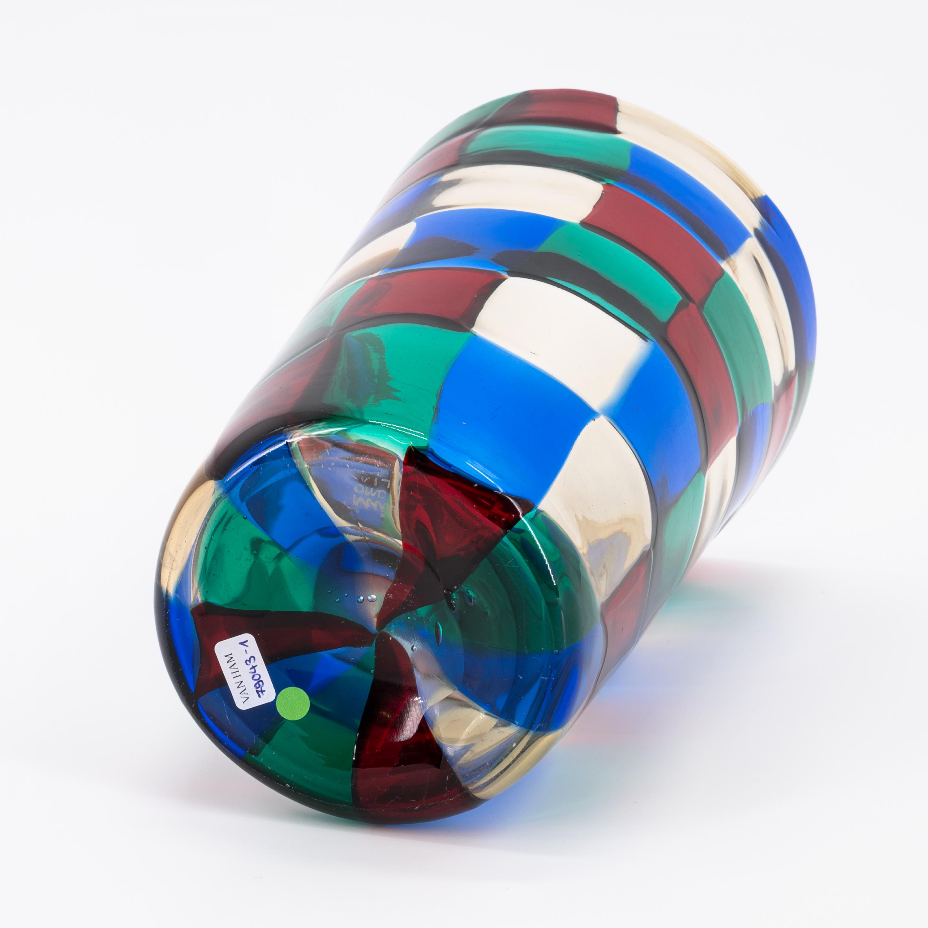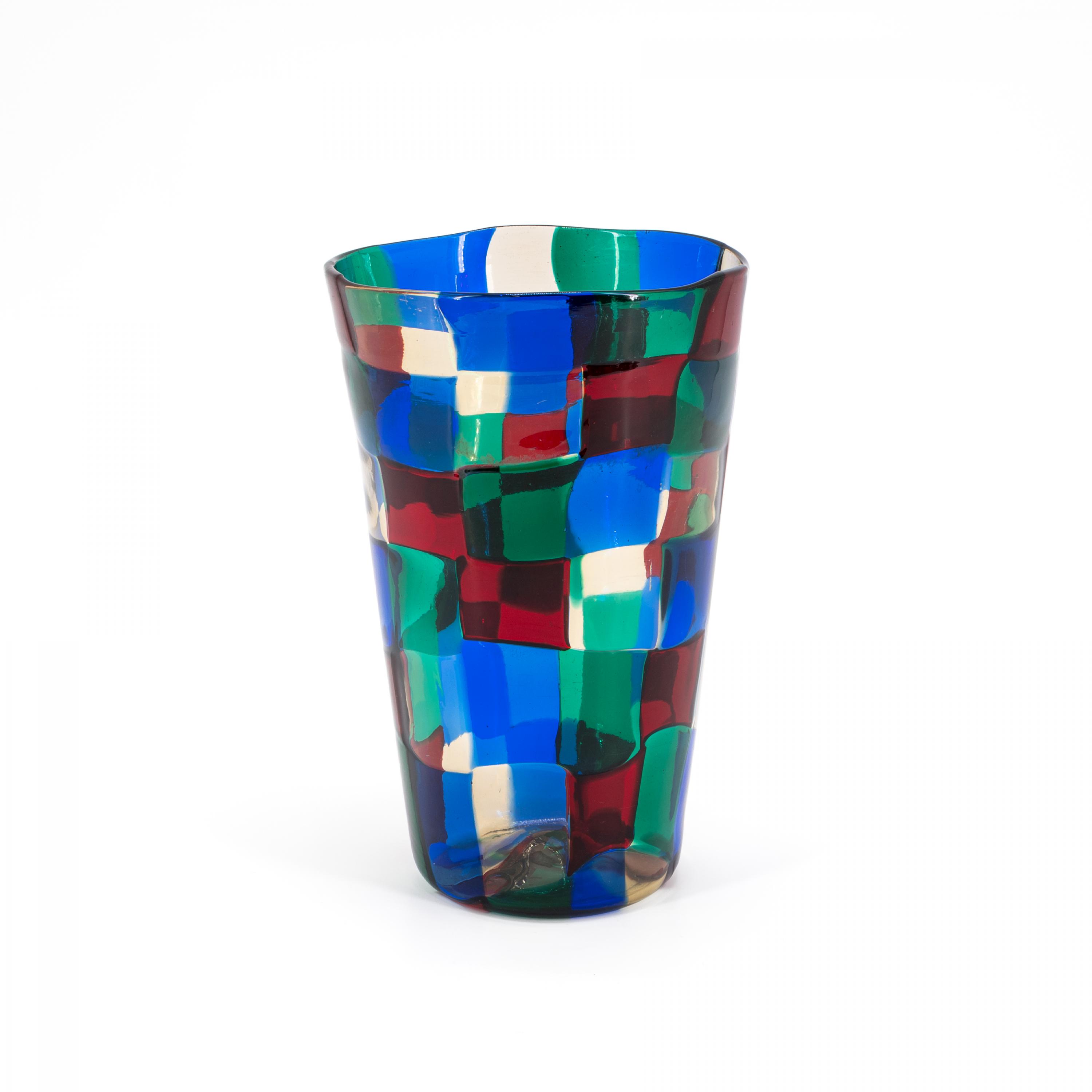 Technik: Farbloses Glas mit aufgeschmolzenen Rechtecken in Blau, Rot und Grün.