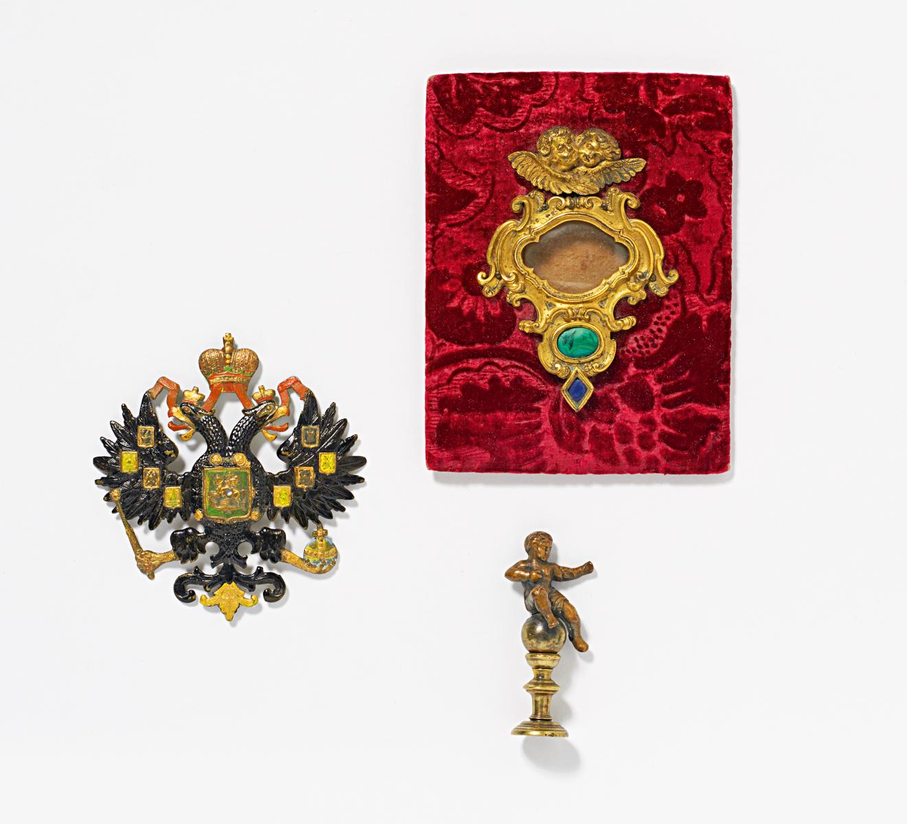 Technik: Messing, Metall, Bronze, tlw. fabig und/oder gold gefasst. Holz, mit Samt bezogen.