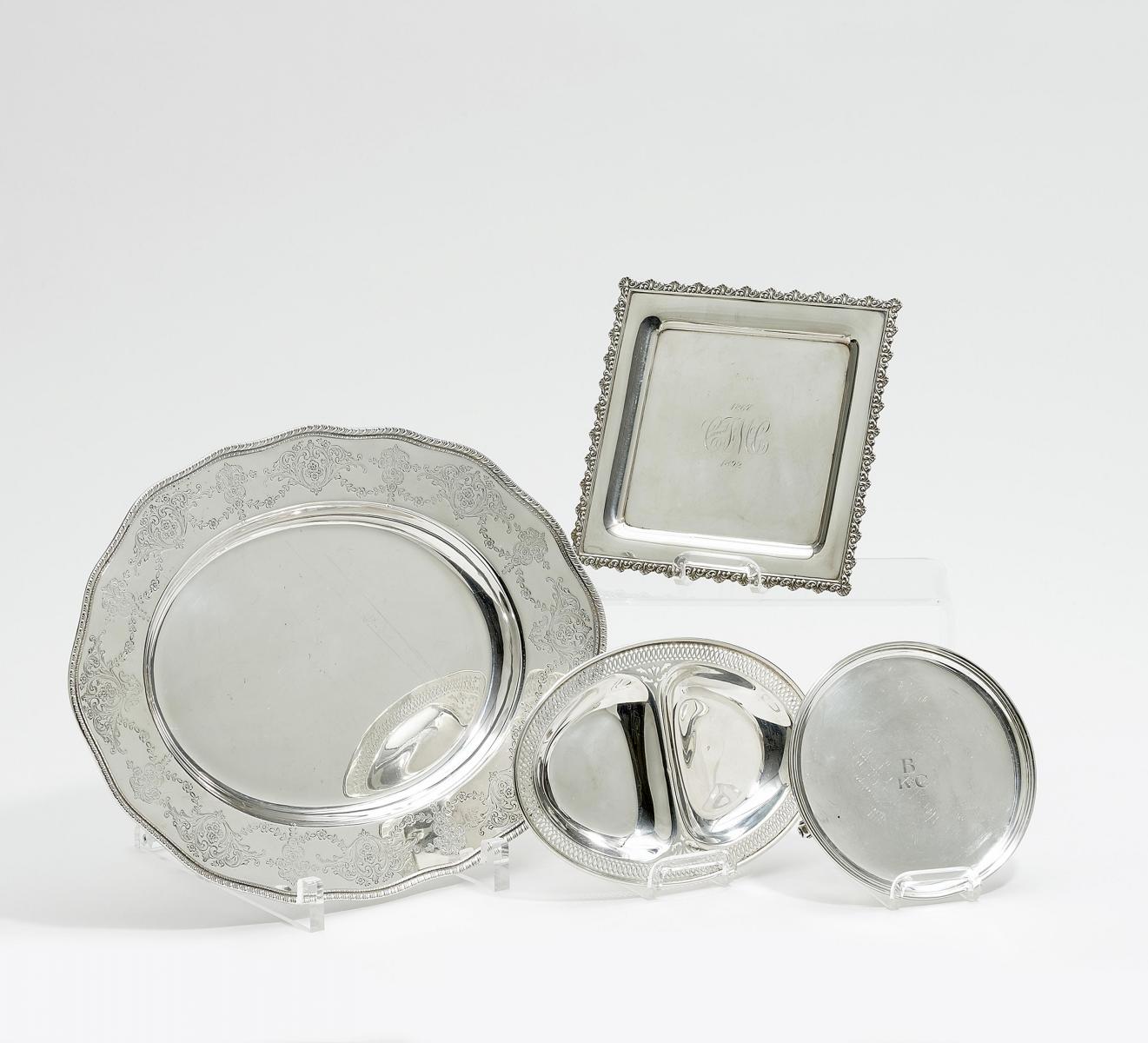 KONVOLUT OVALE SERVIERPLATTE, OVALES ANBIETSCHÄLCHEN, QUADRATISCHES TABLETT UND SALVER.