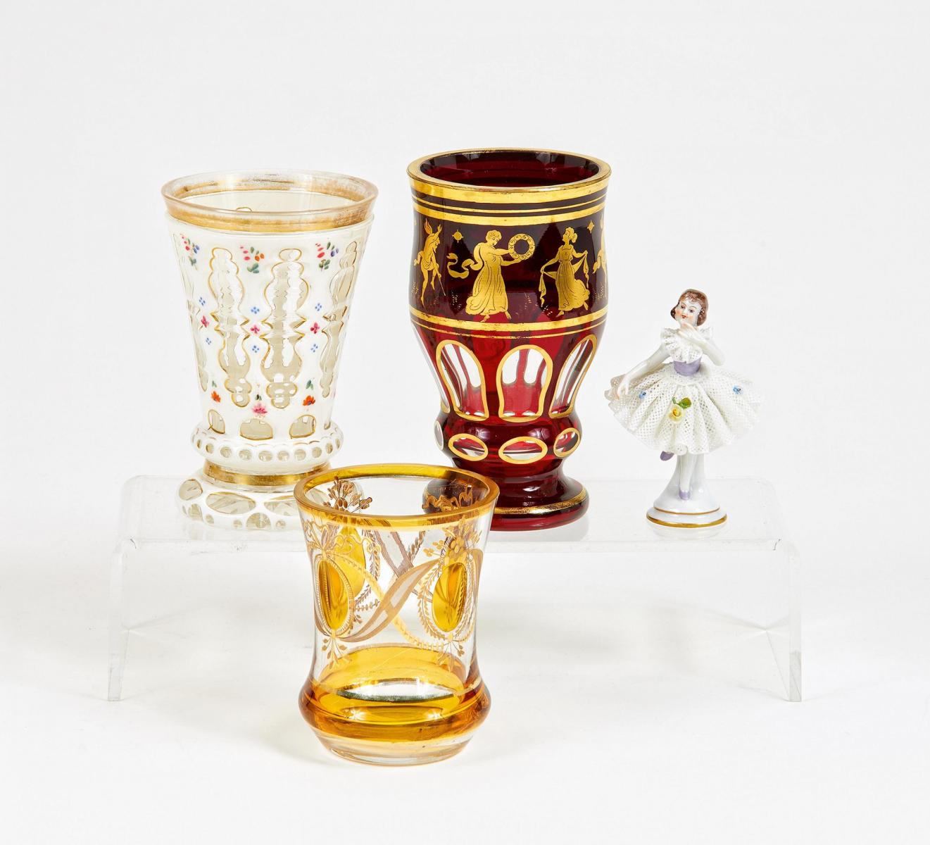 Beschreibung: Best. aus: Tasse mit UT, asiatisch, 3 versch. Gläser, kleine Porzellan Tänzerin.