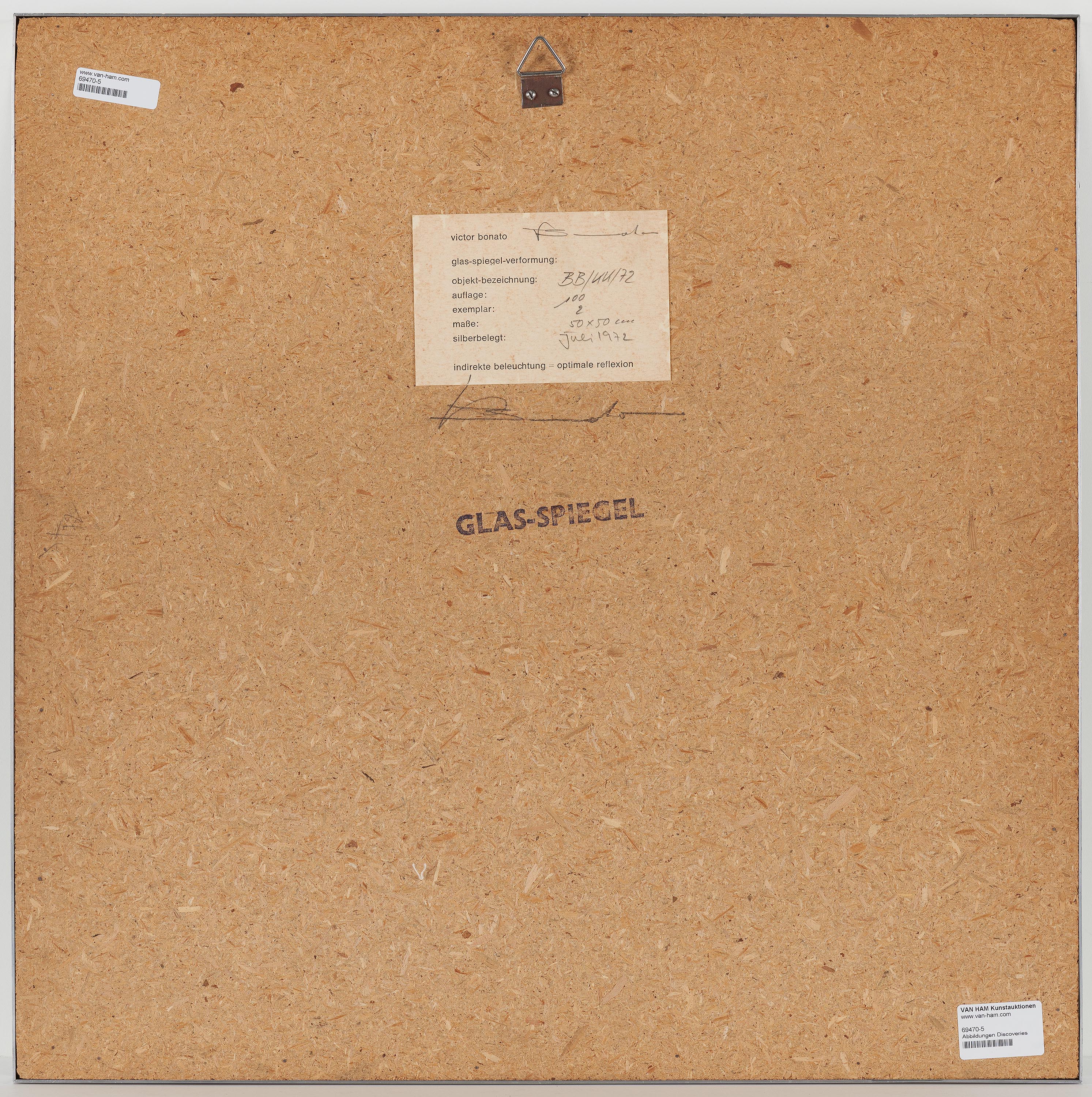 Bezeichnung: Signiert verso: Bonato. Darüber auf Editionsetikett bezeichnet, nummeriert und datiert: BB/KK/72 100 2 50 x 50cm juli 1972. Sowie gestempelt: GLAS-SPIEGEL.