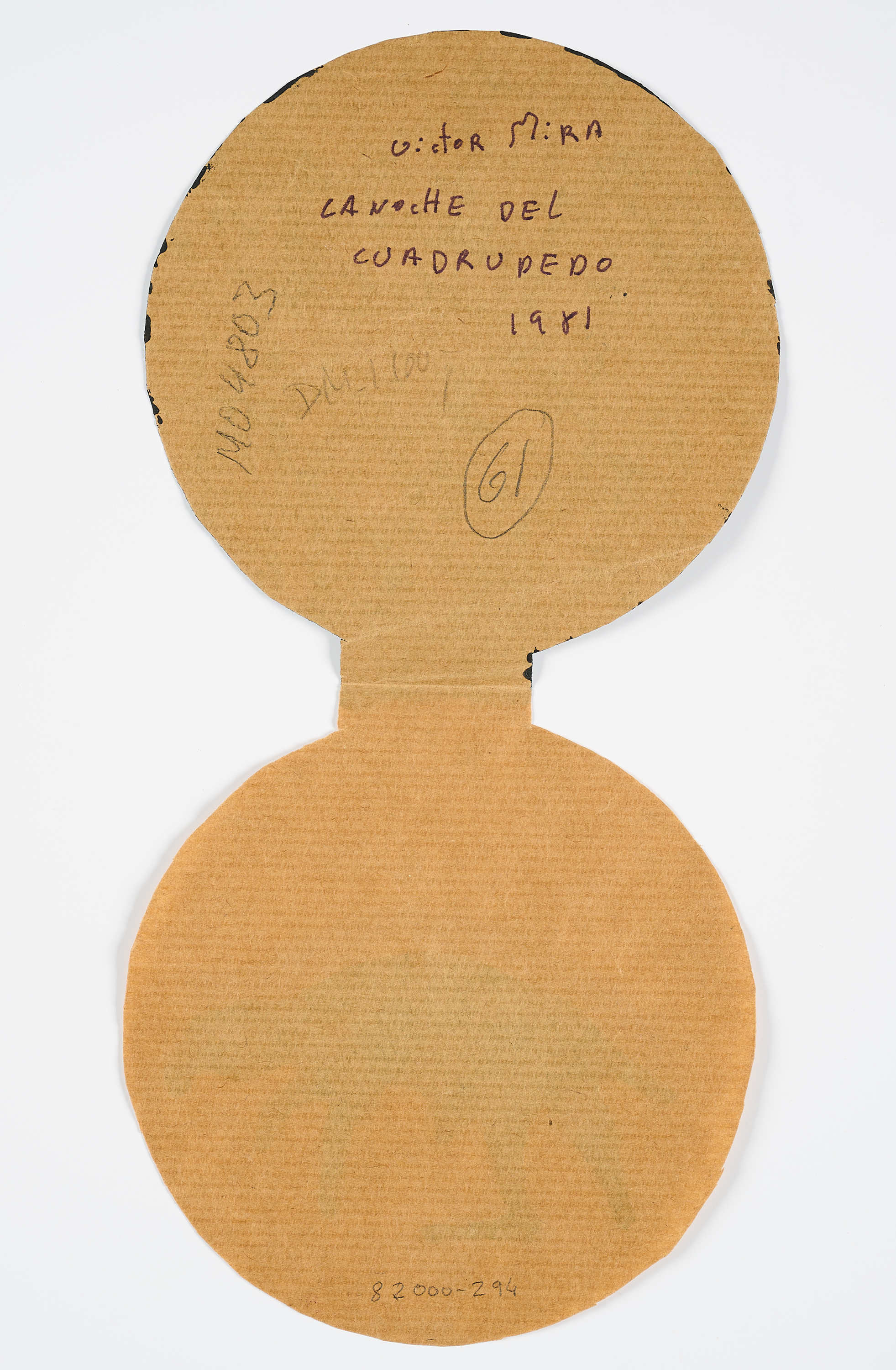 Bezeichnung: Signiert unten mittig: MiRA. Signiert, betitelt und datiert auf der Innenseite unten: VictoR MiRA. LA NOCHE DEL CUADRUPEDO 1981. Hier zudem Bleistiftbezeichnungen von fremder Hand.