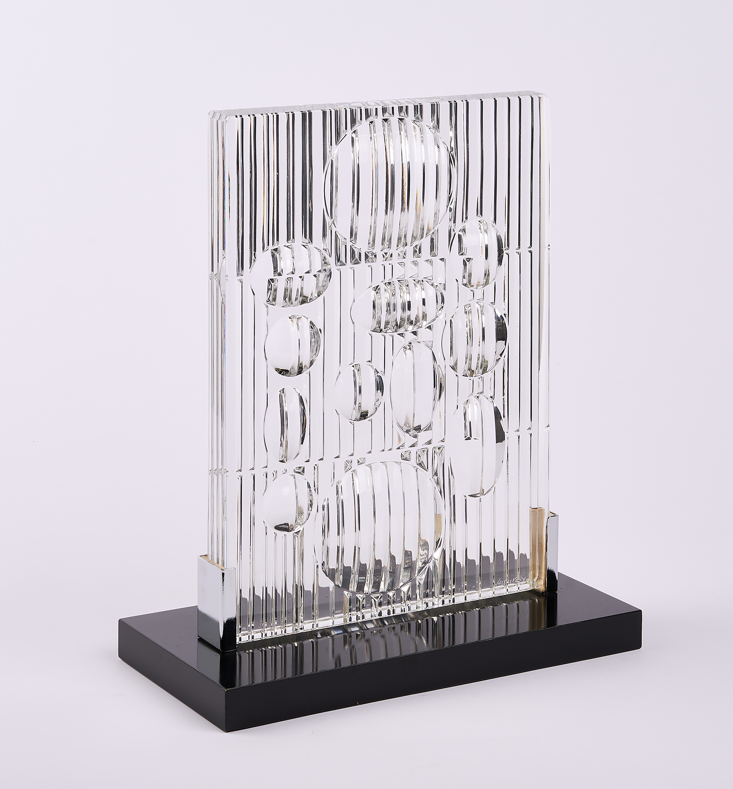 Technik: Glas, geschliffen, auf schwarzer Holzplatte.