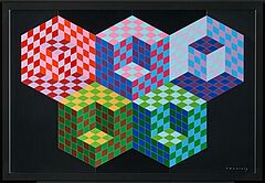 Maße: 100 x 150 x Bezeichnung: Signiert unten rechts: Vasarely. Betitelt und signiert verso unten links: OLIMPIA Vasarely. Zudem mit Maßangaben versehen.
