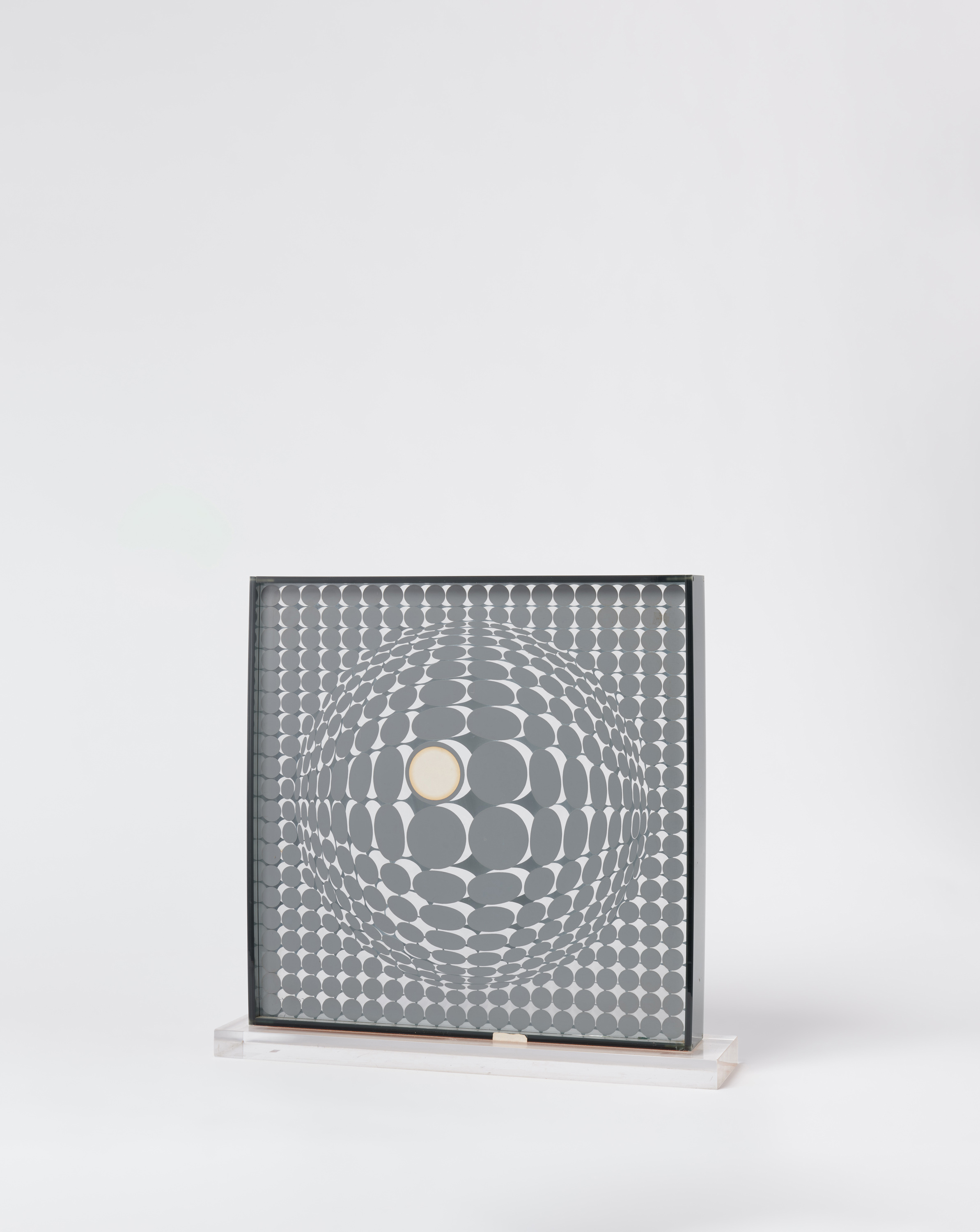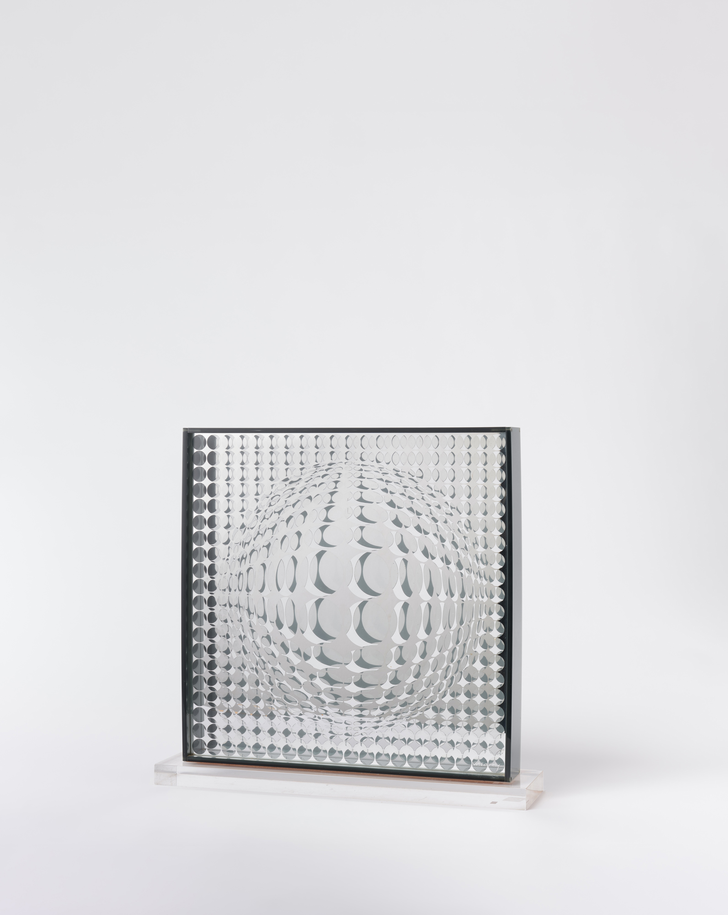 Technik: Farbserigrafie auf Acrylglas über Farbserigrafie auf Acrylglas in Metallrahmen auf Acrylglassockel.