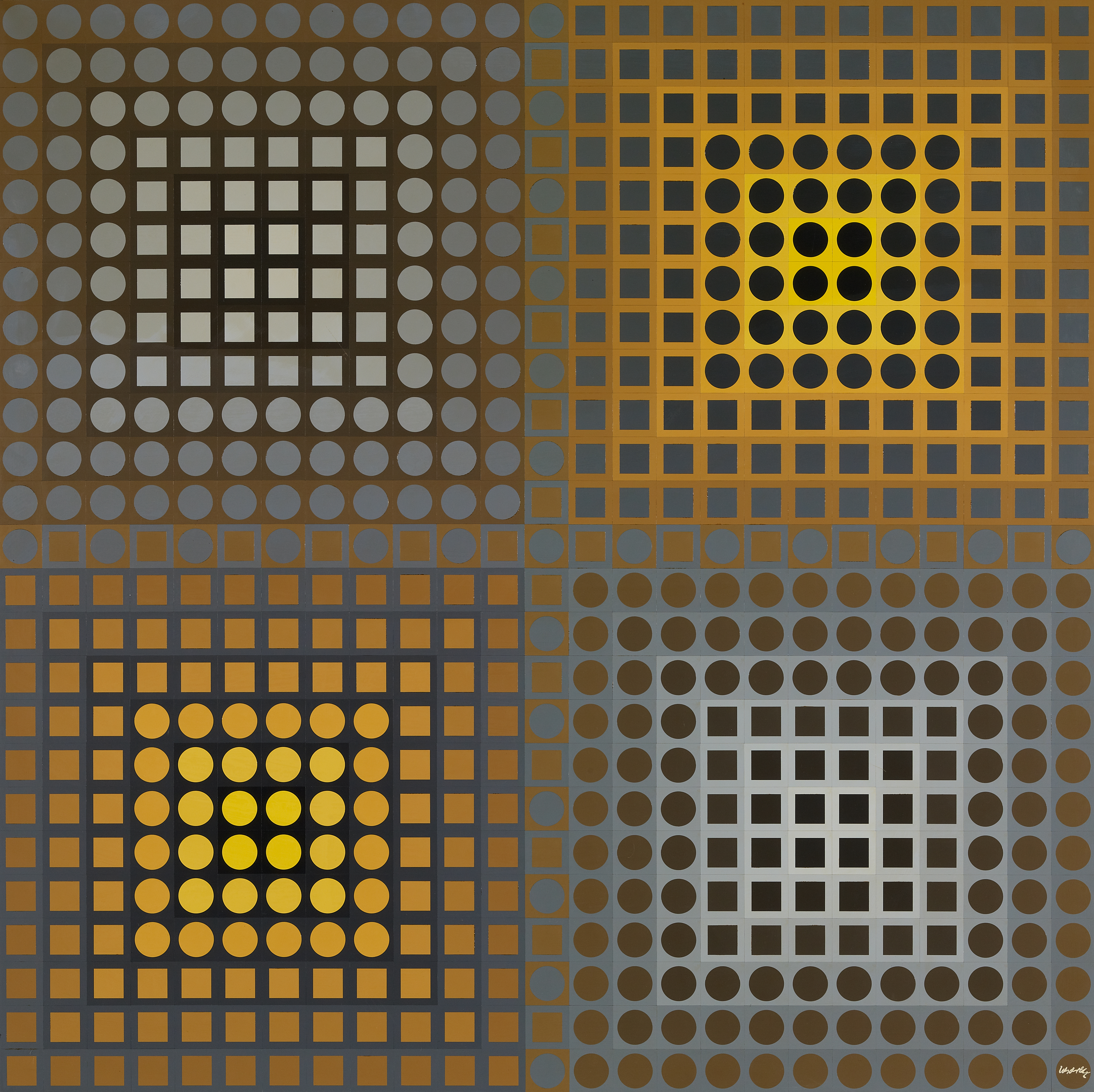 1906 Pécs/Ungarn - 1997 ParisEG-1-2 Yellow/ Grey Neg. BASF Luran auf Aluminium. 100 x 100cm. Signiert unten rechts: Vasarely. Nochmals signiert
