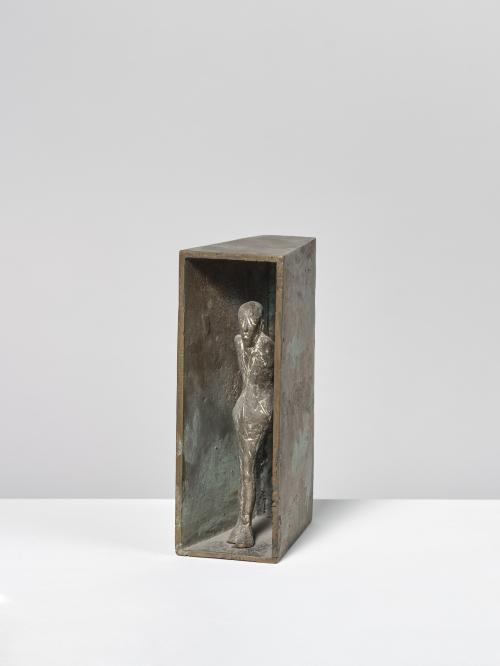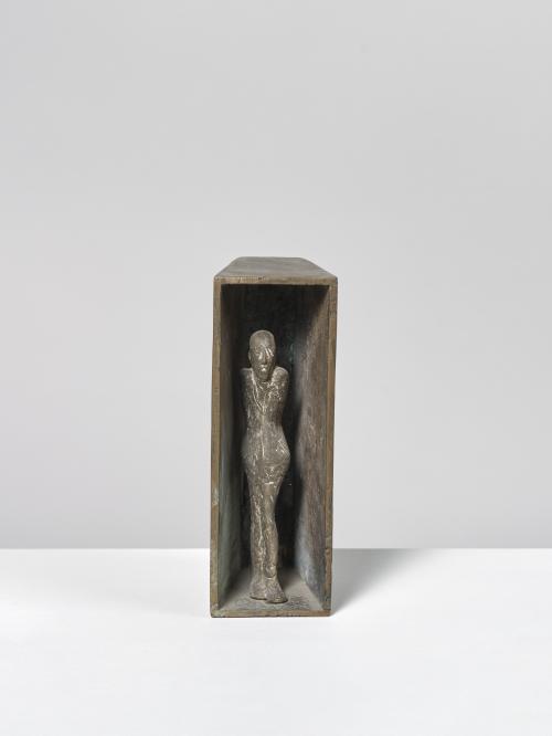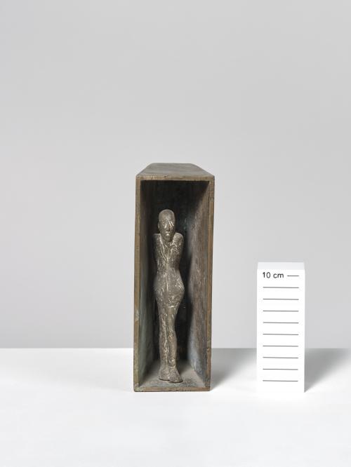 In den 1970er Jahren erarbeitet Waldemar Otto einen neuen Themenkomplex: die Figur im Raum. Das vorliegende Werk zeigt eine kleine männliche Figur umgeben von einem massiven Kasten. Reflektiert wird damit die existenzielle Verfasstheit des Menschen im Kontrast der ihm innewohnenden Ängste und äußerer Bedrohungen.