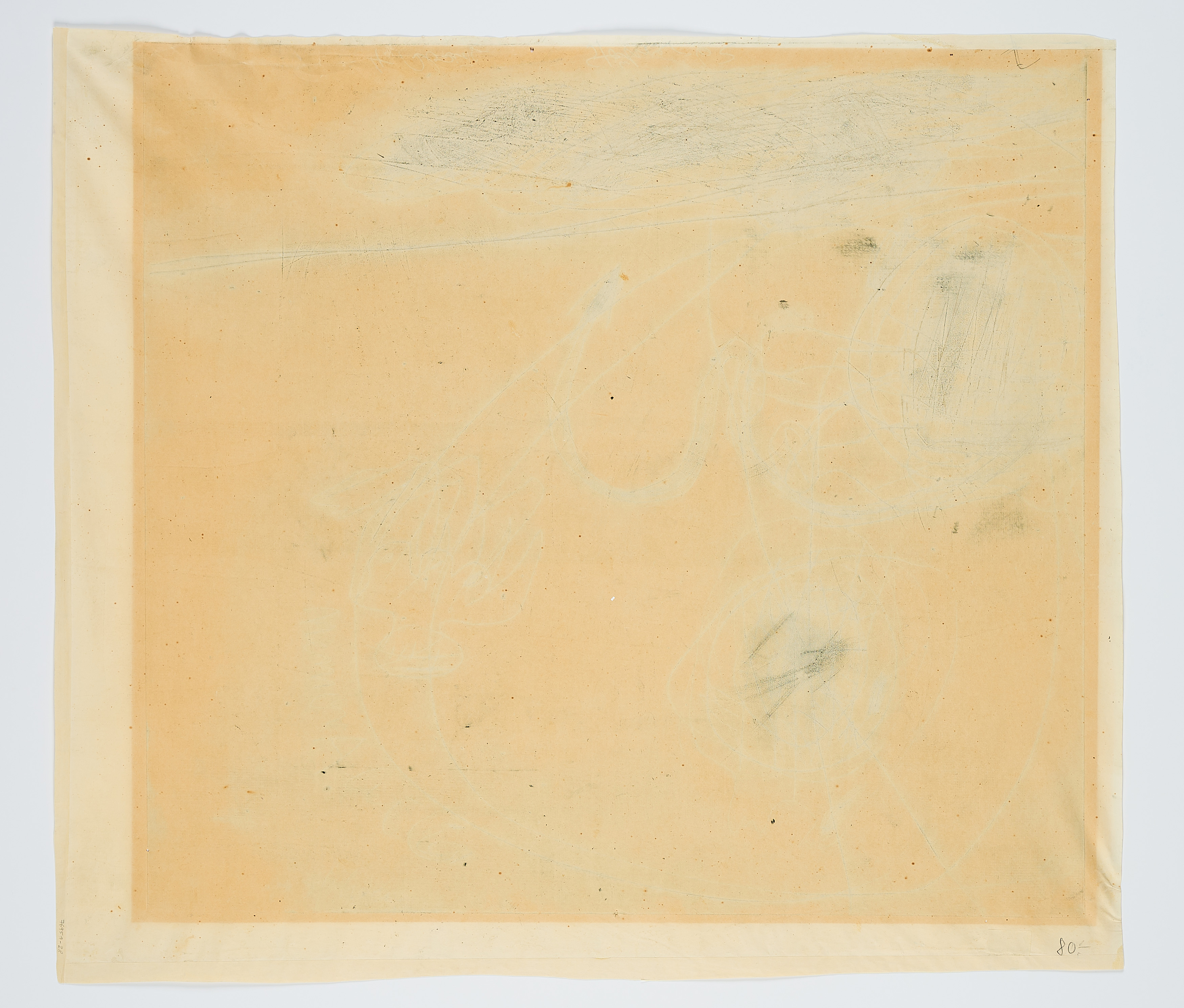 Wohl Kanten beschnitten. Im ehemaligen Passepartoutausschnitt gebräunt. Vereinzelt leichter Silberfischfraß, teilweise dadurch Löcher (von ca. 0,1 x 0,1cm bis ca. 0,1 x 0,3cm). Vereinzelt leichte braune Flecken. Knickspuren am unteren Rand. Vereinzelt leichte Knickspuren in den Randbereichen. Leichte Fingerabdrücke oben links. Montierungsbedingt leicht gewellt. Verso leicht unregelmäßig und fleckig gebräunt