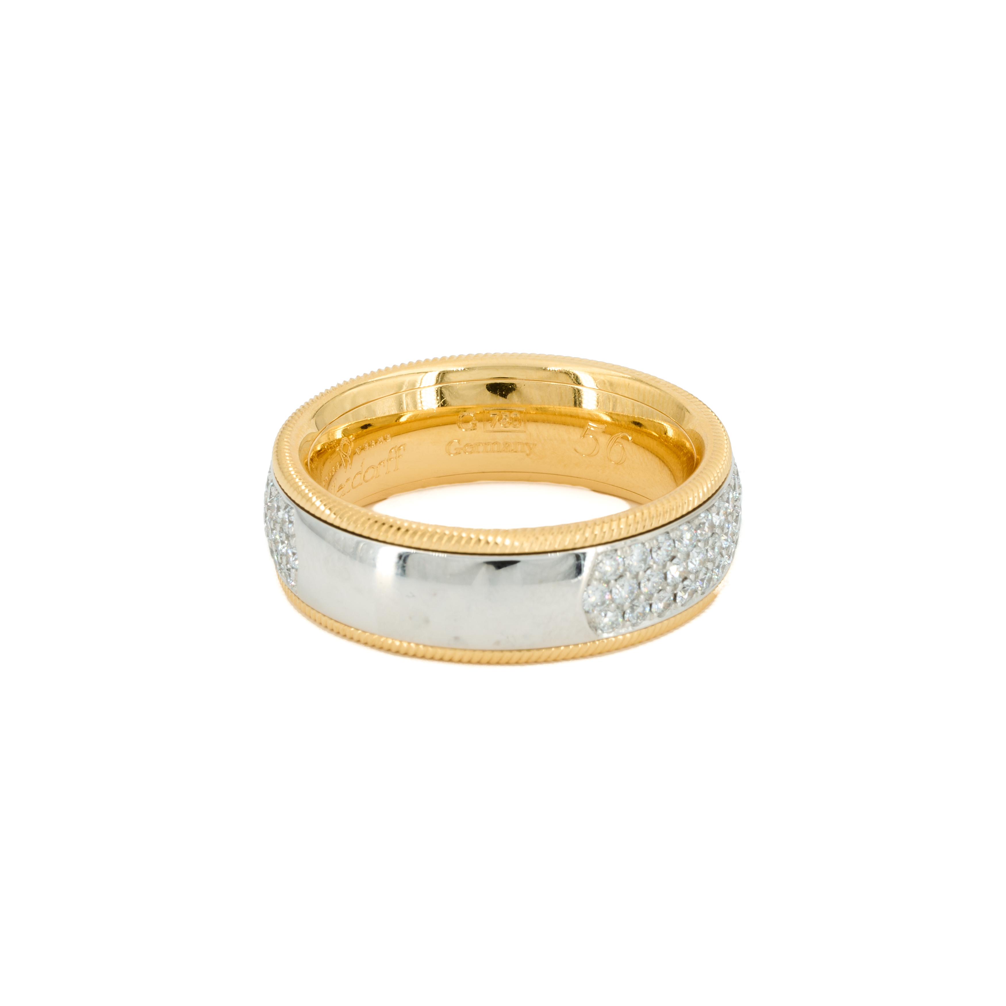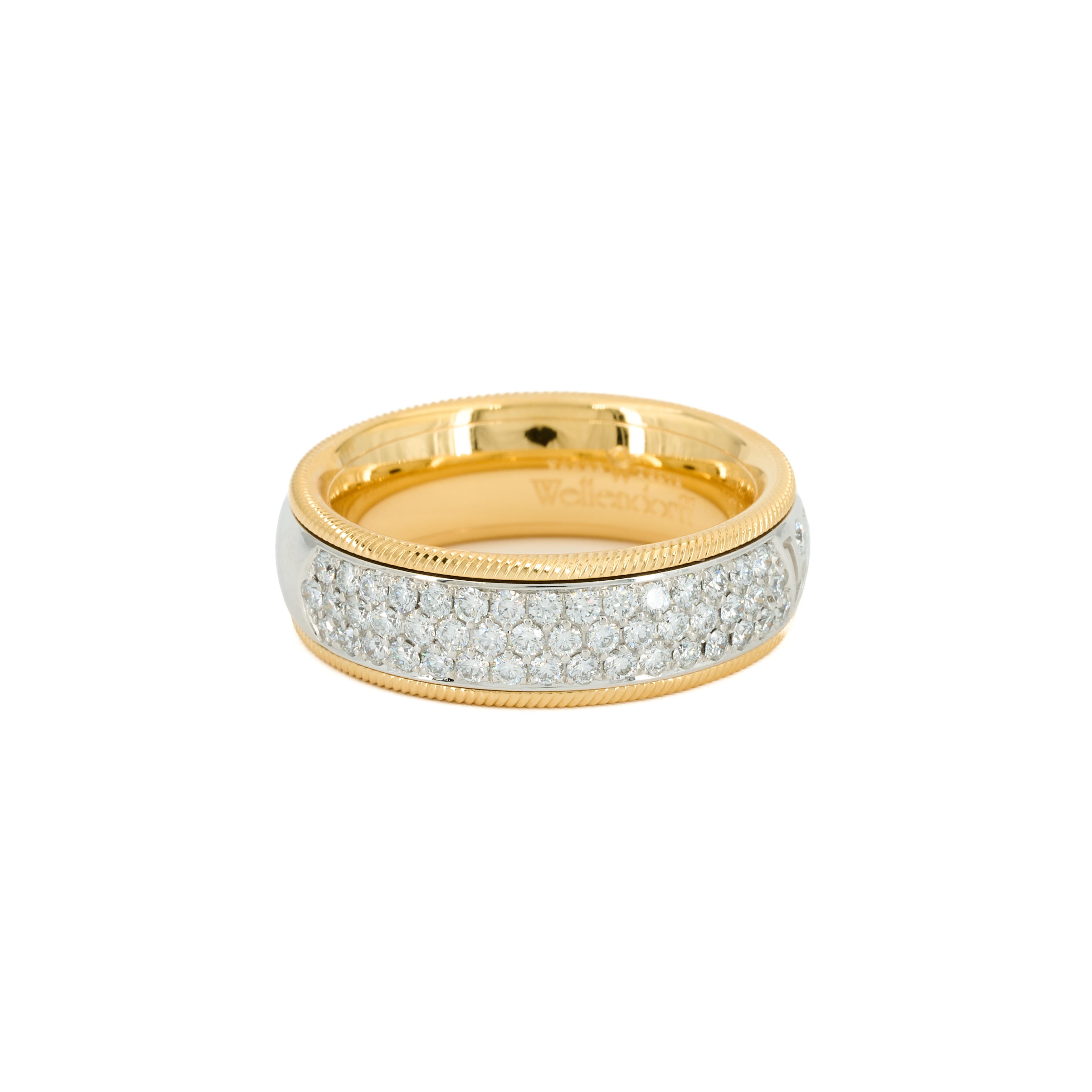 Beschreibung: Klassischer Wellendorff Ring, die bewegliche Schiene ist in Weißgold gearbeitet und zum größten Teil mit Diamanten besetzt. Die Innenschiene ist aus Gelbgold und zeigt einen Kordelrand. Signiert.