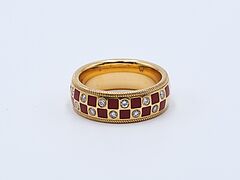 Material: 750/- Gelbgold, Punze, rotes transluzides Email.